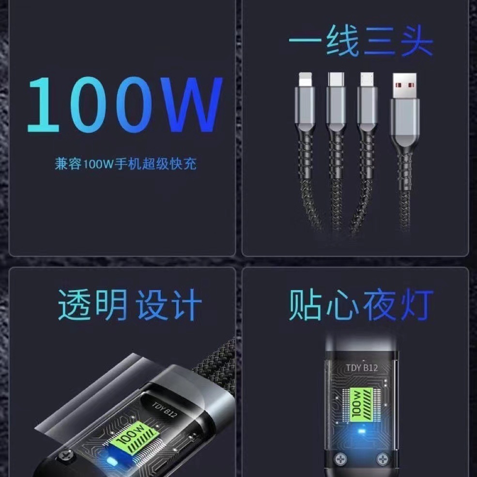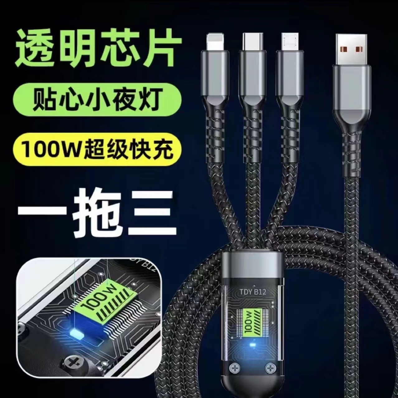 100W 휴대 전화 1 대 3 데이터 케이블 3 대 1 나일론 짠 투명 매체 카드 슈퍼 고속 충전 휴대 전화 충전 라인
