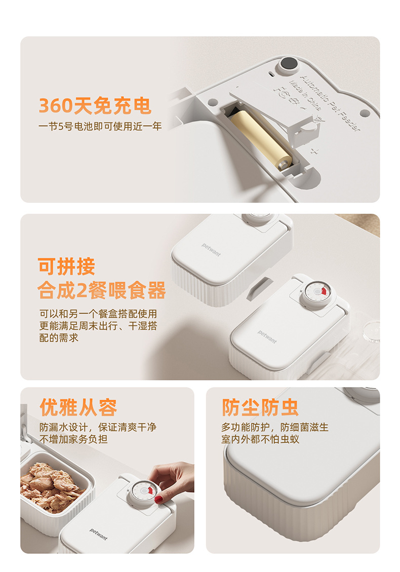 3.模块化组装---灵活拼接,两台可拼成双餐喂食器;