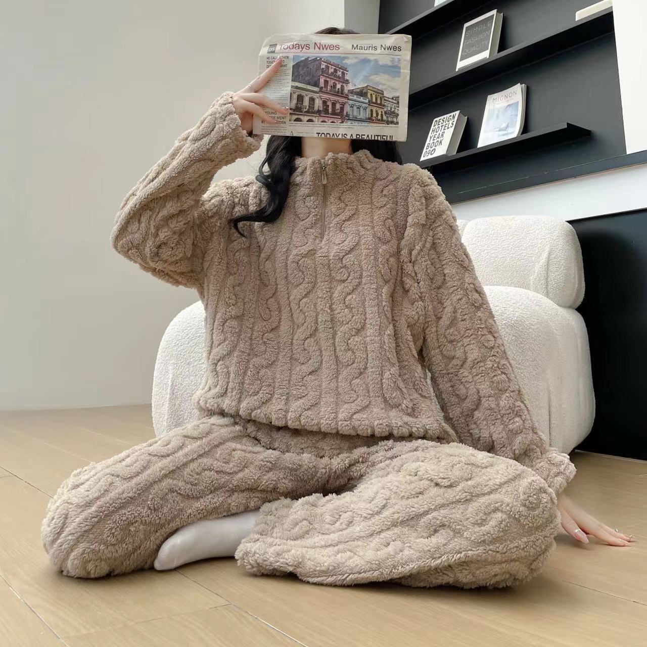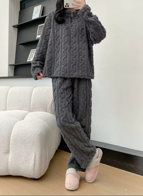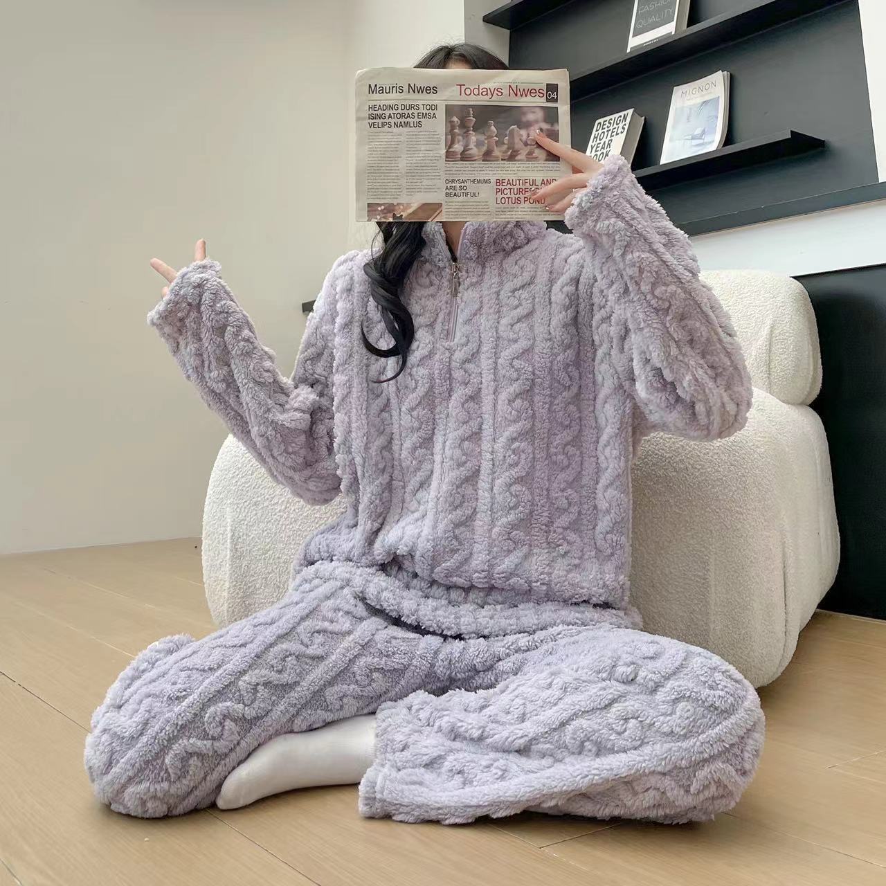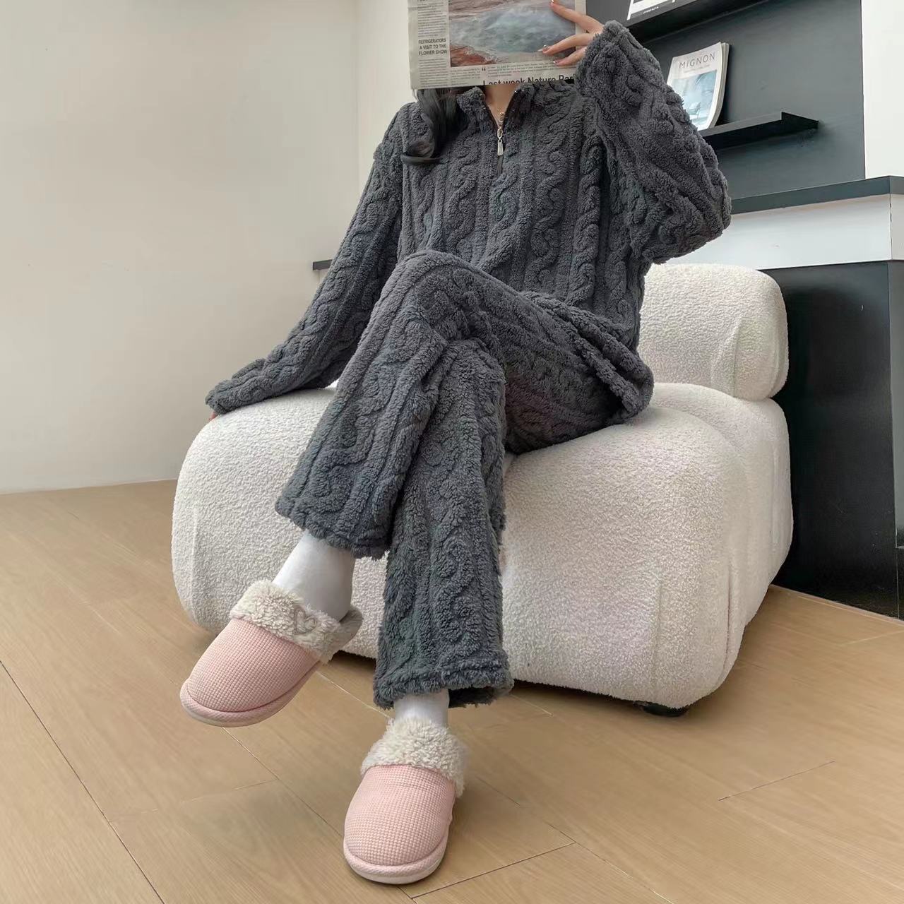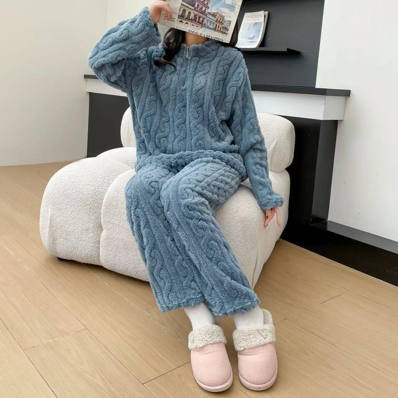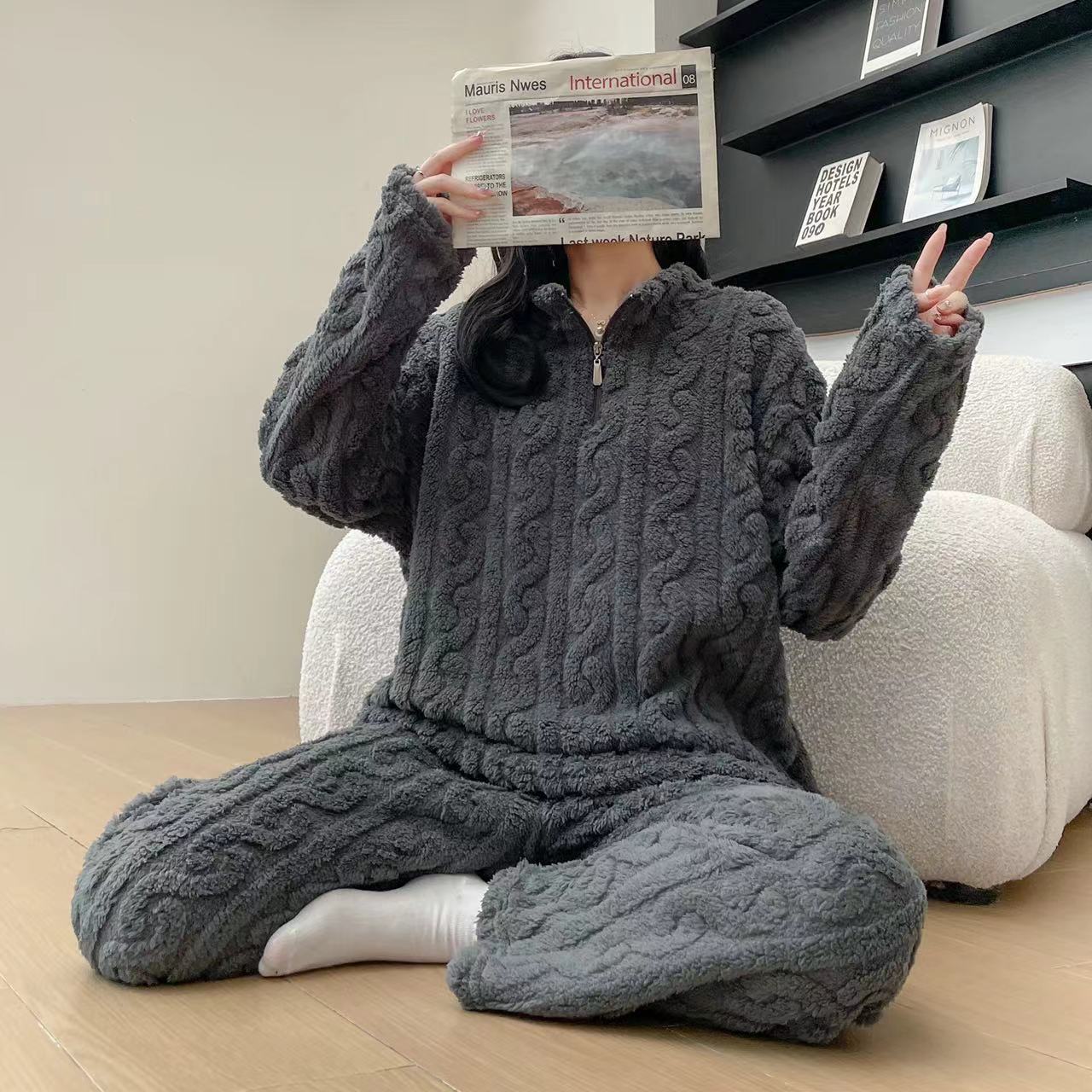 가을과 겨울 자카드 지퍼 플란넬 홈 의류 세트 기모 두껍게 된 외부 착용 지퍼 카디건 여성의 따뜻한 잠옷