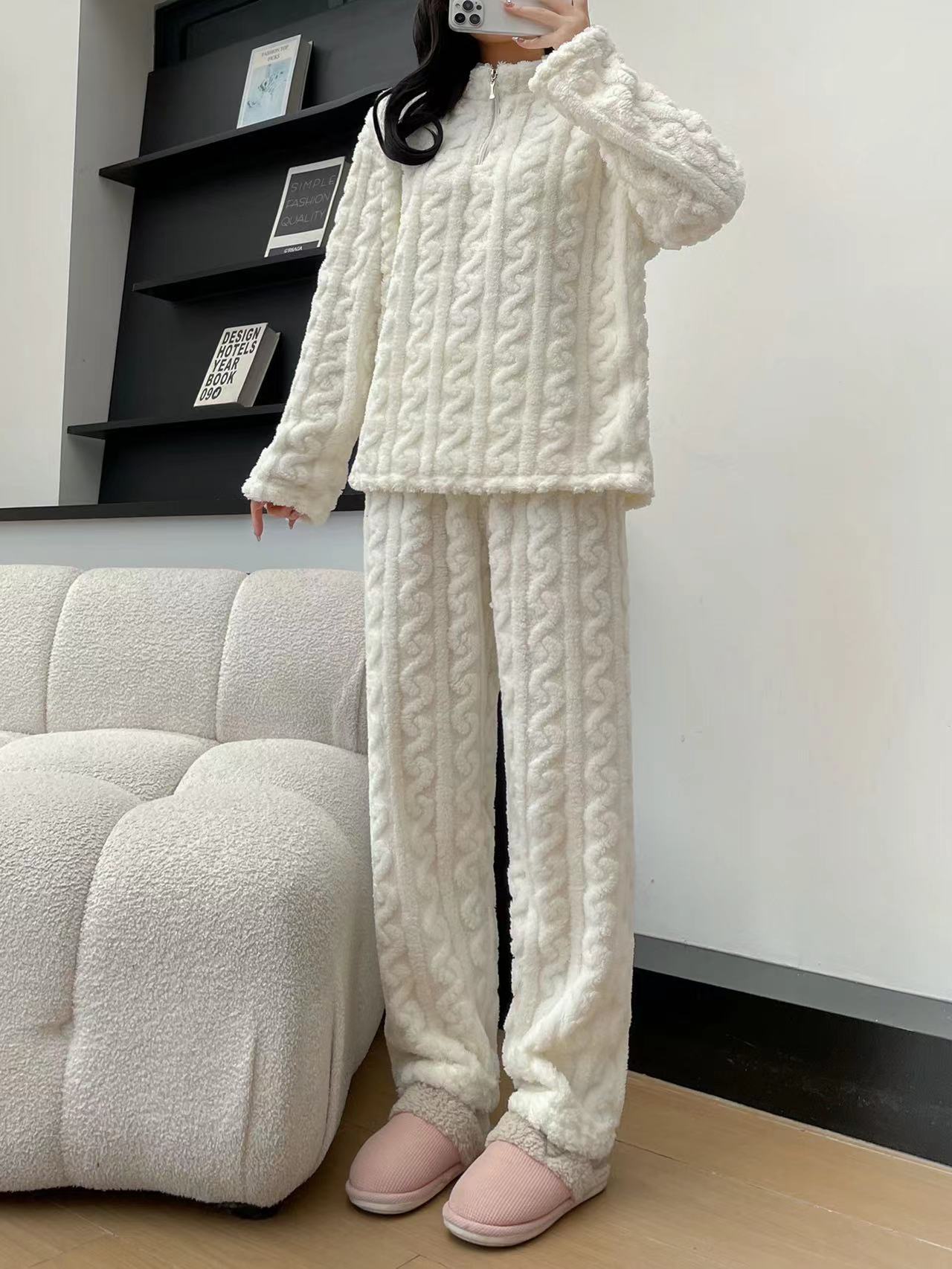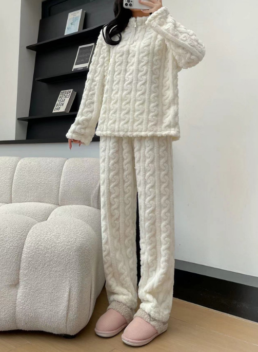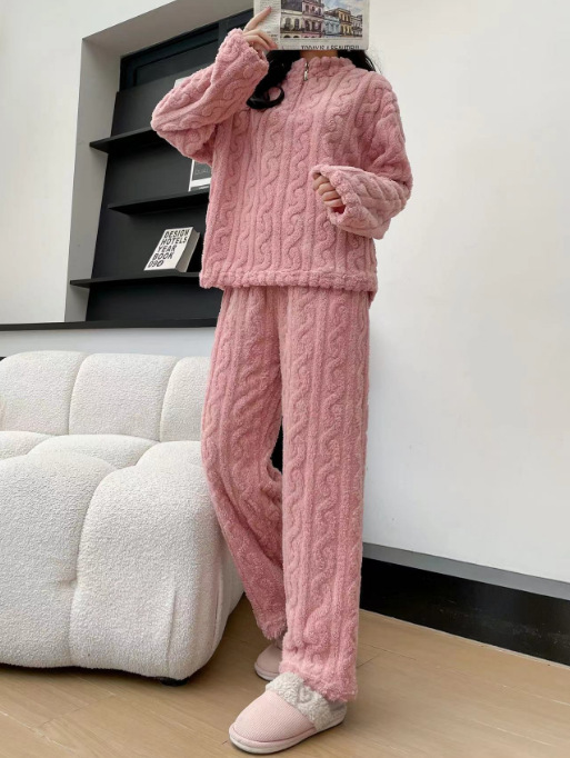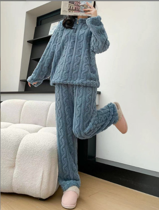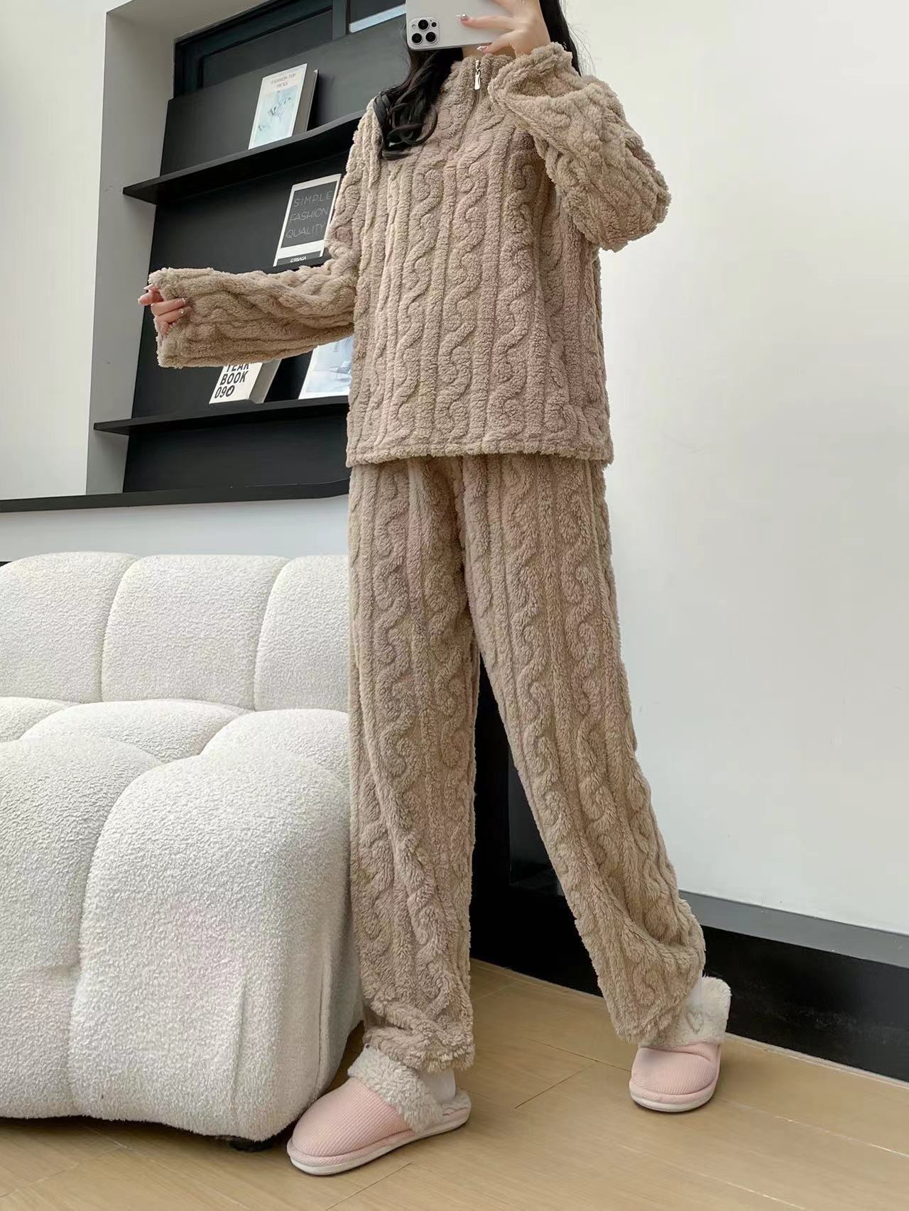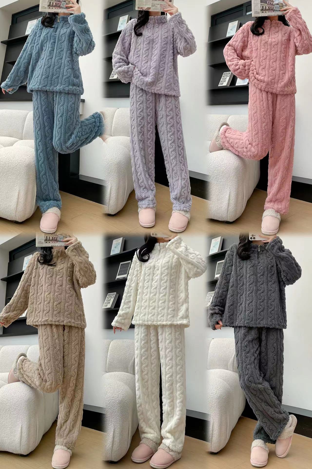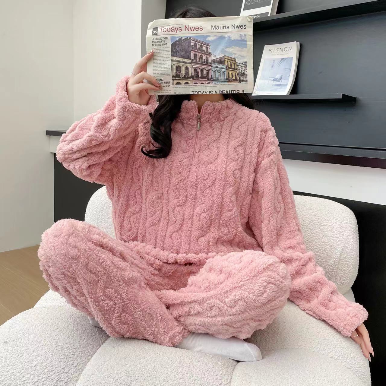 가을과 겨울 자카드 지퍼 플란넬 홈 의류 세트 기모 두껍게 된 외부 착용 지퍼 카디건 여성의 따뜻한 잠옷