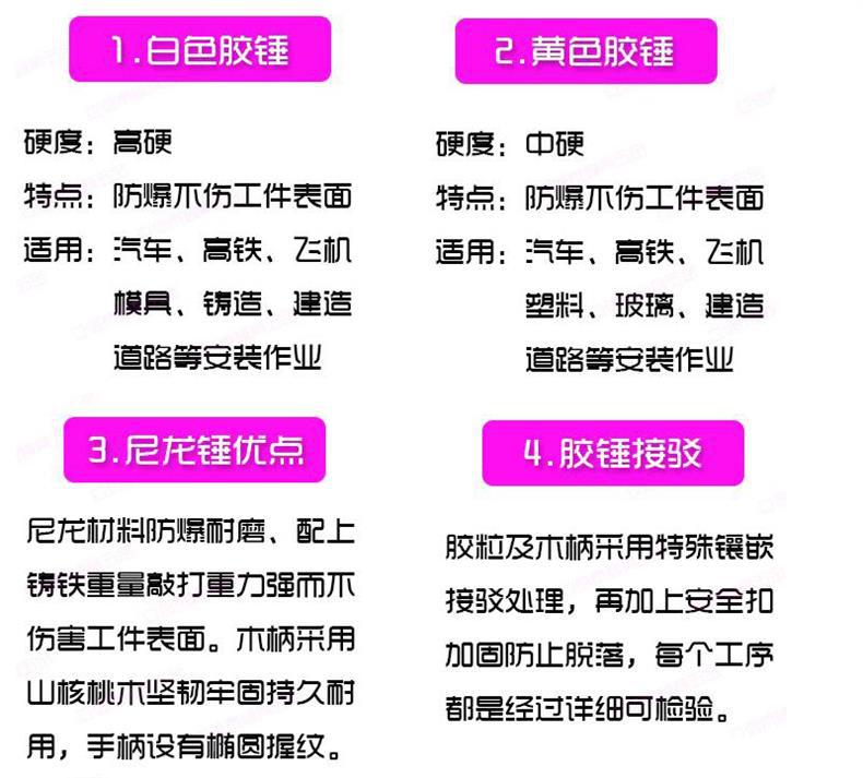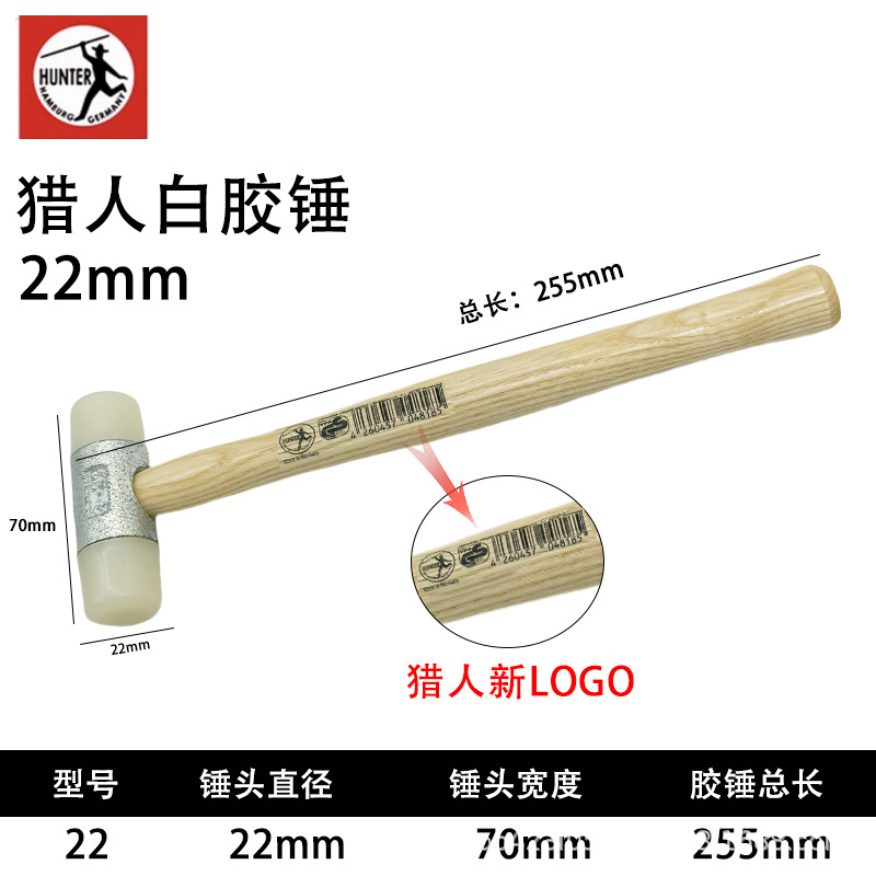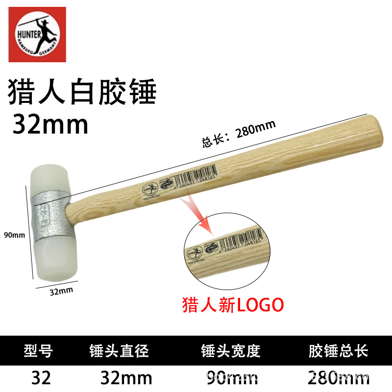 德国猎人牌尼龙锤其主要特征是本实用新型由金属锤架联接固定两个尼龙锤头和一个木质锤把,组装后的锤头内轴心空间中置有一个能沿锤击方向活动的金属加重柱,锤击物体时,加重柱能利用惯性作用力加大锤击力。本实用新型的特点是使用方便、锤击力大、省力耐用、工作效率高,直接使用锤击金属物体,特别在机器制造和维修工业中使用安装轴承、齿轮、轴套和加工维修金属薄板器具时,被锤击的物体部位表面不受损坏。
