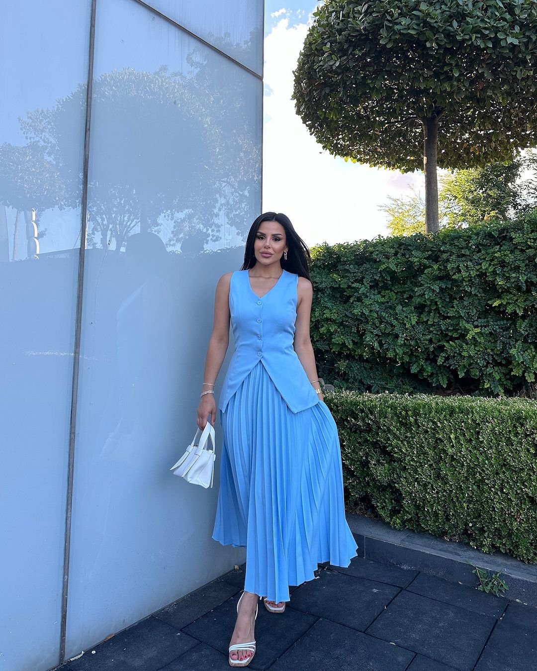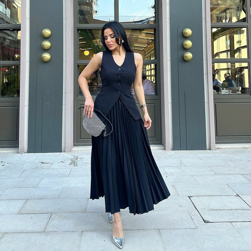 재고 유럽과 미국의 세트 여자 여름 민소매 조끼 분할 솔리드 컬러 대형 주름 치마 여성 투피스 세트