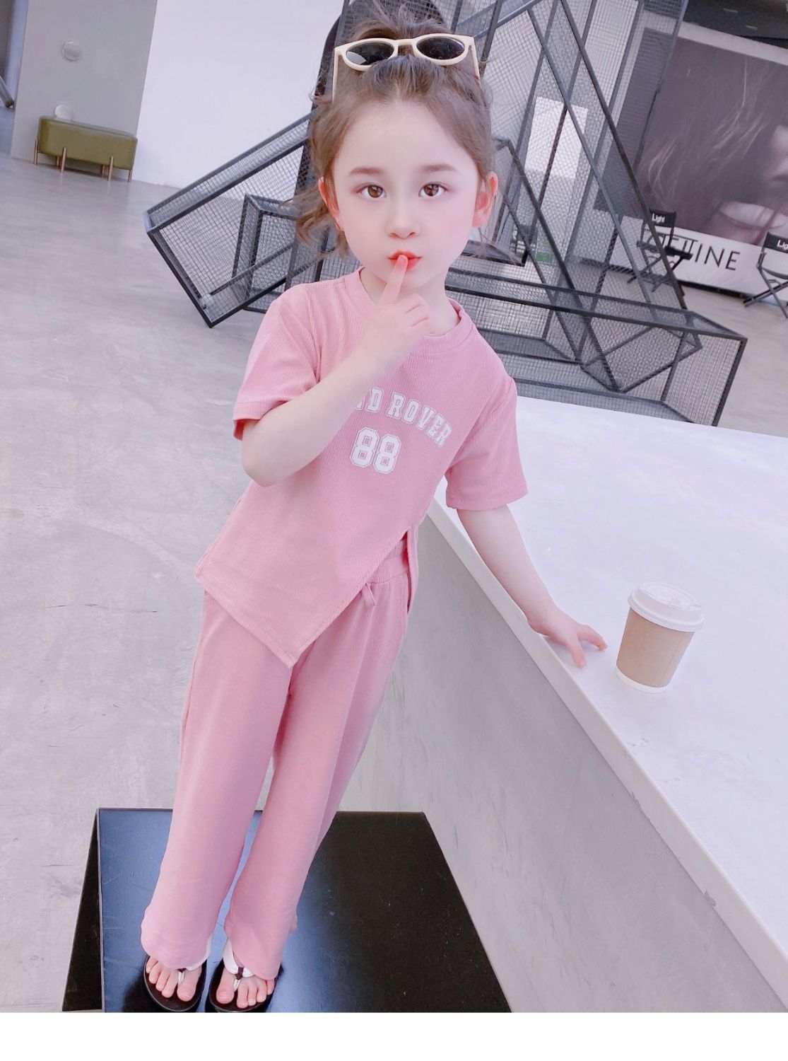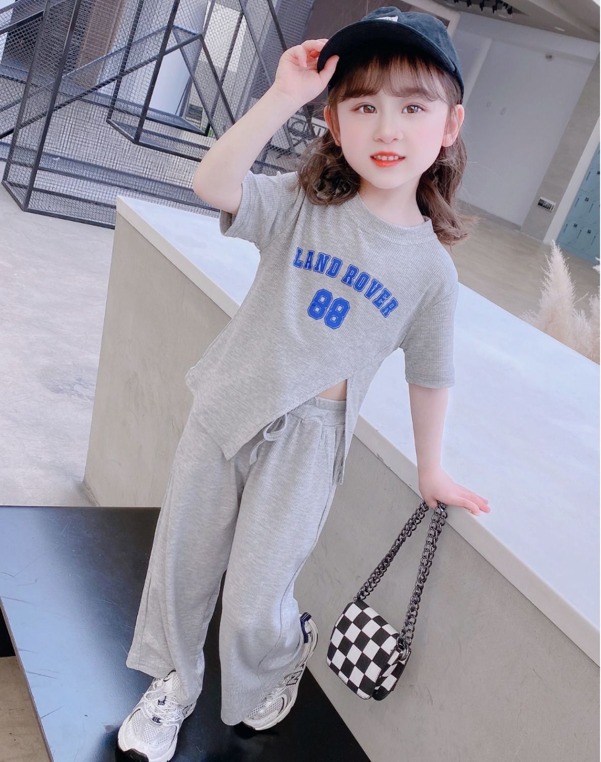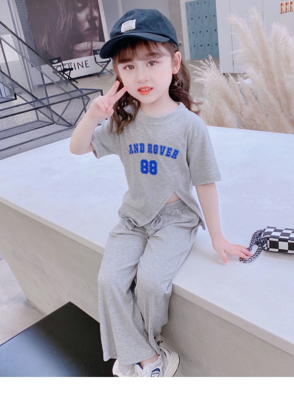 2024 새로운 여름 세트 소녀 분할 편지 인쇄 아기 소녀 두 조각 세련된 반팔 유행 탑