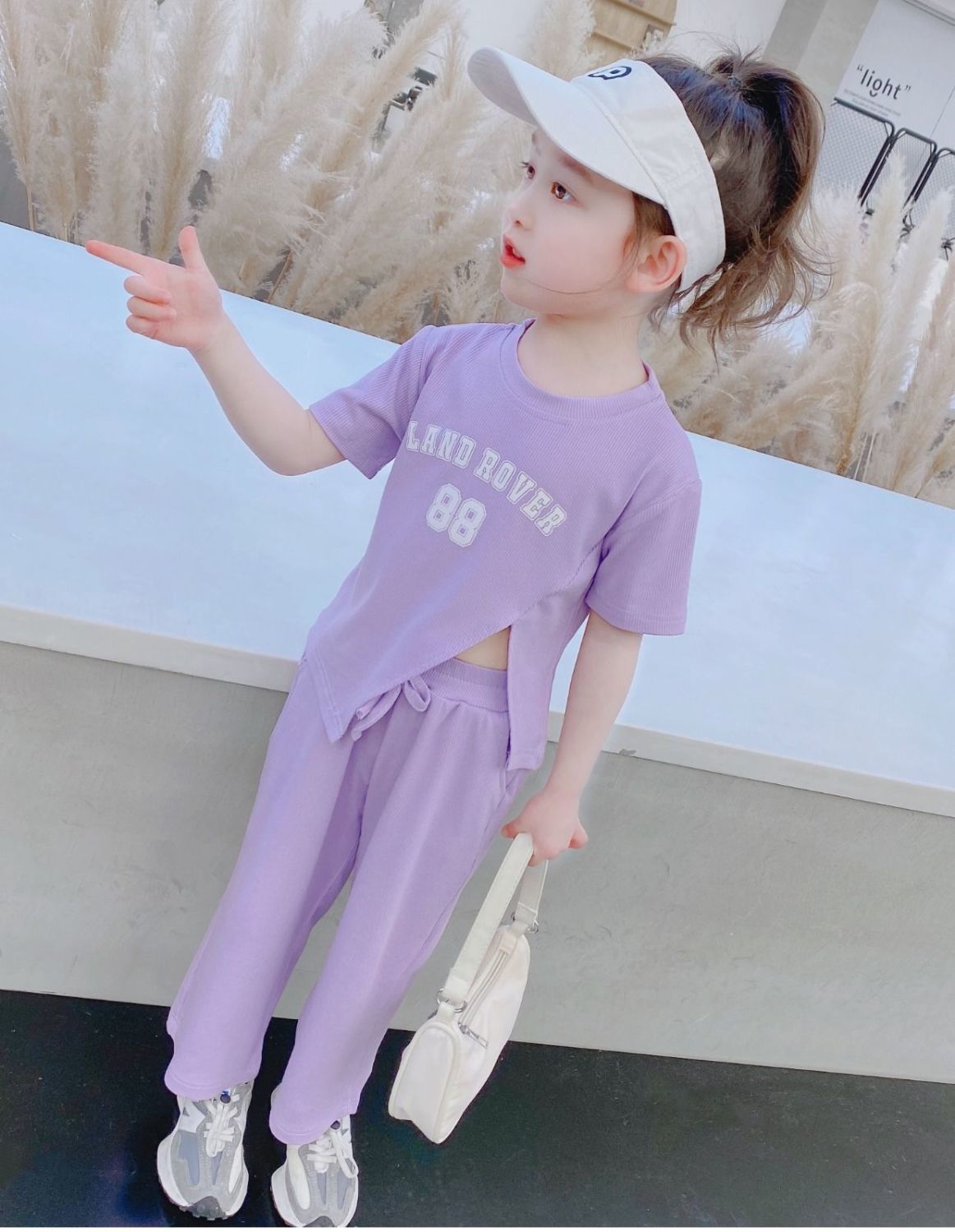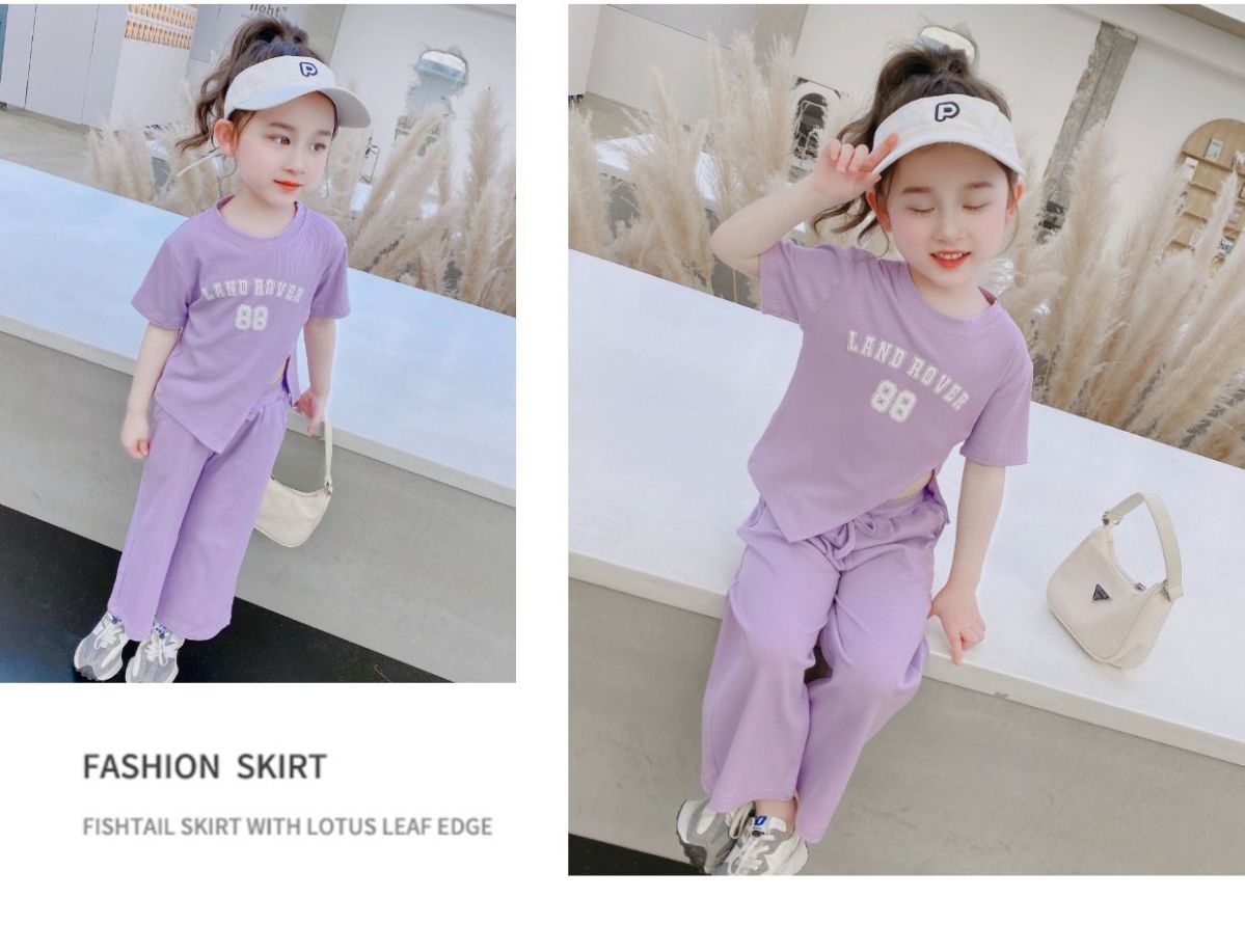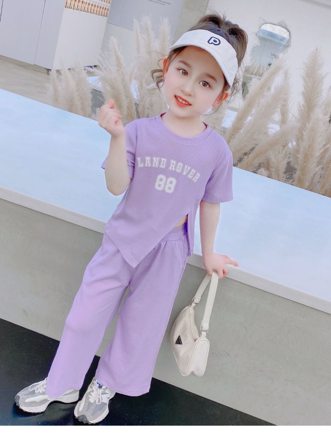 2024 새로운 여름 세트 소녀 분할 편지 인쇄 아기 소녀 두 조각 세련된 반팔 유행 탑