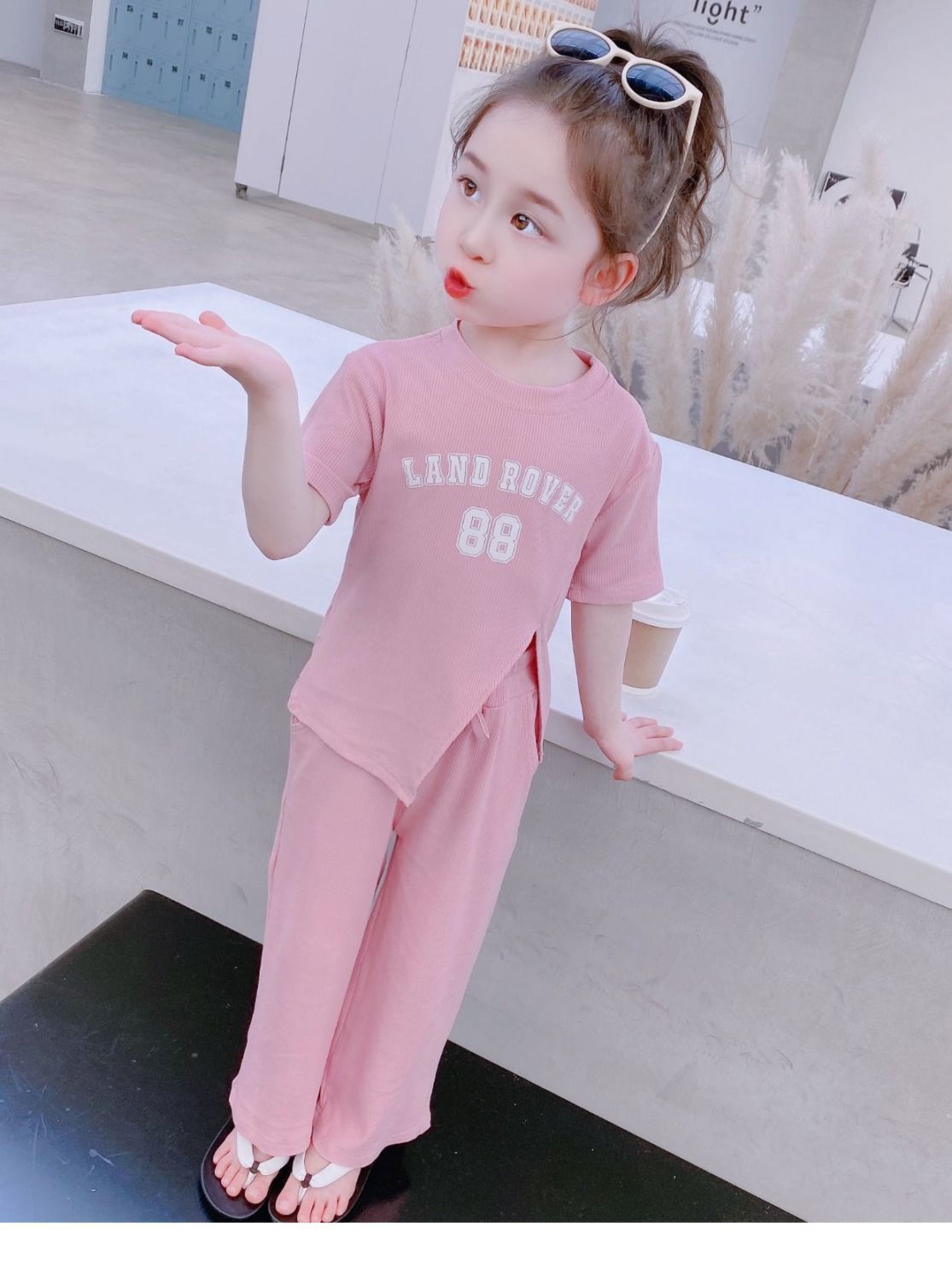 2024 새로운 여름 세트 소녀 분할 편지 인쇄 아기 소녀 두 조각 세련된 반팔 유행 탑스토어 가기