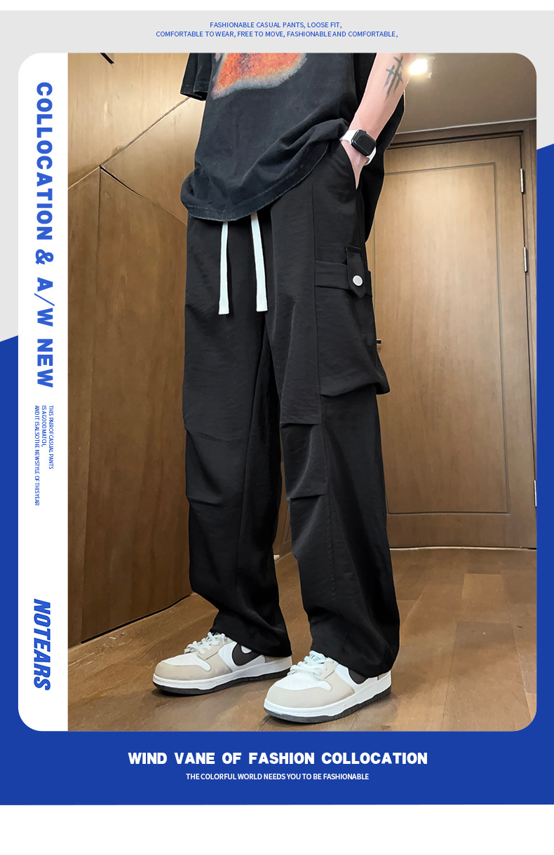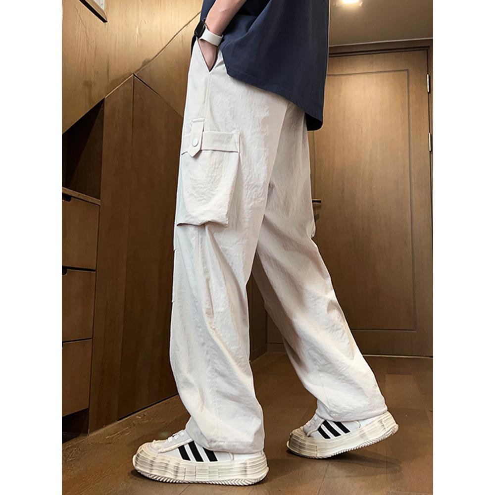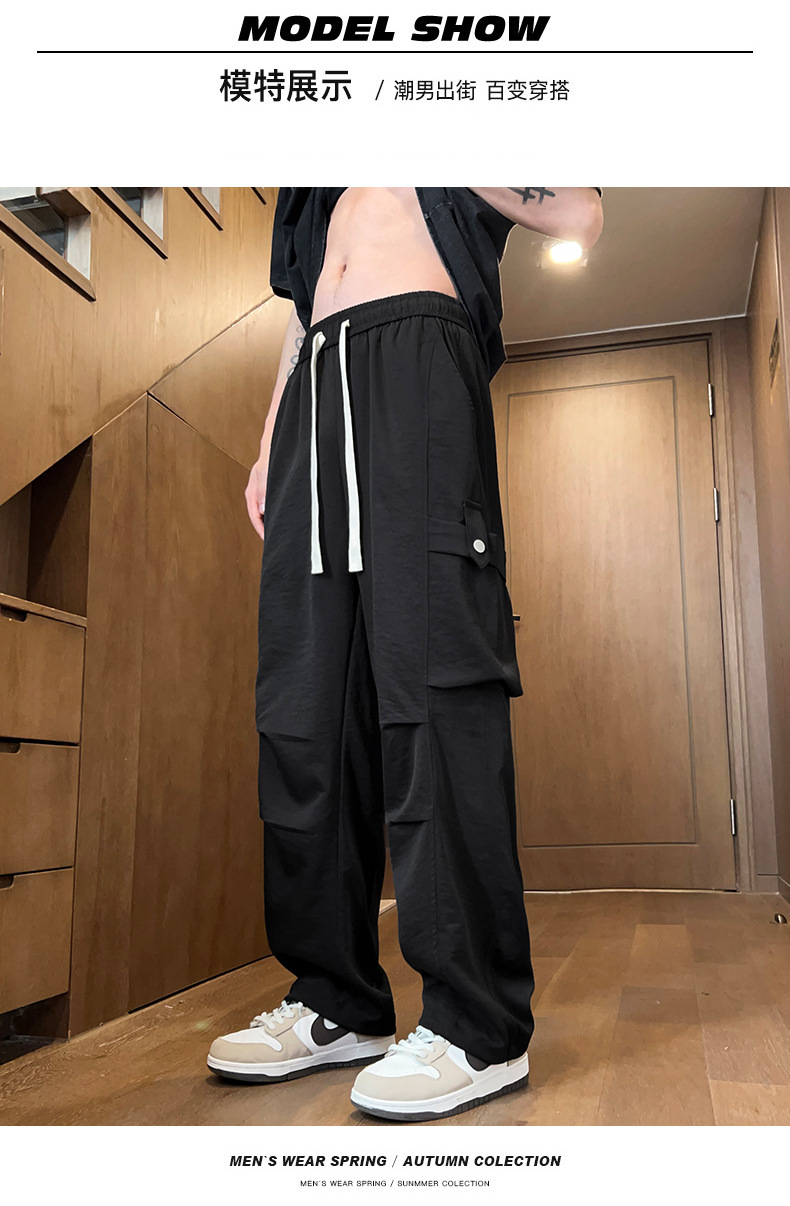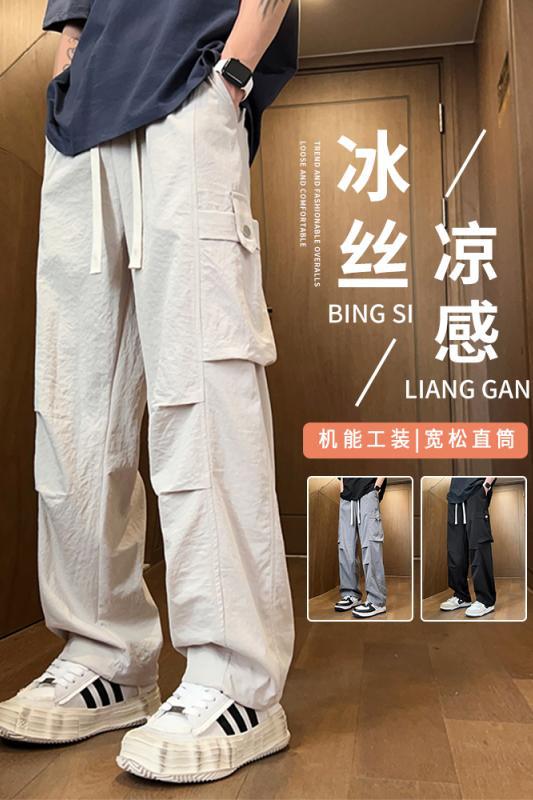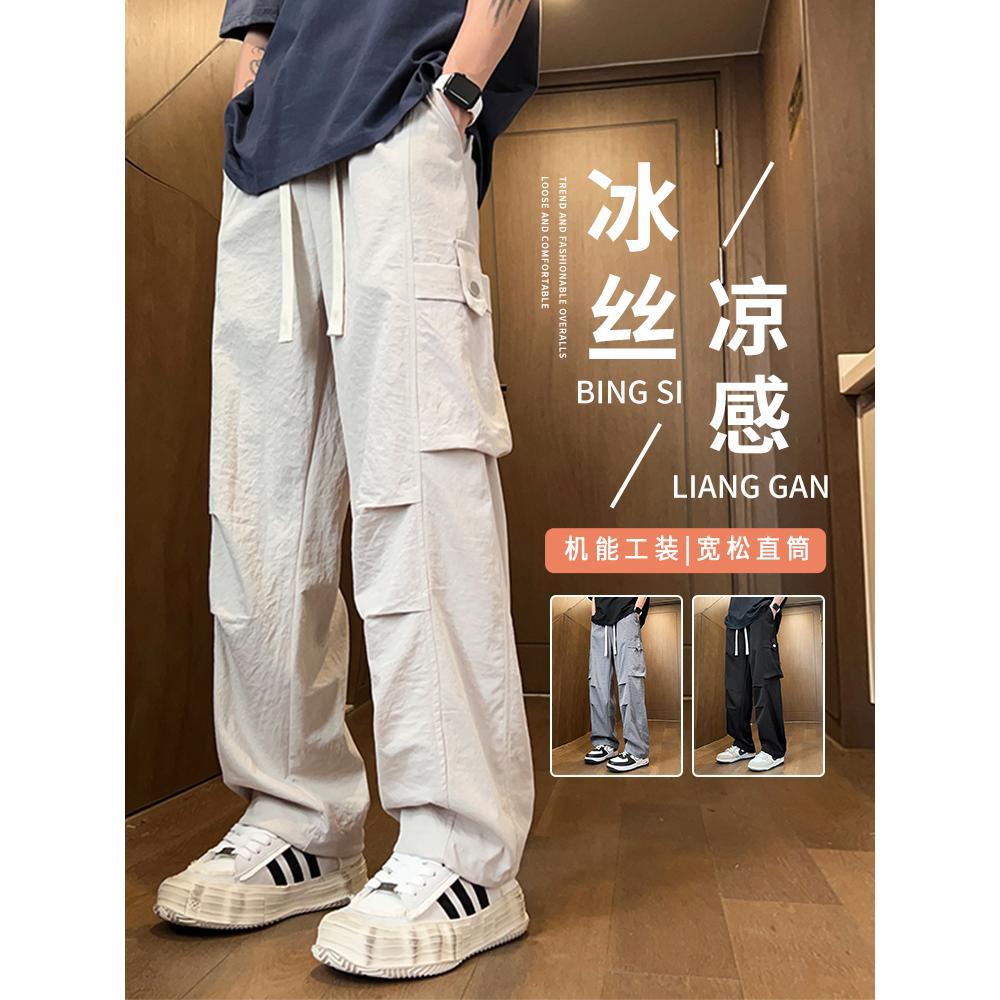 아이스 실크 빠른 건조 바지 남자 2024 여름 느슨한 직선 기능화물 바지 남자의 유행 브랜드 와이드 레그 캐주얼 바지스토어 가기
