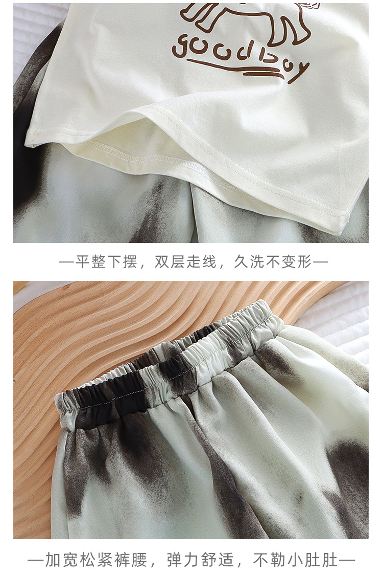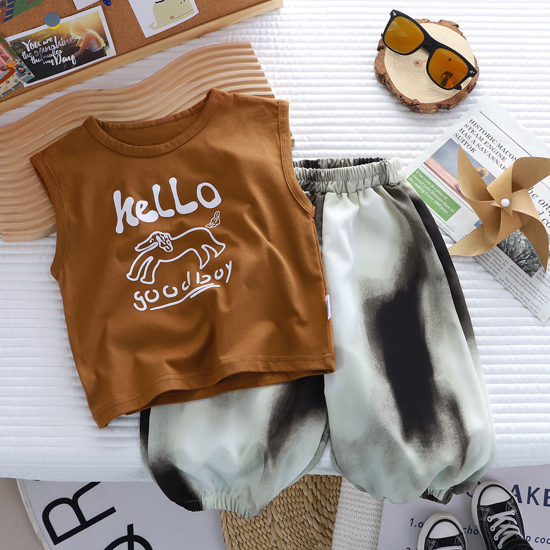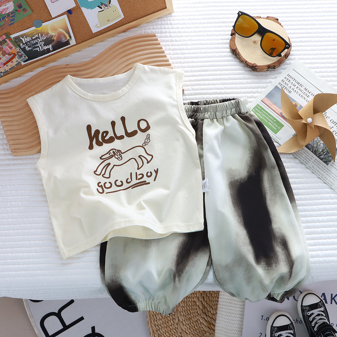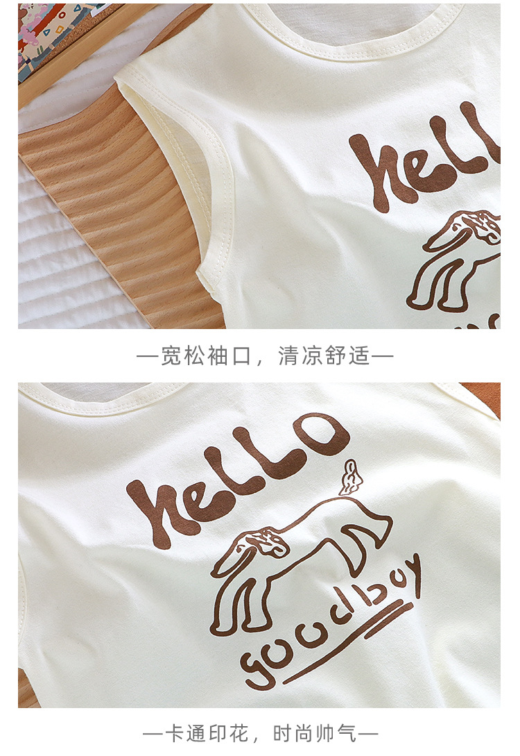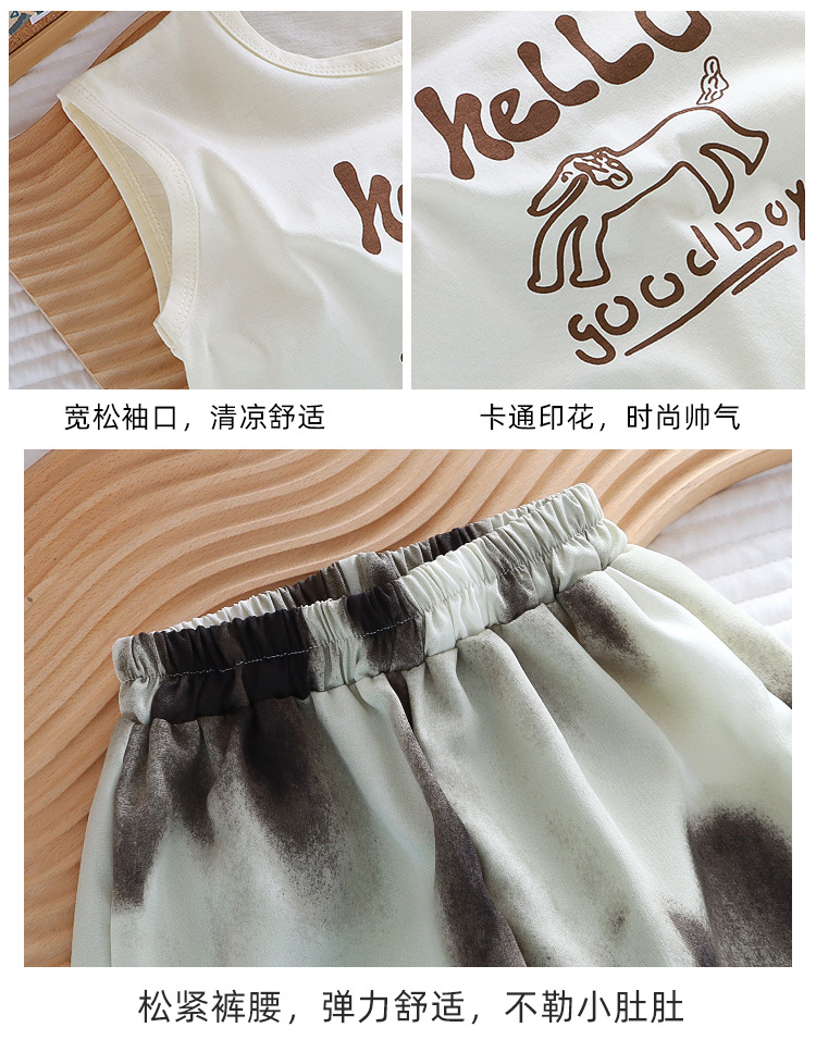 2024 년 어린이 여름 면화 민소매 티셔츠 아이스 실크 멋진 바지 블루머 세트 남학생과 여학생을위한 서양식 세트