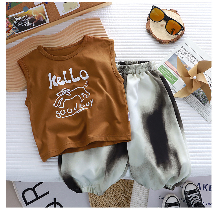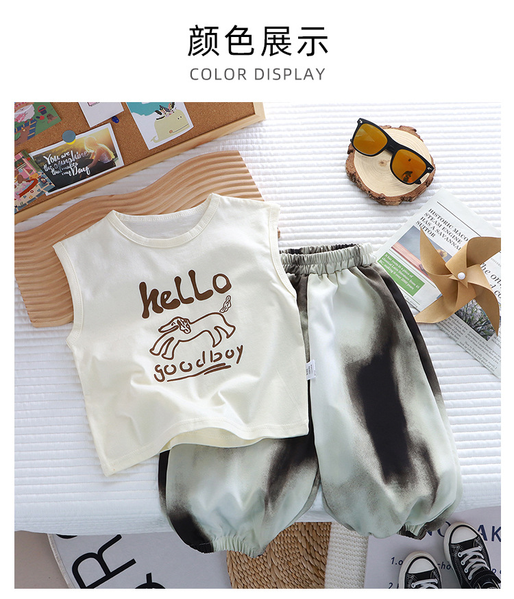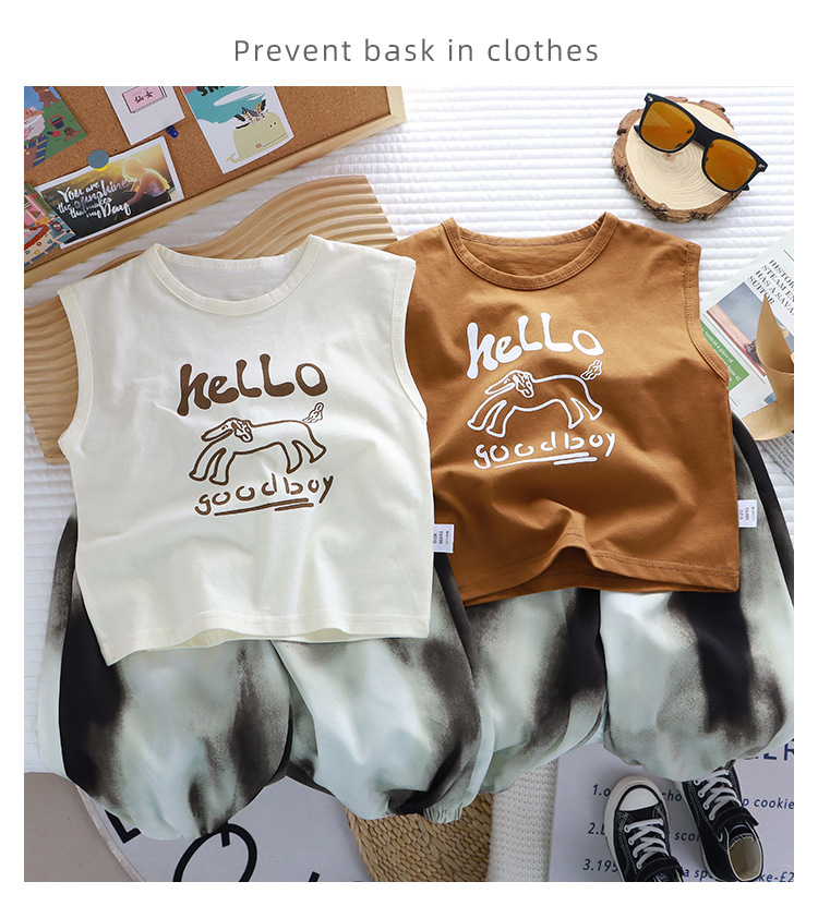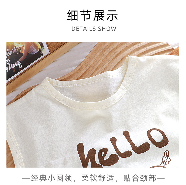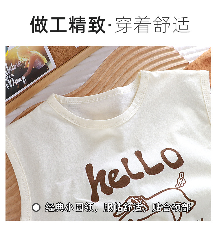 2024 년 어린이 여름 면화 민소매 티셔츠 아이스 실크 멋진 바지 블루머 세트 남학생과 여학생을위한 서양식 세트스토어 가기