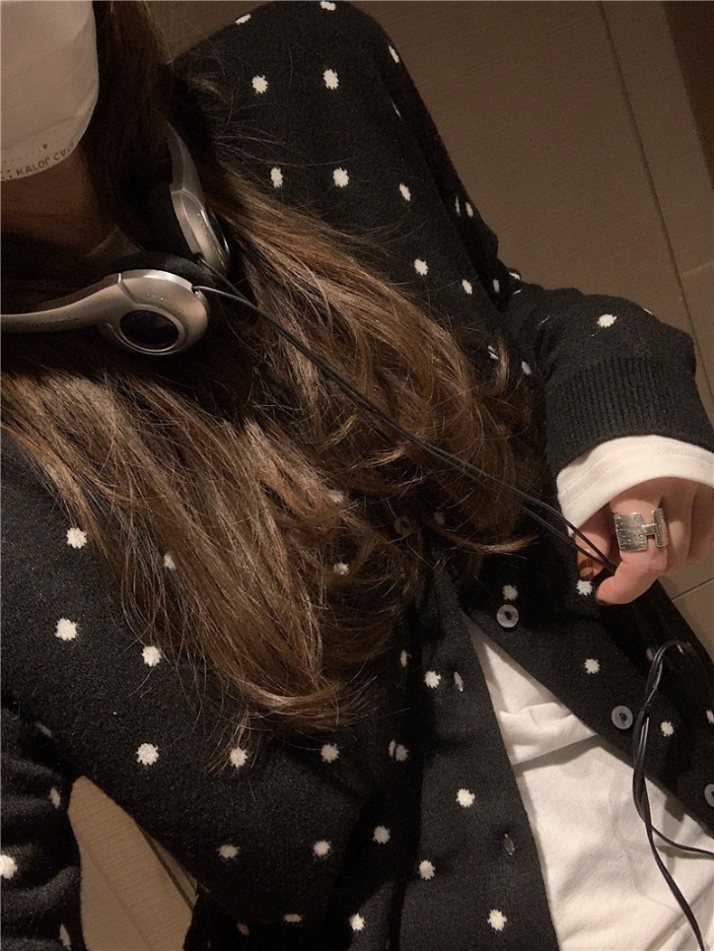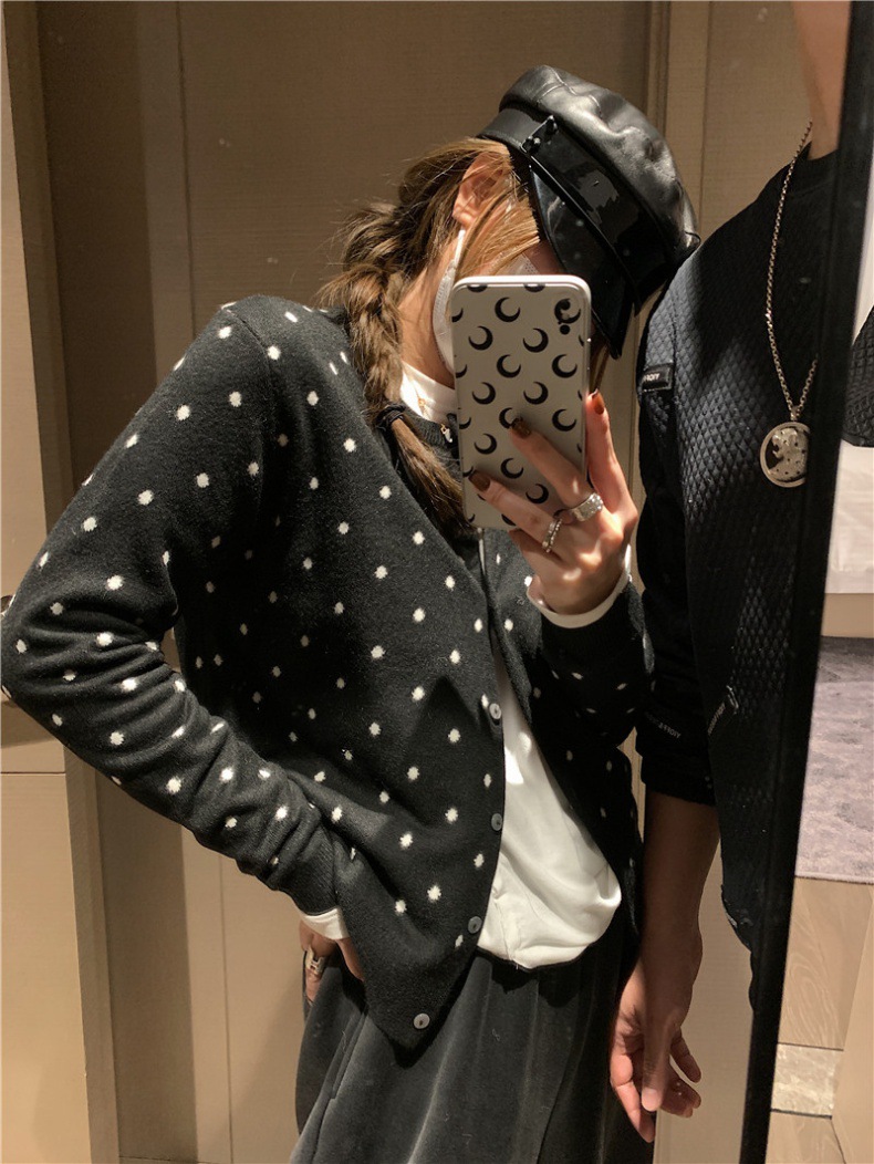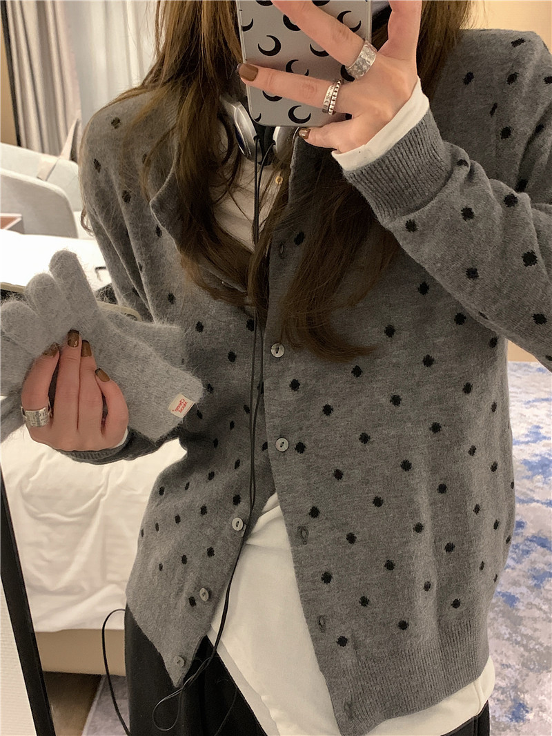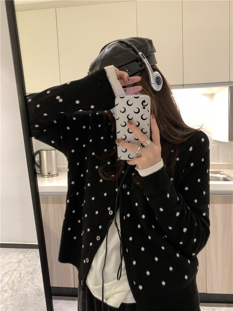2024 봄과 가을 라운드 넥 싱글 브레스트 폴카 닷 긴팔 올매치 니트 카디건 여자 빈티지 자카드 한국 스웨터 재킷스토어 가기