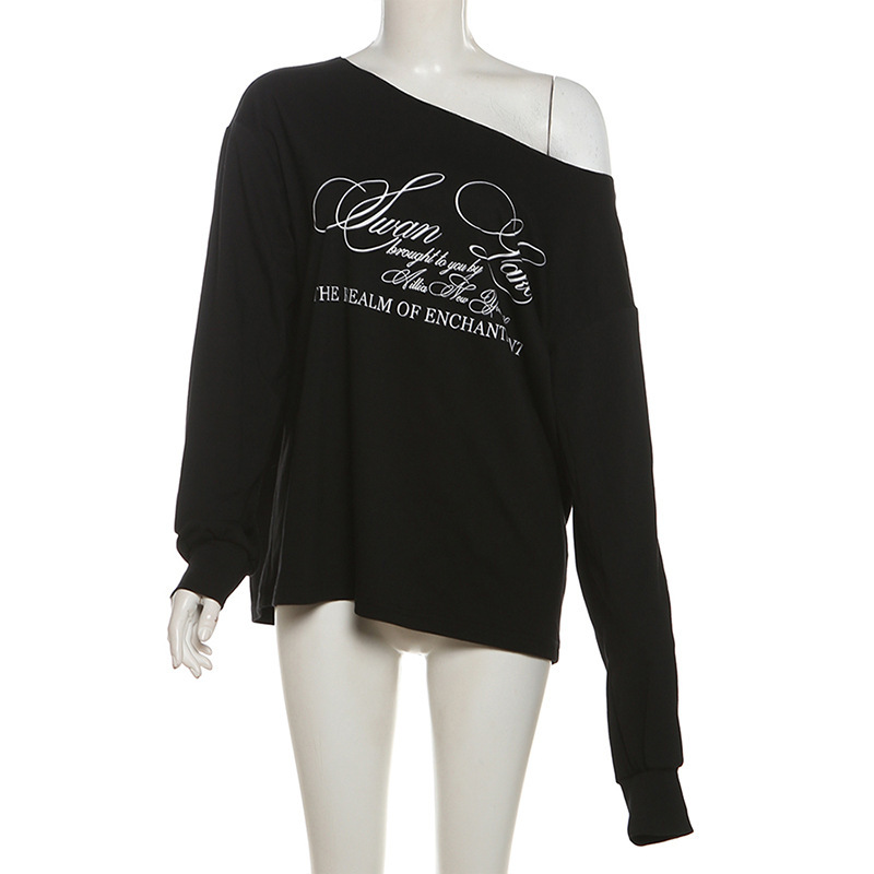 대외 무역 2025 여름 신작 여성 아메리칸 스트리트 패션 편지 인쇄 기울어 진 어깨 반팔 루즈 티셔츠 탑스토어 가기