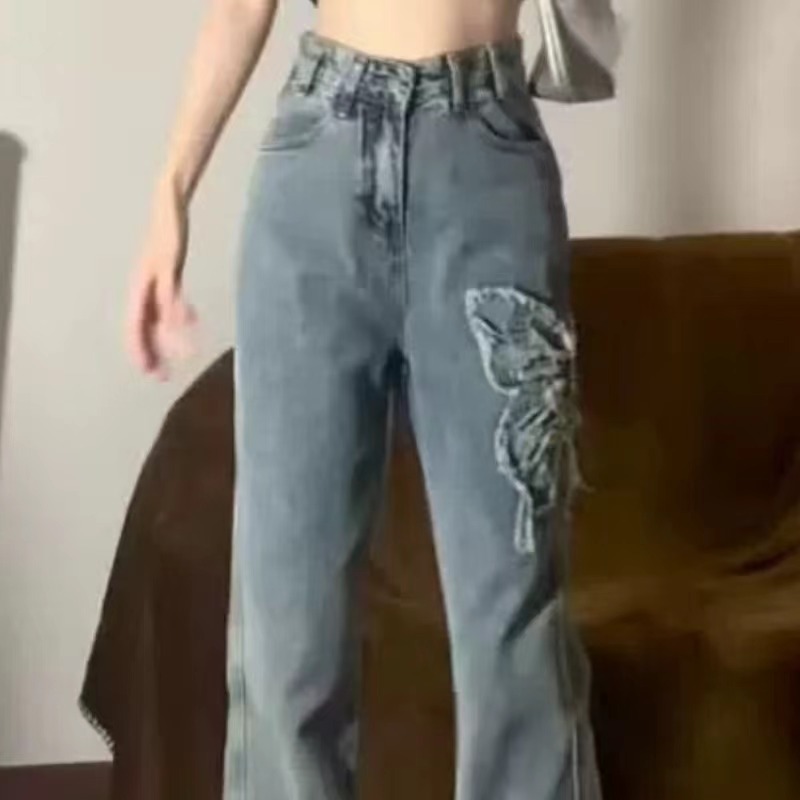 플러스 사이즈 빈티지 나비 자수 청바지 여성의 2024 여름 뜨거운 소녀 높은 허리 세척 마이크로 뿔 유행 바지스토어 가기