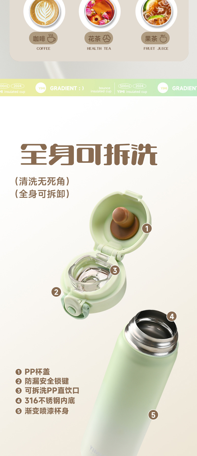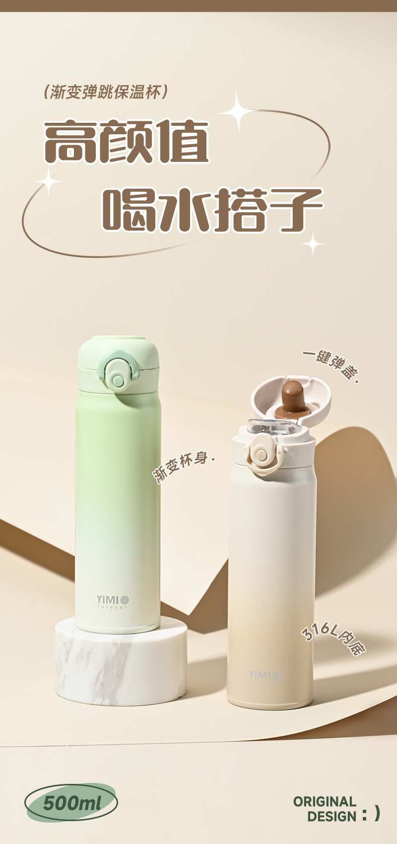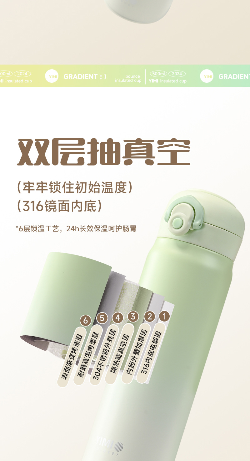 새로운 크리스탈 컬러 그라디언트 바운스 보온병 컵 남자와 여자의 스테인리스 마시는 컵 자동차 학생 야외 휴대용 물 컵