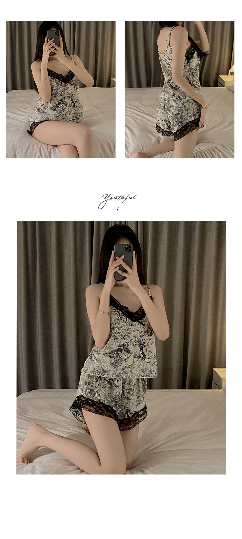 여성을위한 가슴 패드 레이스 섹시한 홈웨어 세트와 여름 새로운 직조 버블 주름 천 슬링 잠옷스토어 가기