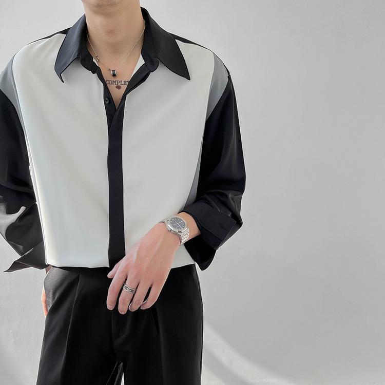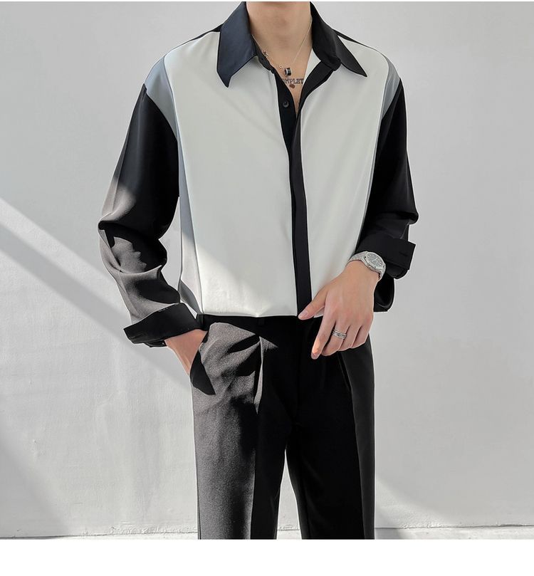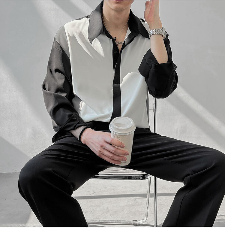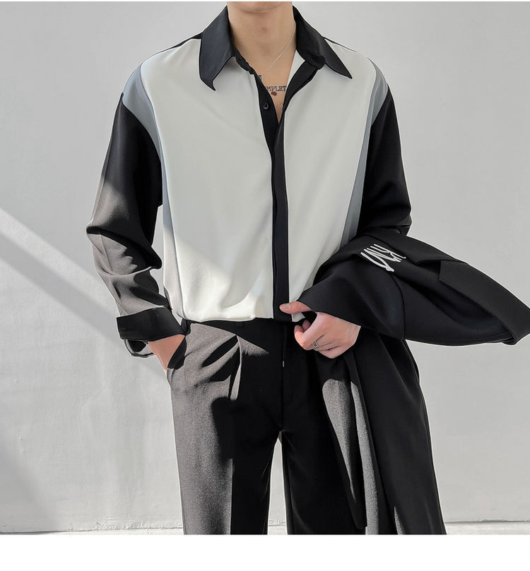 봄 최고 한국식 느슨한 투약 긴 소매 셔츠 남자의 유행 바느질 대비 컬러 캐주얼 비 다림질 셔츠 남자의 유행