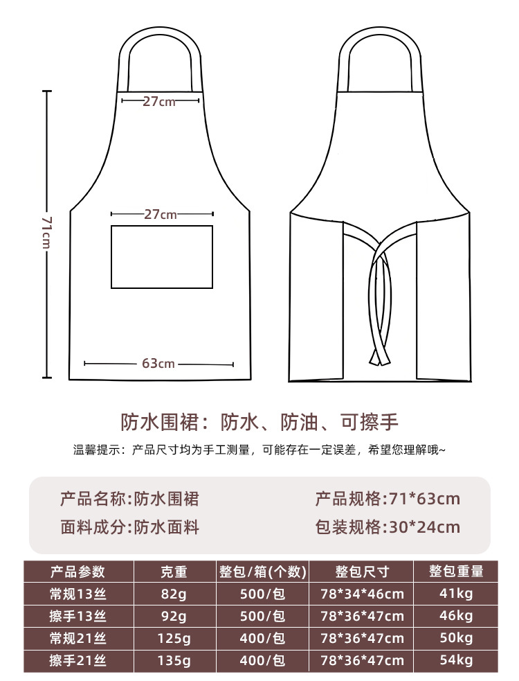 13丝擦手款:尺寸(71*63cm)单件克重(92g)整箱/包(500/包)整包尺寸(78*36*47cm)整包重量(46kg)单件包装尺寸(30*24cm)