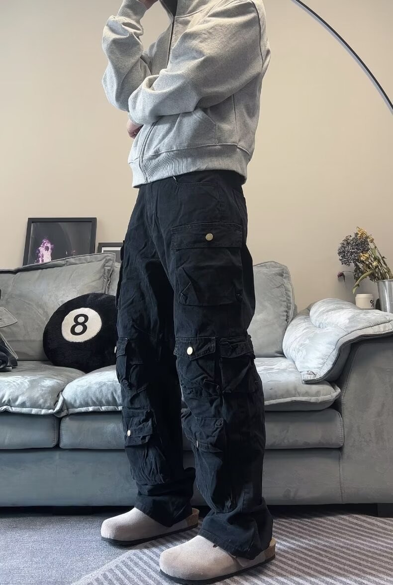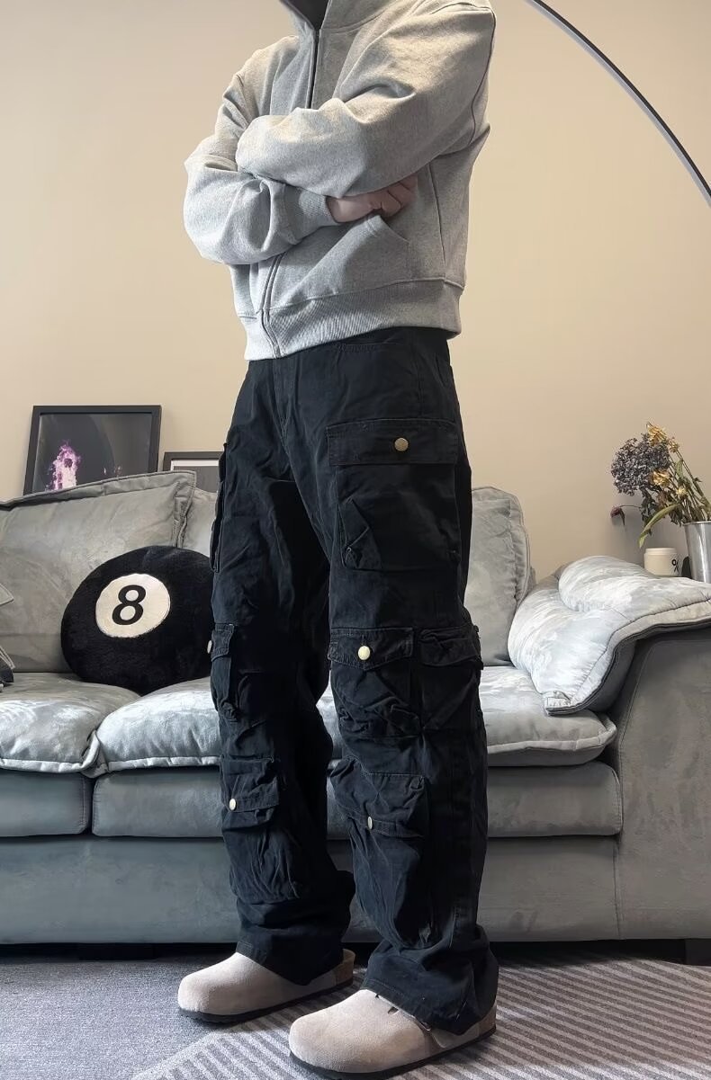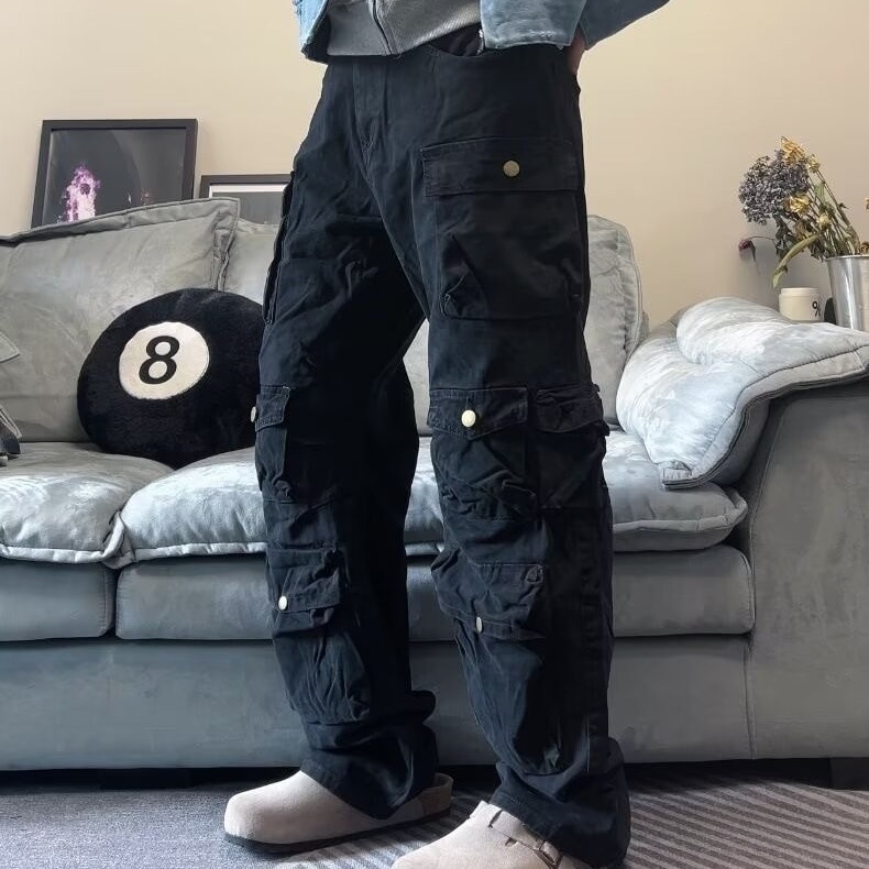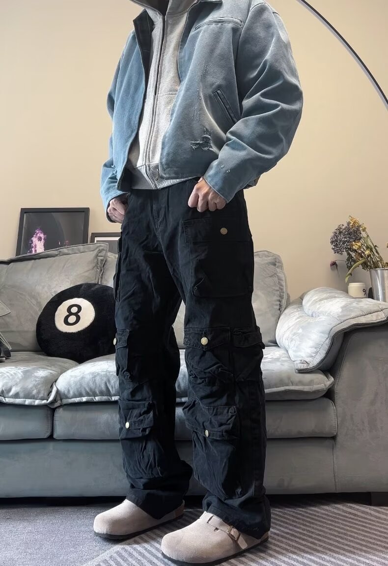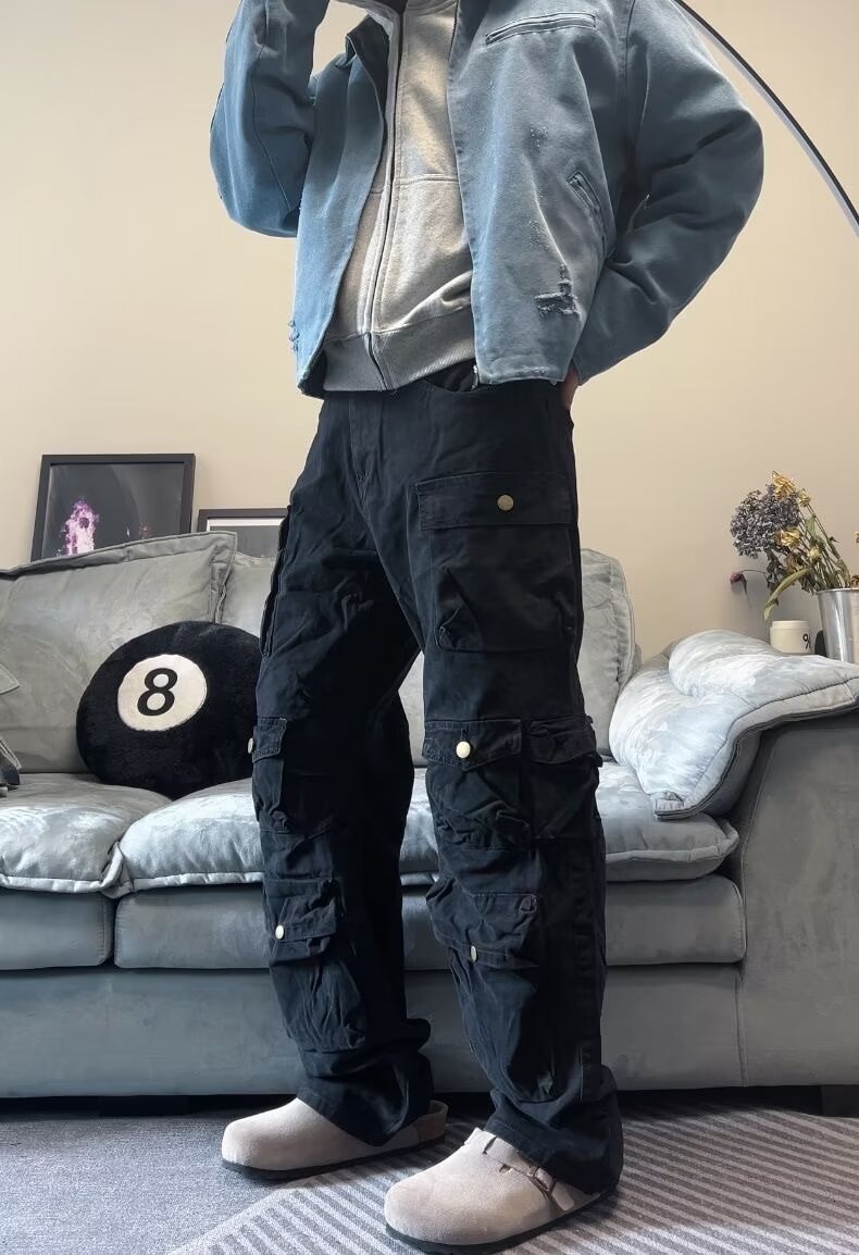 [3 색 멀티 포켓] 클린 핏 대형 포켓 버튼 스트레이트 느슨한 미국 바지 남성 청바지 패션