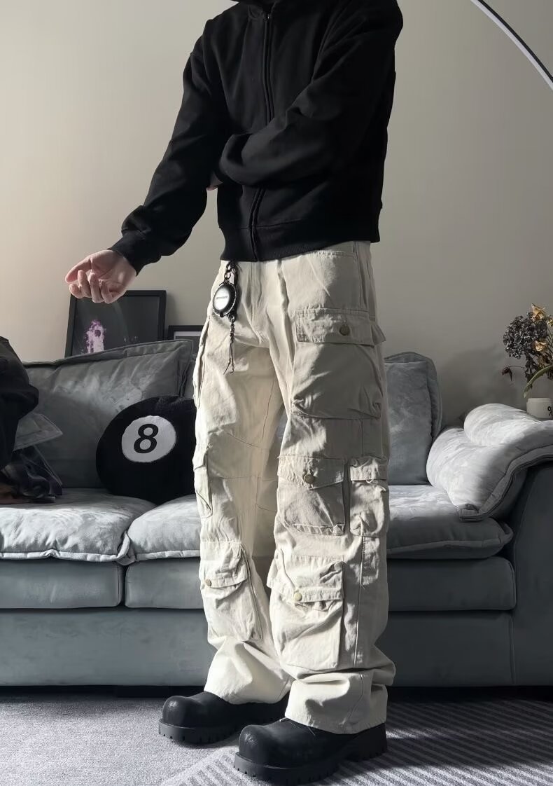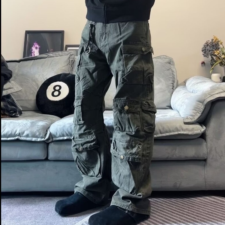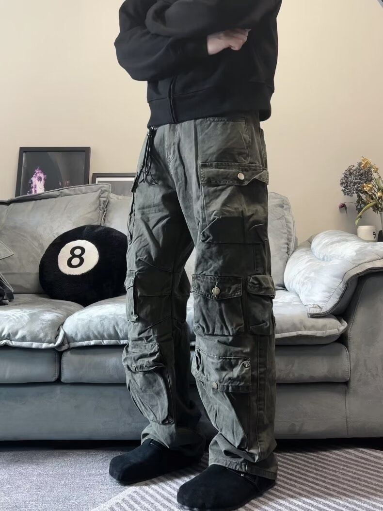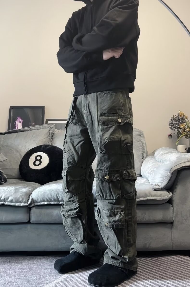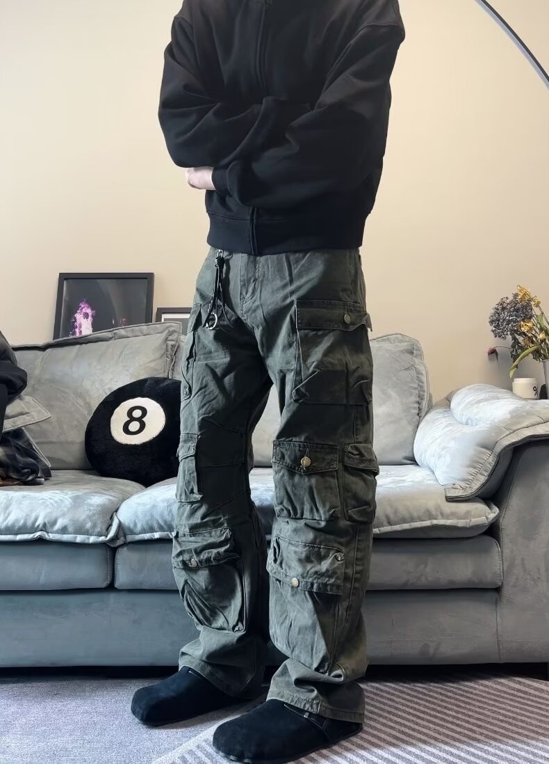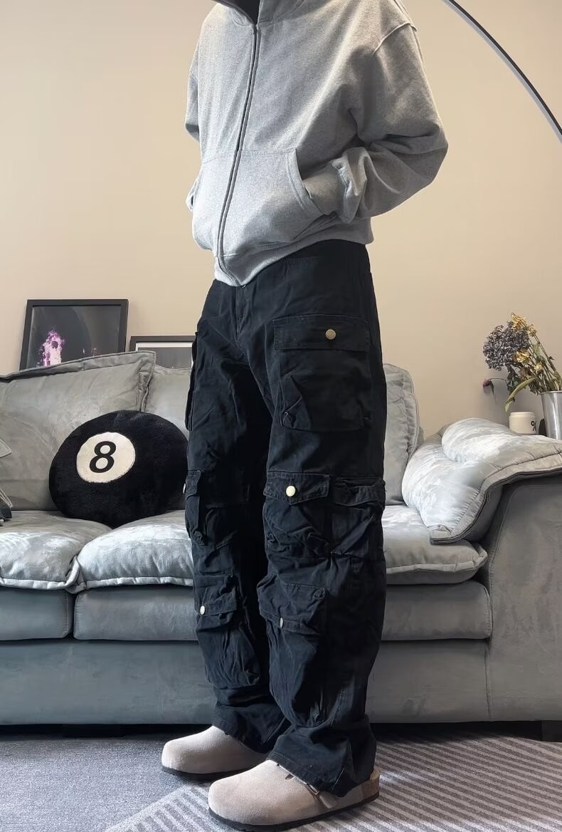 [3 색 멀티 포켓] 클린 핏 대형 포켓 버튼 스트레이트 느슨한 미국 바지 남성 청바지 패션