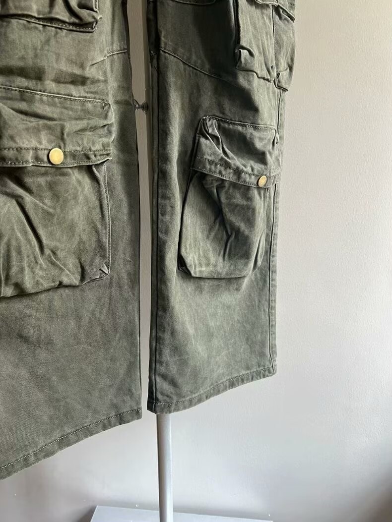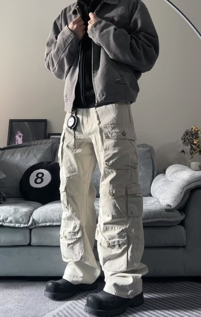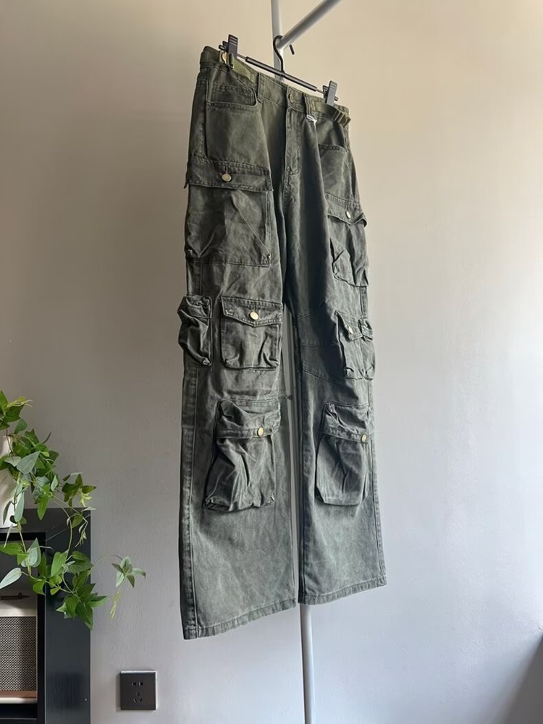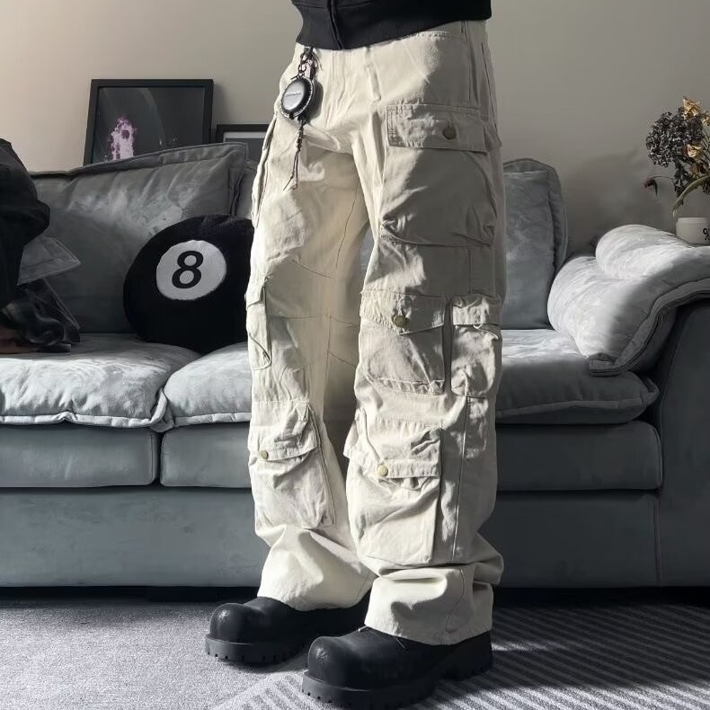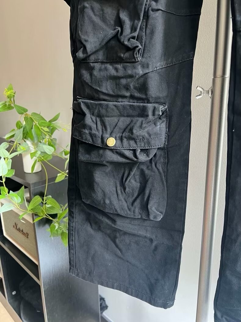 [3 색 멀티 포켓] 클린 핏 대형 포켓 버튼 스트레이트 느슨한 미국 바지 남성 청바지 패션