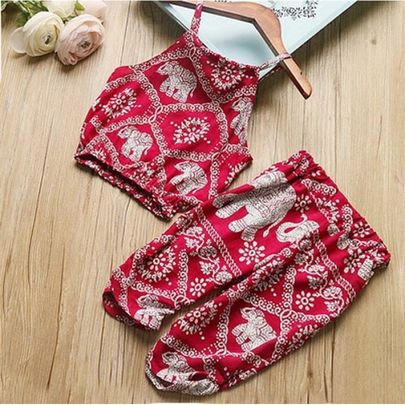 2023 소녀 여름 새로운 민소매 인쇄 슬링 탑 아기 소녀 편안한 캐주얼 바지 세트 P8586