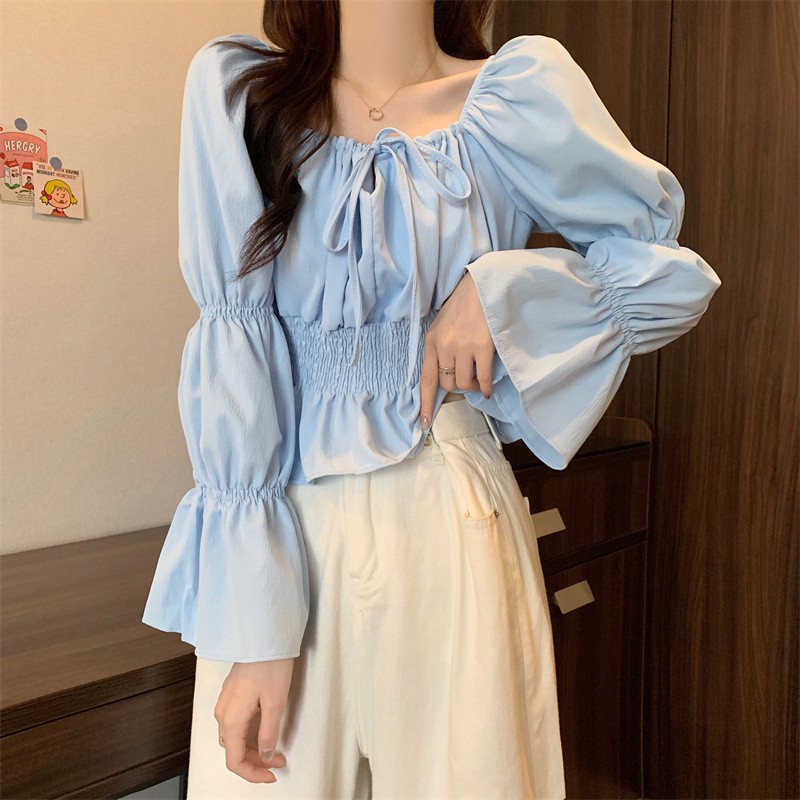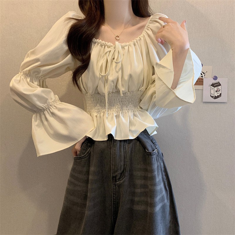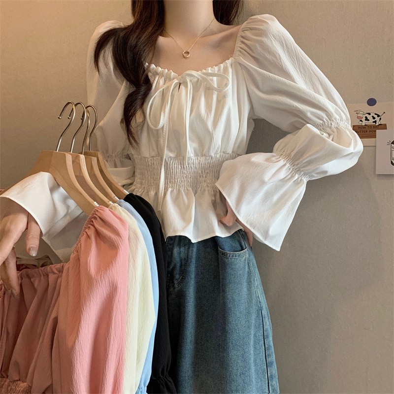 프렌치 퍼프 슬리브 셔츠 새로운 스타일 디자인 센스 틈새 우아한 클래 버클 젠틀 스타일 타이트 허리 올 매치 러플 탑스토어 가기