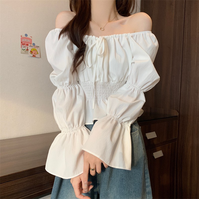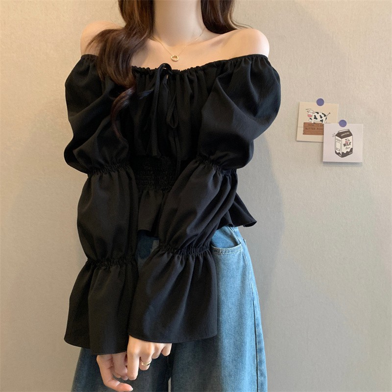 프렌치 퍼프 슬리브 셔츠 새로운 스타일 디자인 센스 틈새 우아한 클래 버클 젠틀 스타일 타이트 허리 올 매치 러플 탑