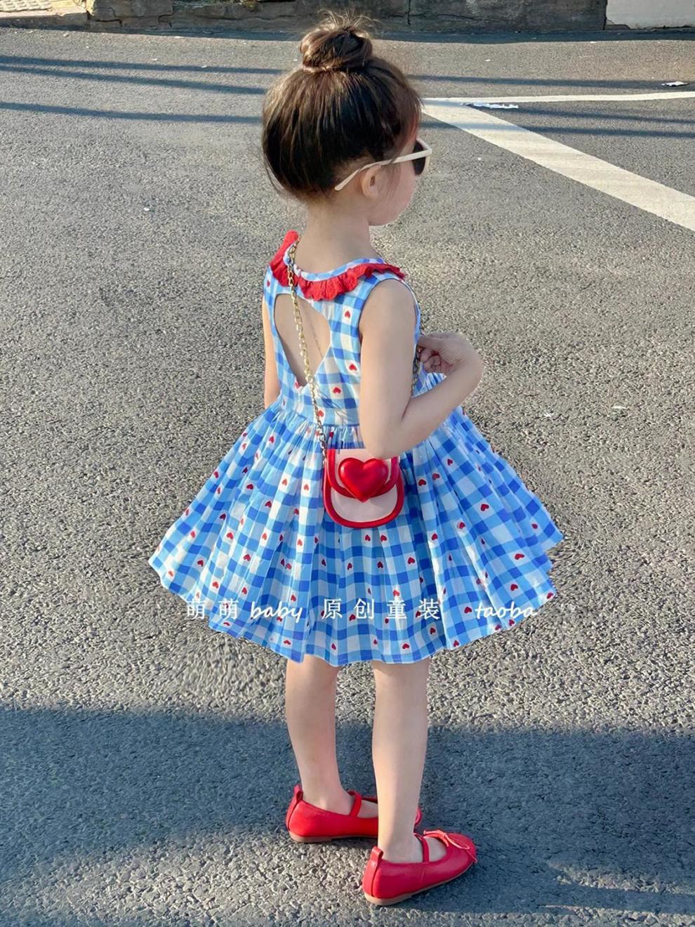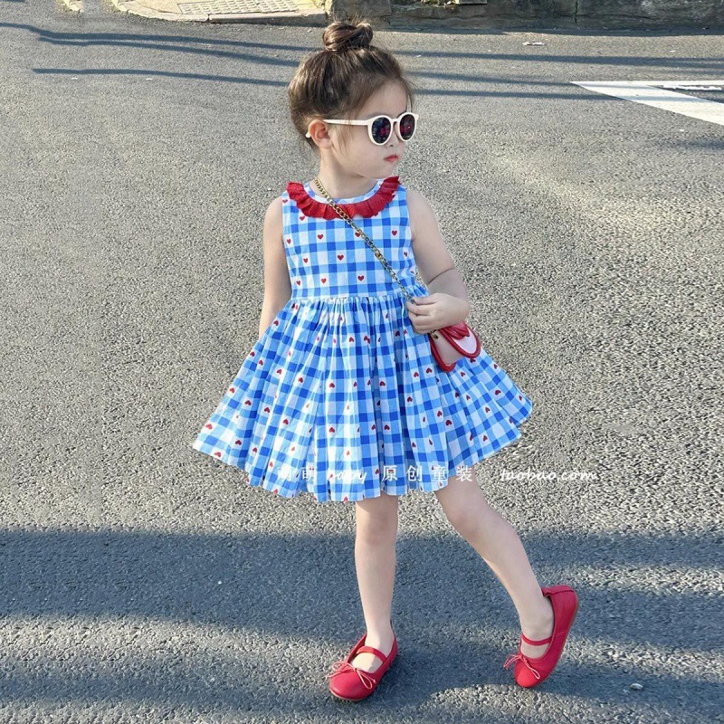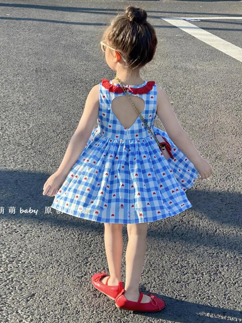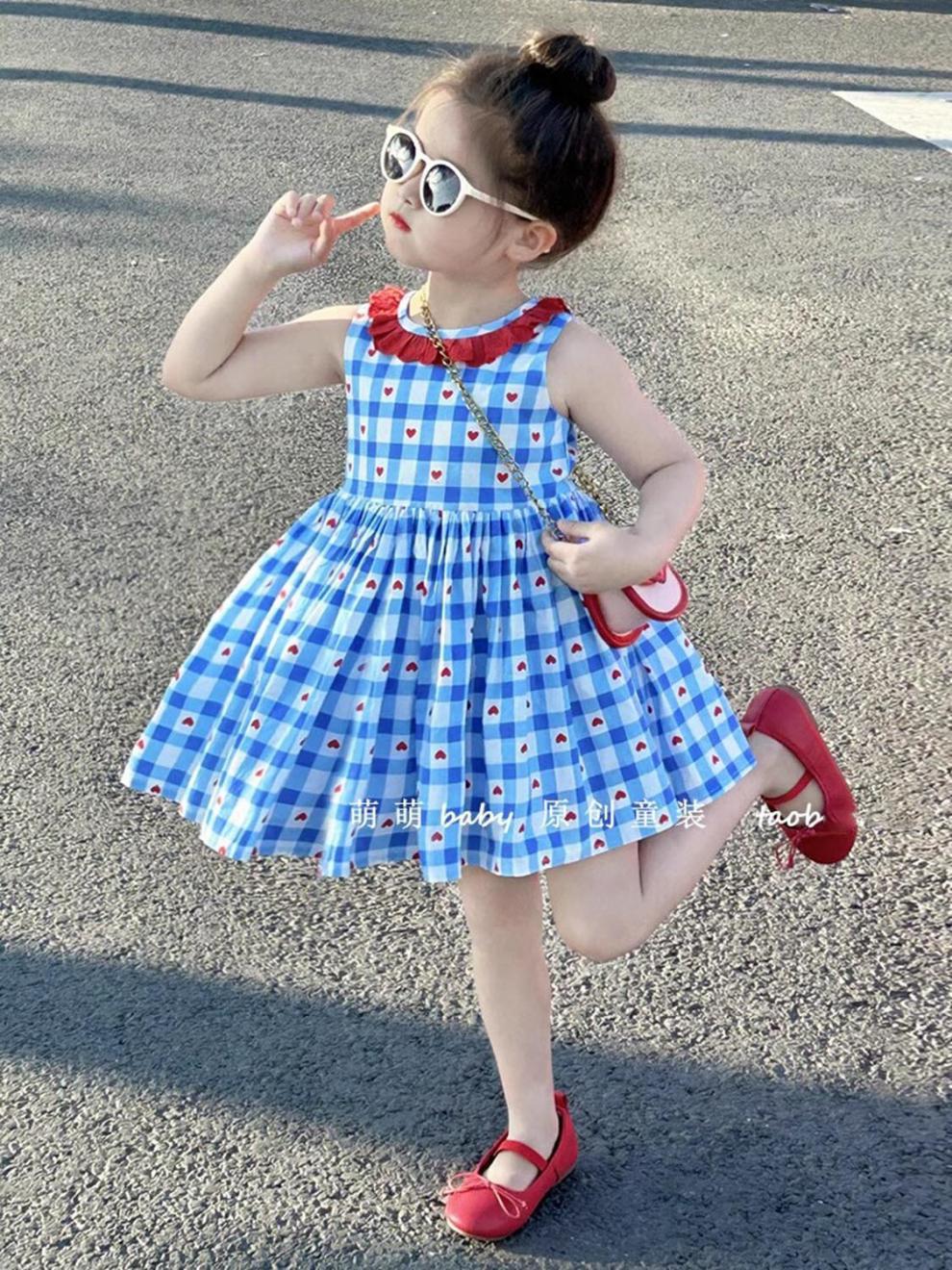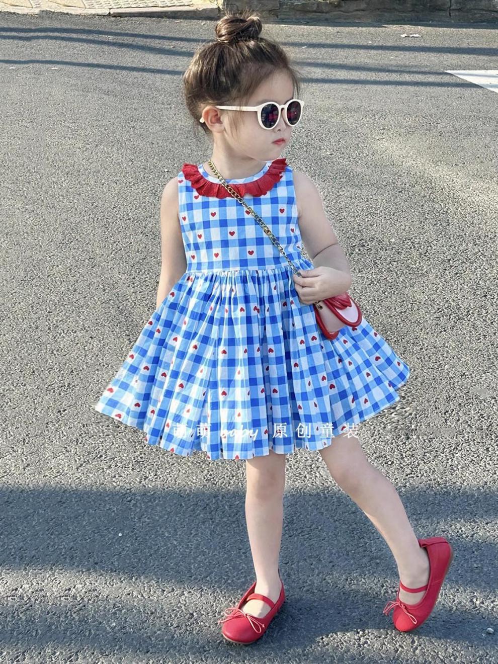 한국 아동복 2024 여름 새로운 사랑 블루 체크 무늬 민소매 원피스 소녀 레이스 칼라 이슬 조끼 치마스토어 가기