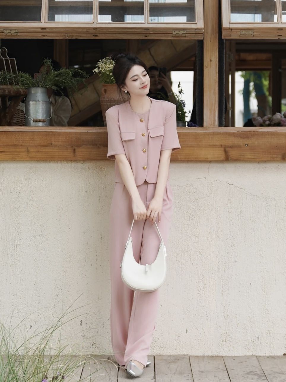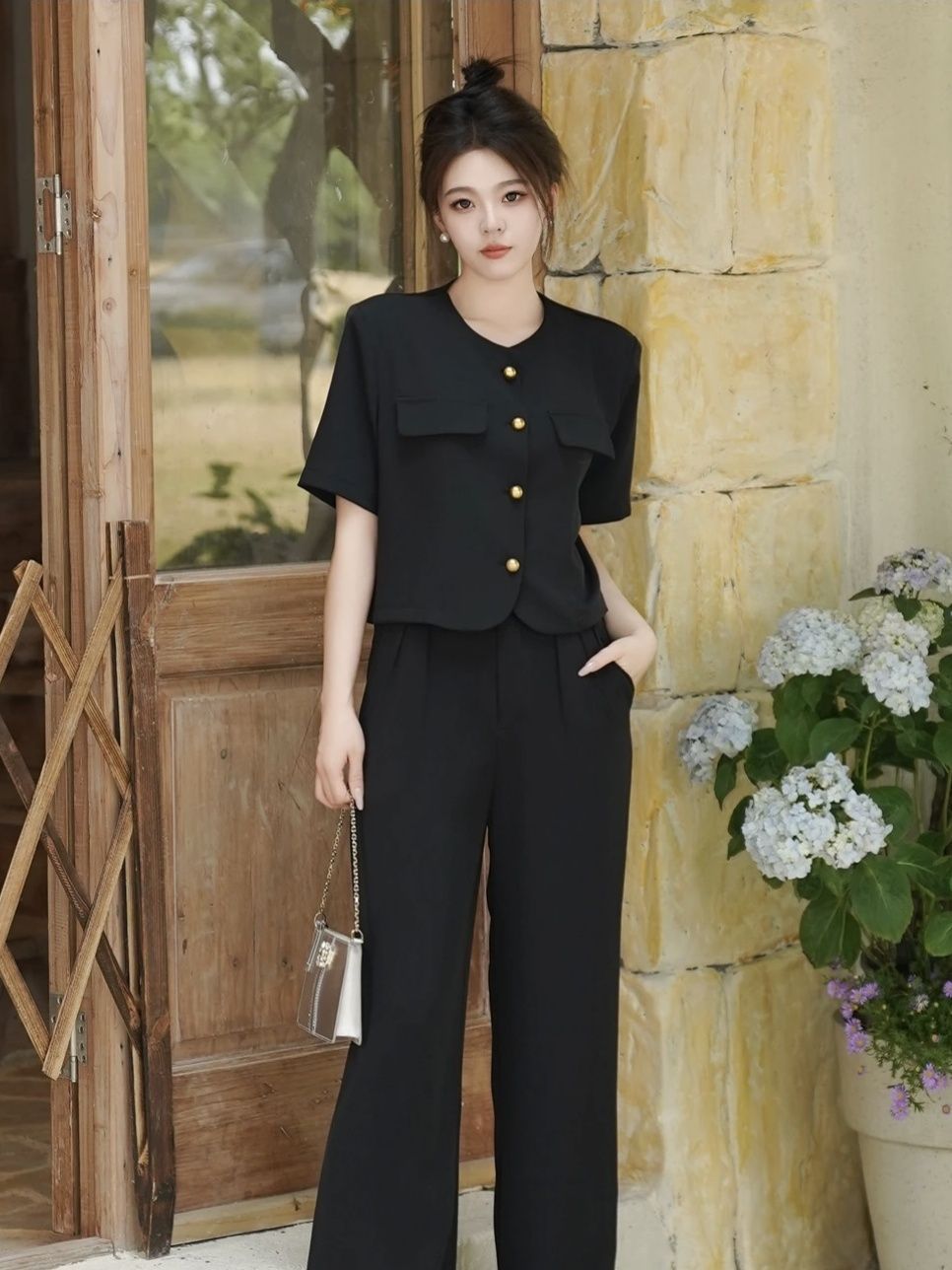 패션 샤넬 스타일 반팔 세트 여성 여름 얇은 작은 원피스 우아한 사교계 짧은 코트 와이드 레그 바지 투피스 세트