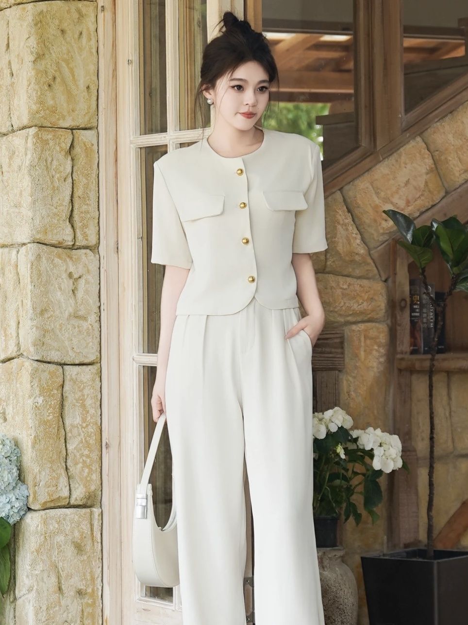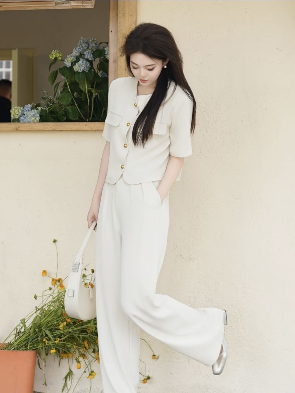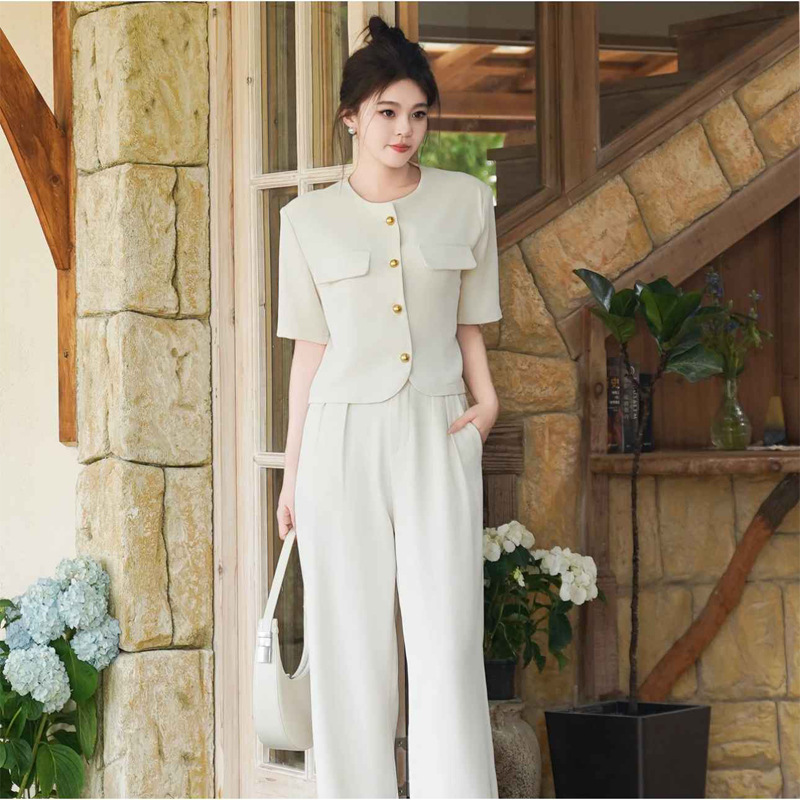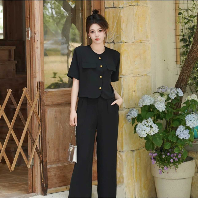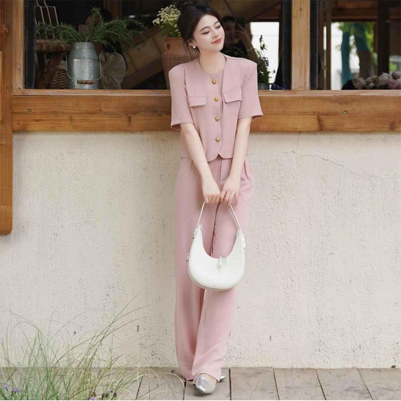 패션 샤넬 스타일 반팔 세트 여성 여름 얇은 작은 원피스 우아한 사교계 짧은 코트 와이드 레그 바지 투피스 세트스토어 가기