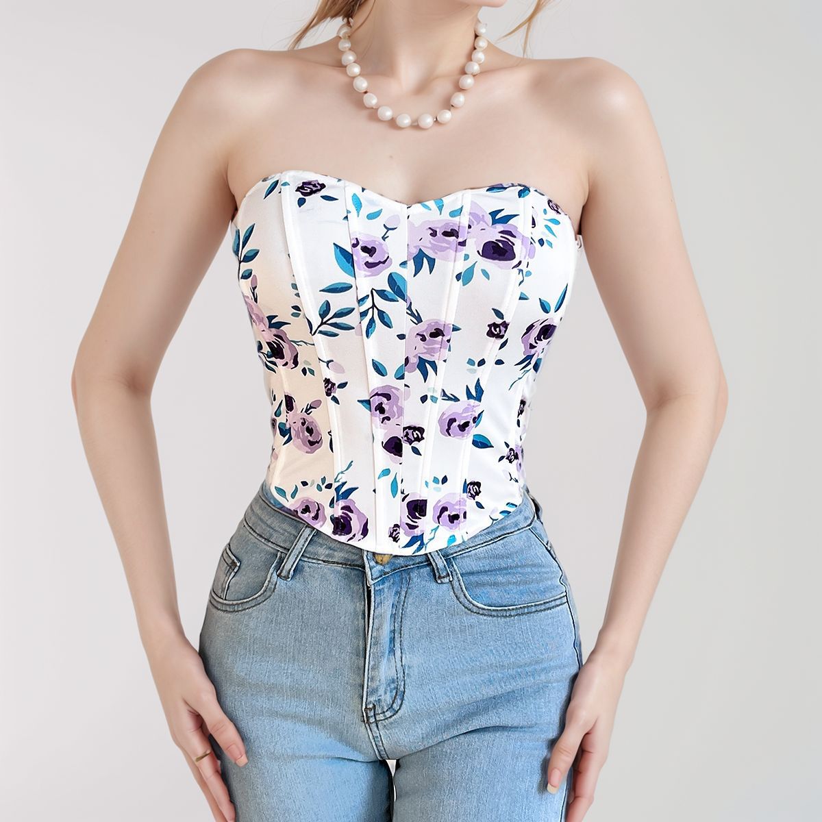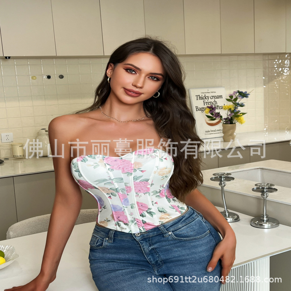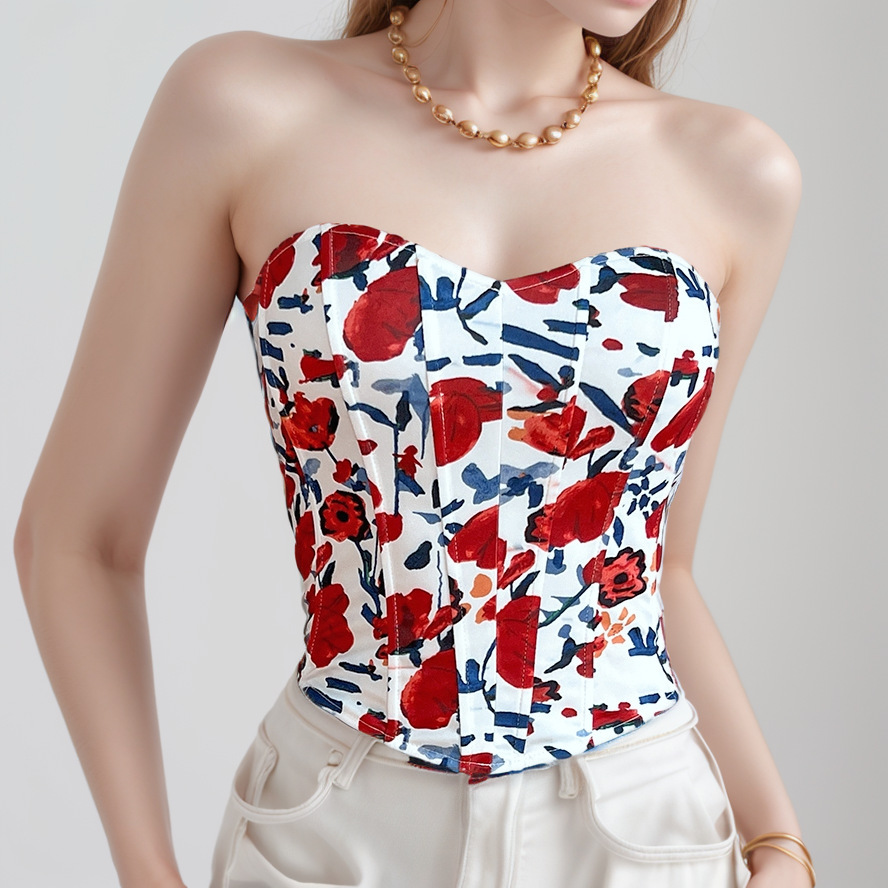유럽 및 미국 해외직구 섹시 브라 핫걸 V넥 백리스 프린트 튜브탑 슬림핏 피쉬본 웨이스트 조임 조끼