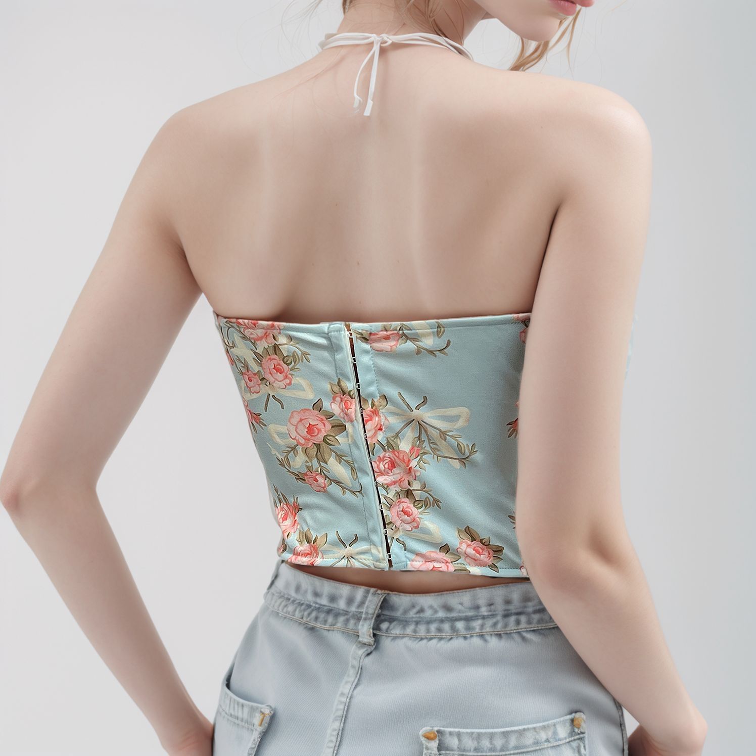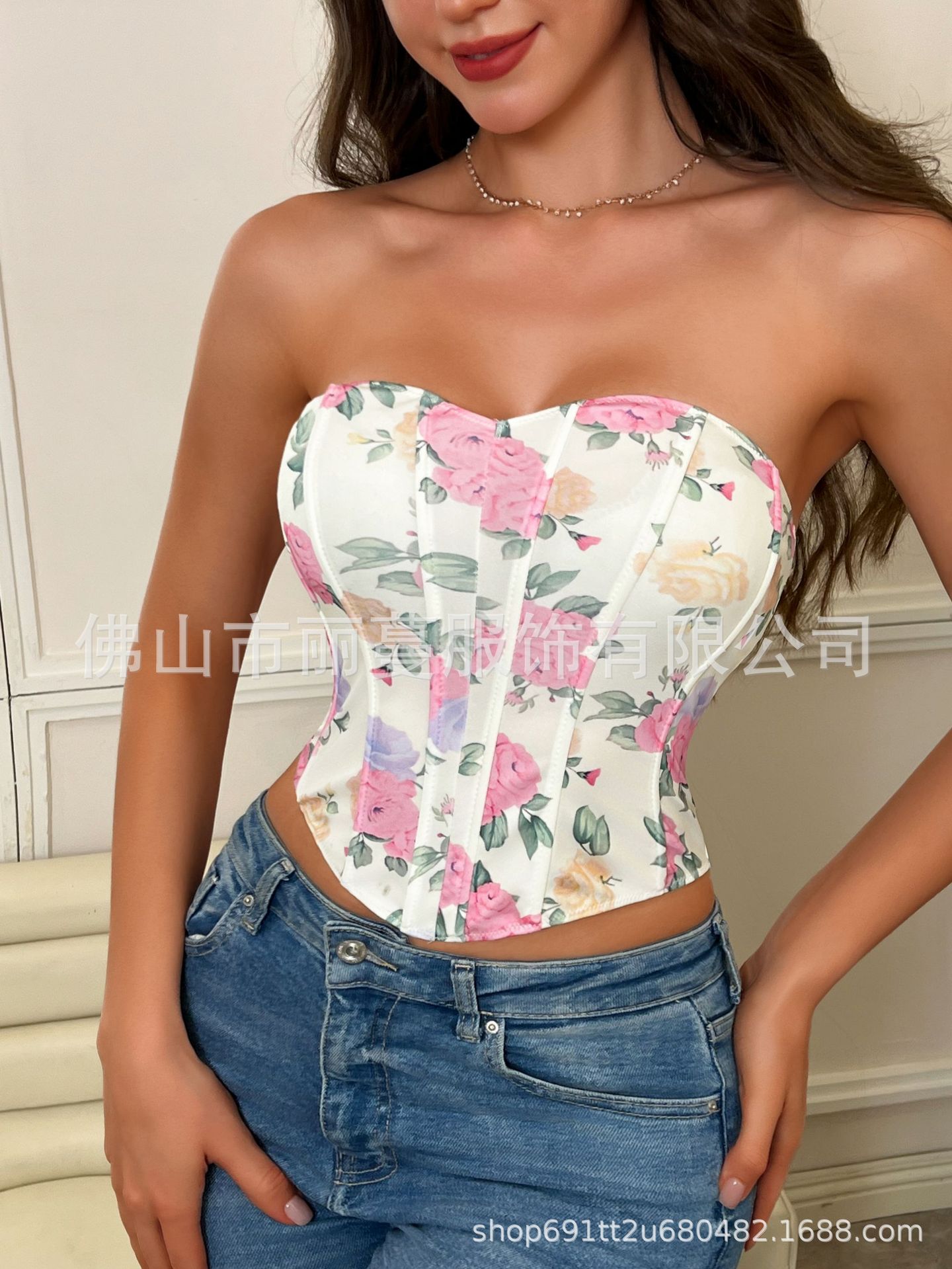 유럽 및 미국 해외직구 섹시 브라 핫걸 V넥 백리스 프린트 튜브탑 슬림핏 피쉬본 웨이스트 조임 조끼스토어 가기