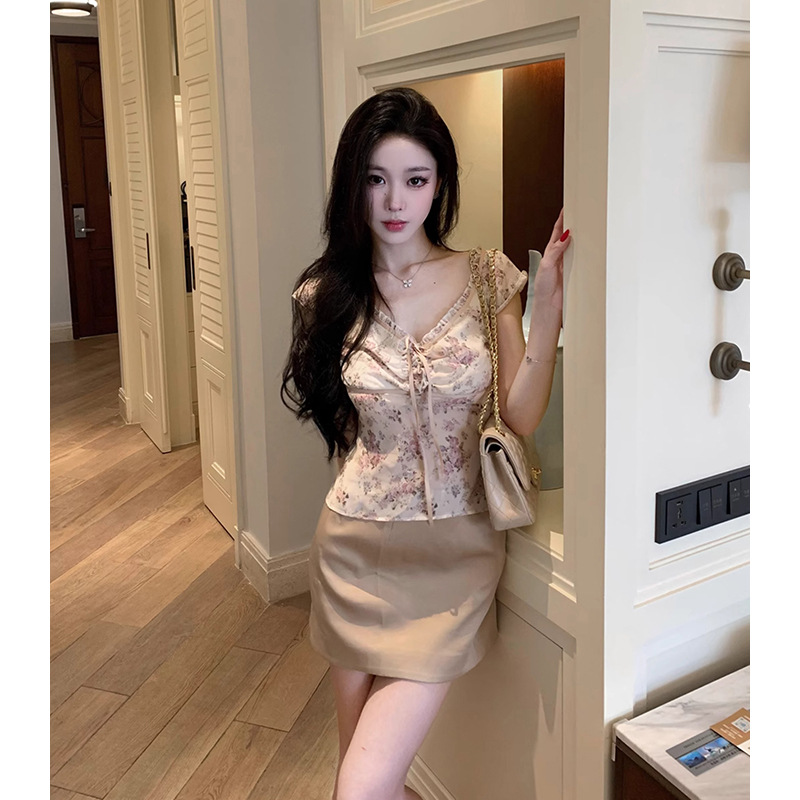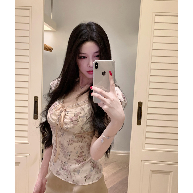 TZ3877 프랑스 사교계 V넥 플로럴 레이스 업 반팔 티셔츠 여성용 여름 하이 엔드 슬림 핏 세련된 탑스토어 가기