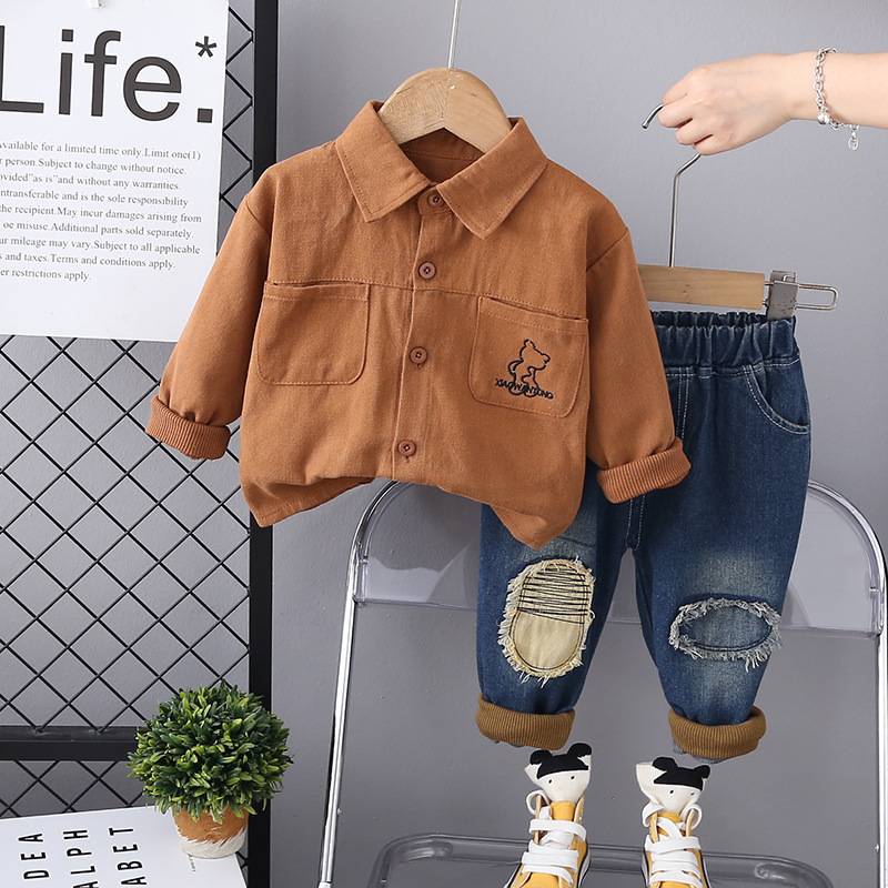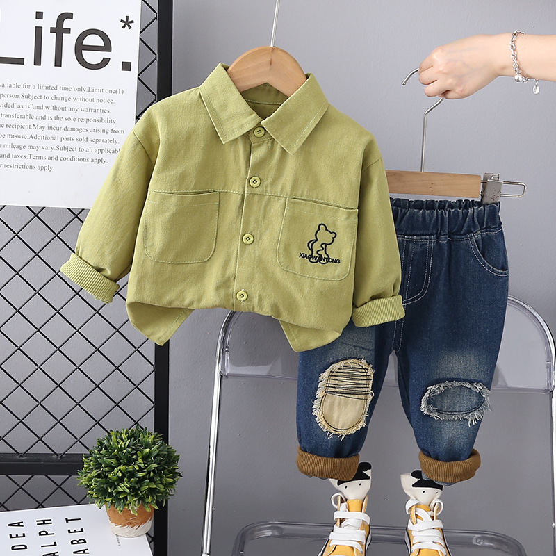 소년의 유행 올 매치 데님 바지 가을 새로운 긴 소매 셔츠 어린이 의류 어린이 새로운 캐주얼 셔츠 세트스토어 가기