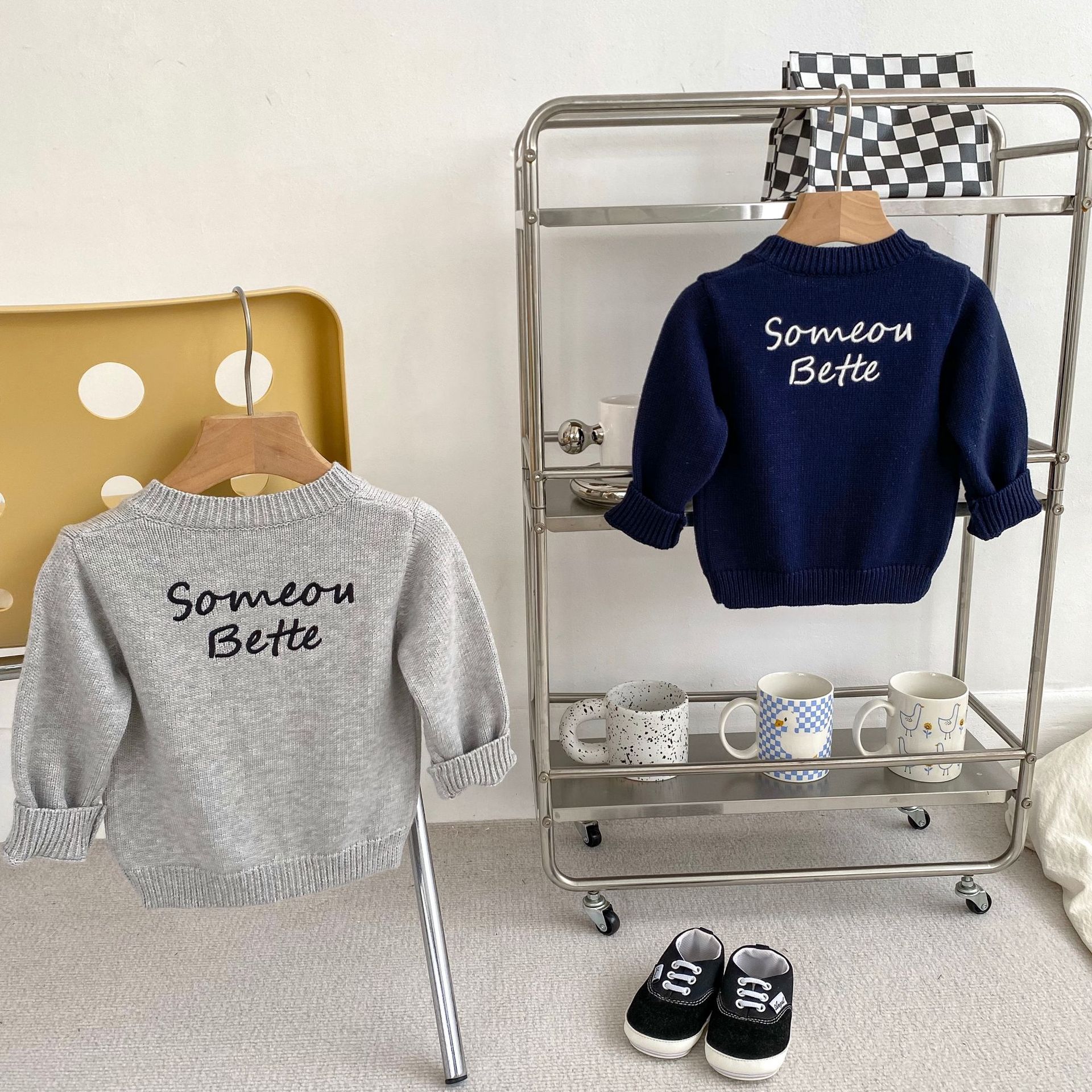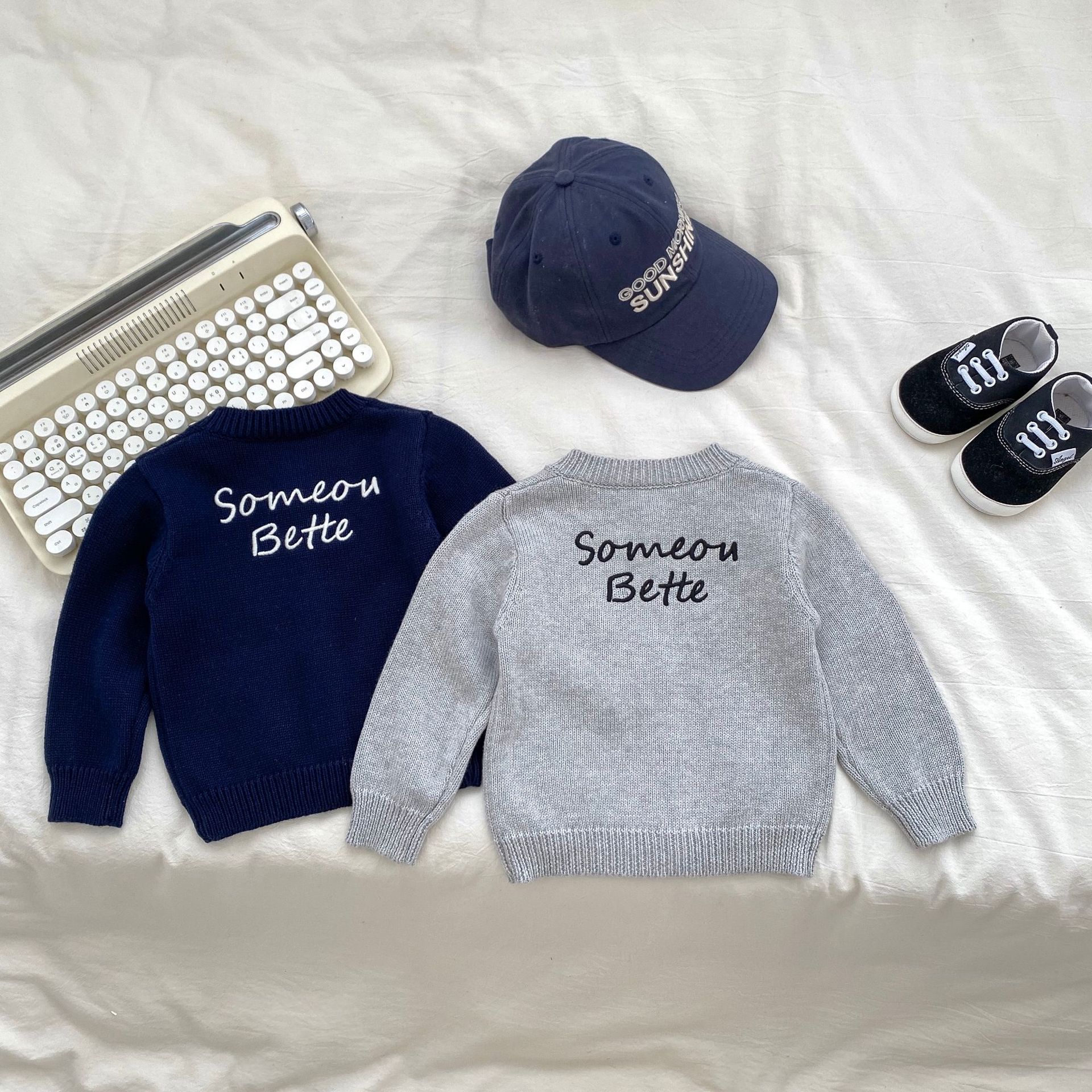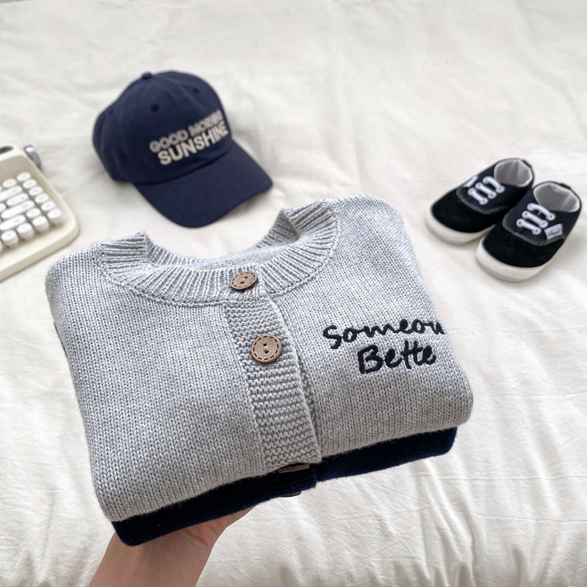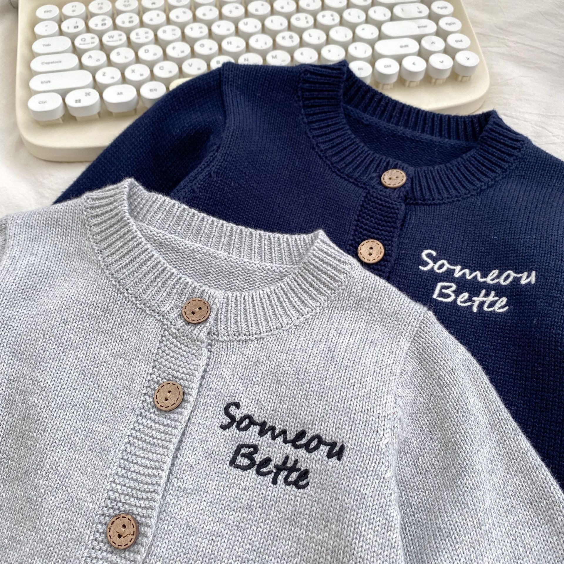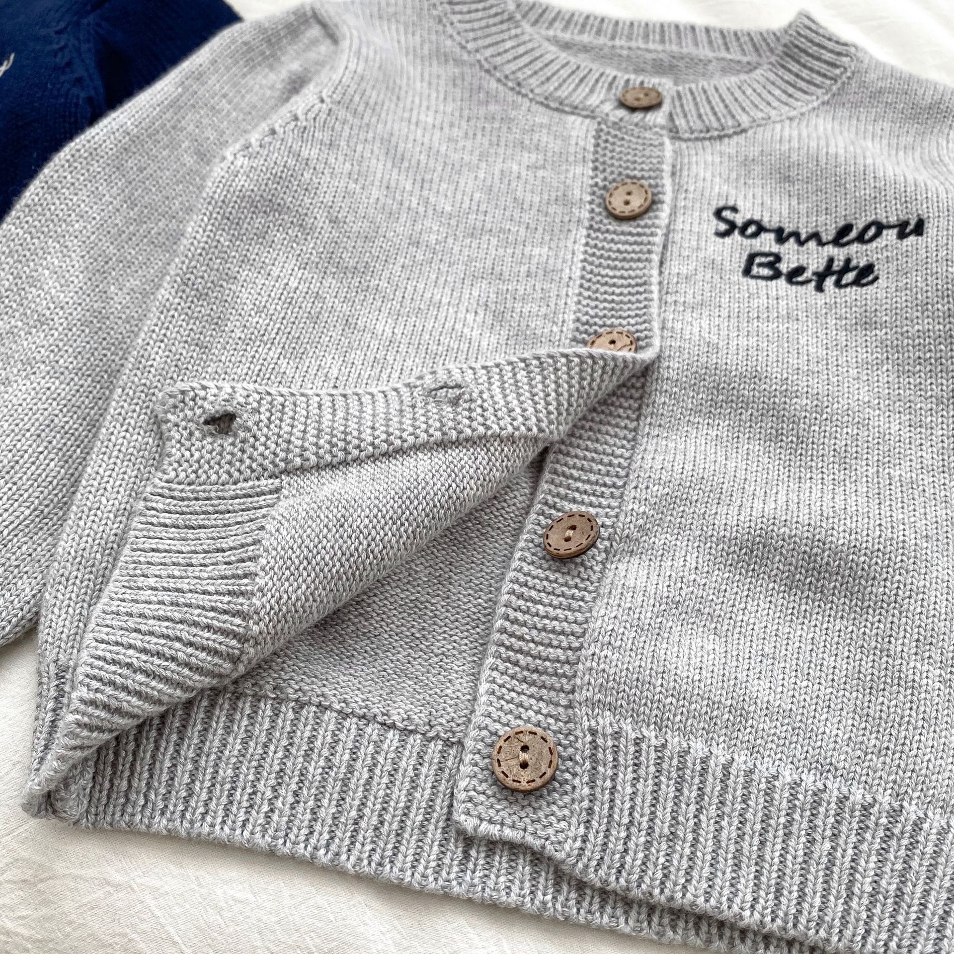 2024 소년 가을 새 아기 긴 소매 수제 편지 자수 카디건 니트 탑 의상 3 피스 세트스토어 가기