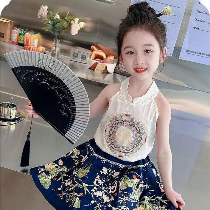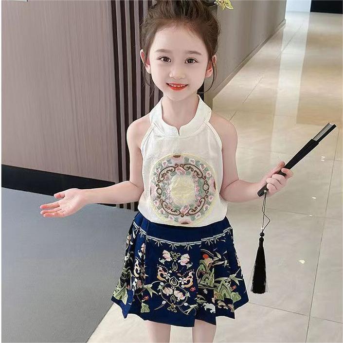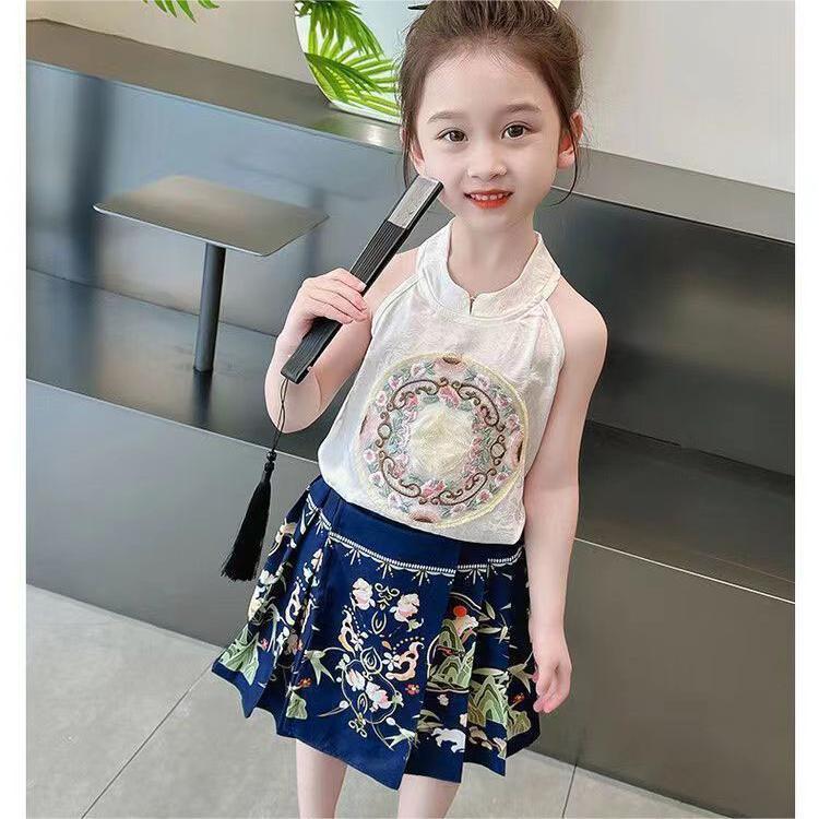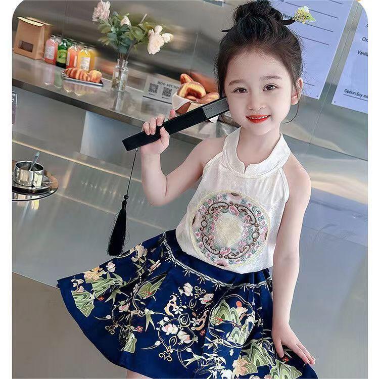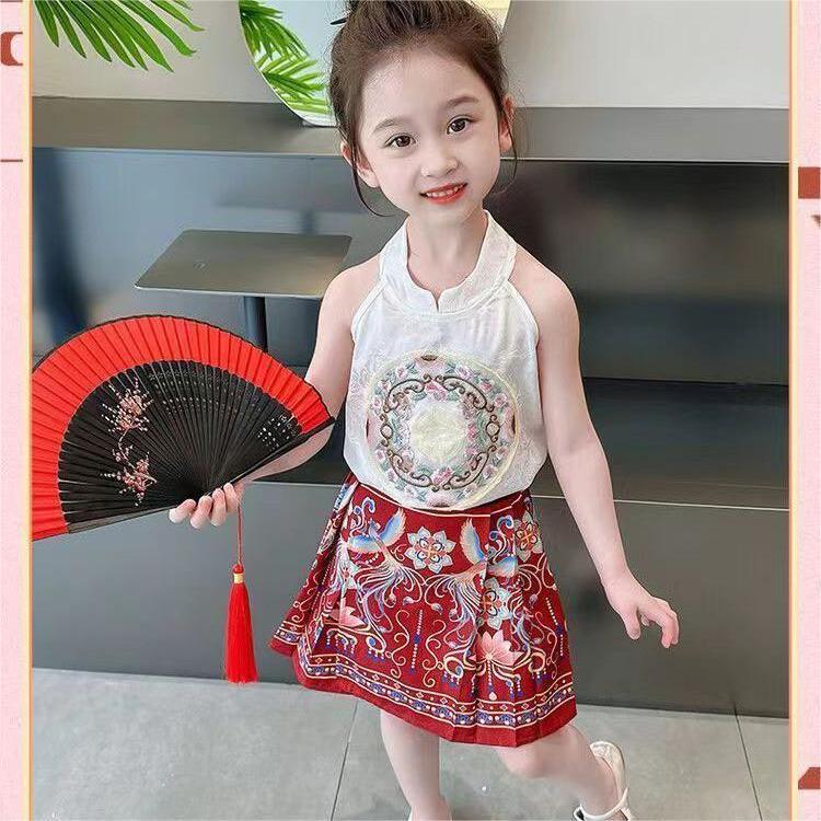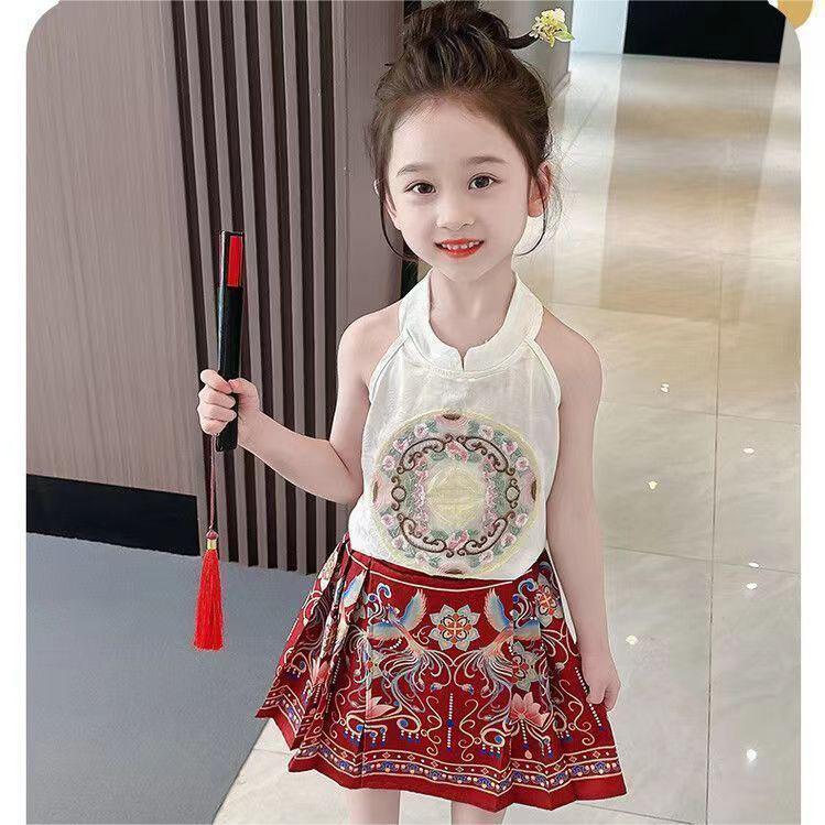 새로운 249 여자 세트 말 국수 어린이 아기 명나라 스타일 한푸 여름 얇은 투피스 세트 말 국수 짧은 원피스