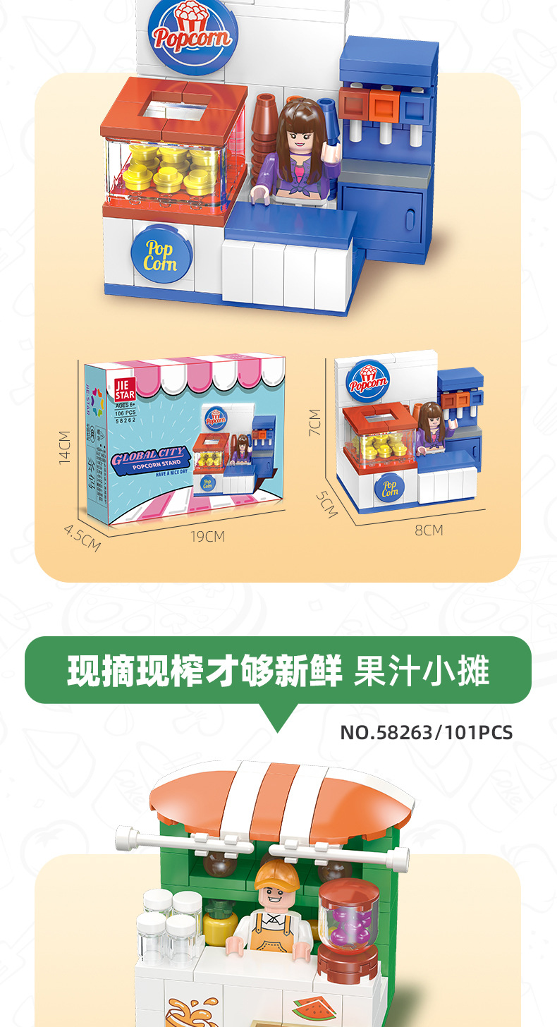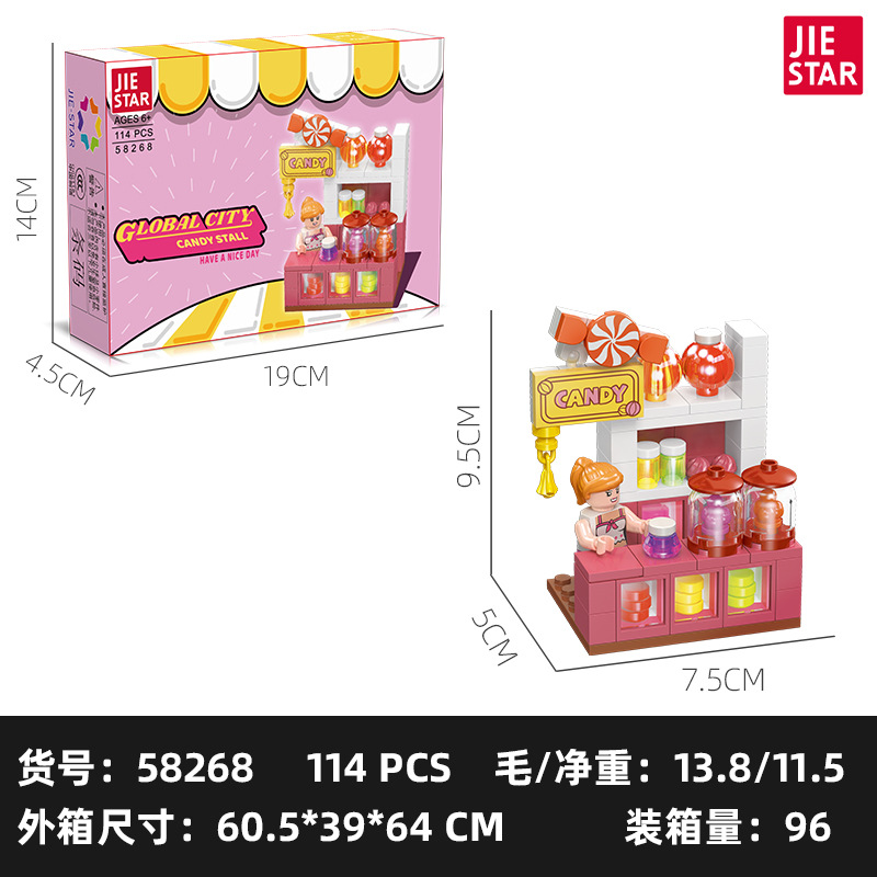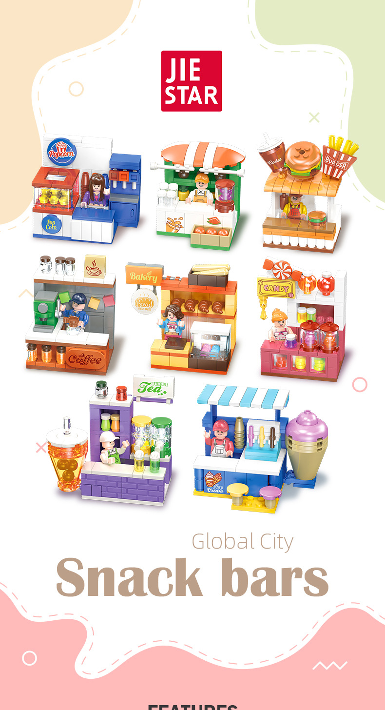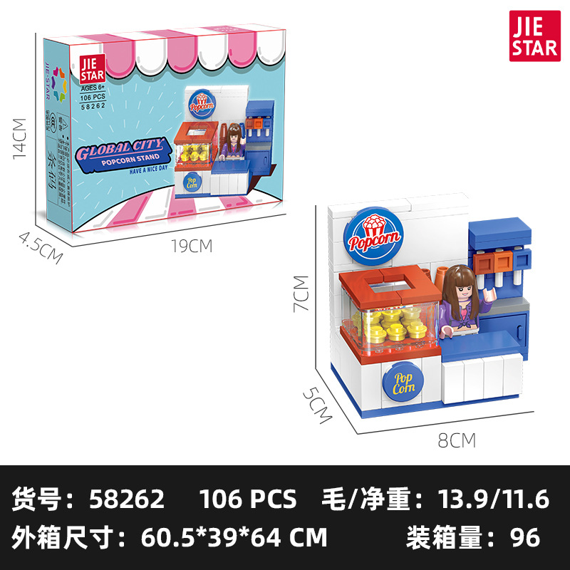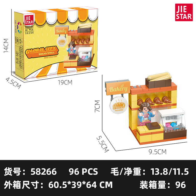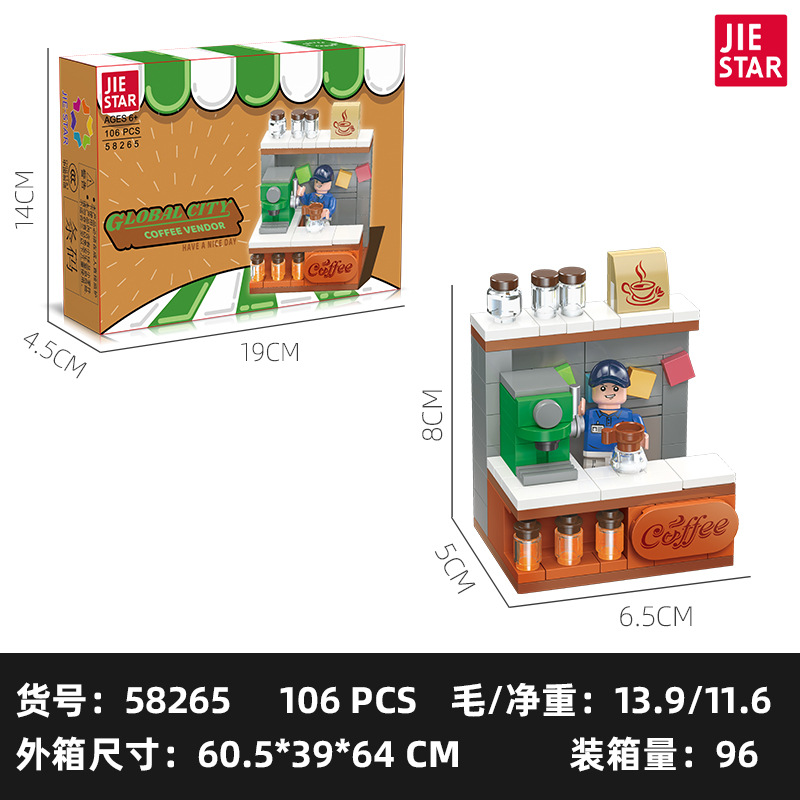 유치원 교육 지원 Jiexing 58268 플라스틱 작은 입자 DIY 조립 거리 장면 빌딩 블록 스낵 거리 장면 모델스토어 가기