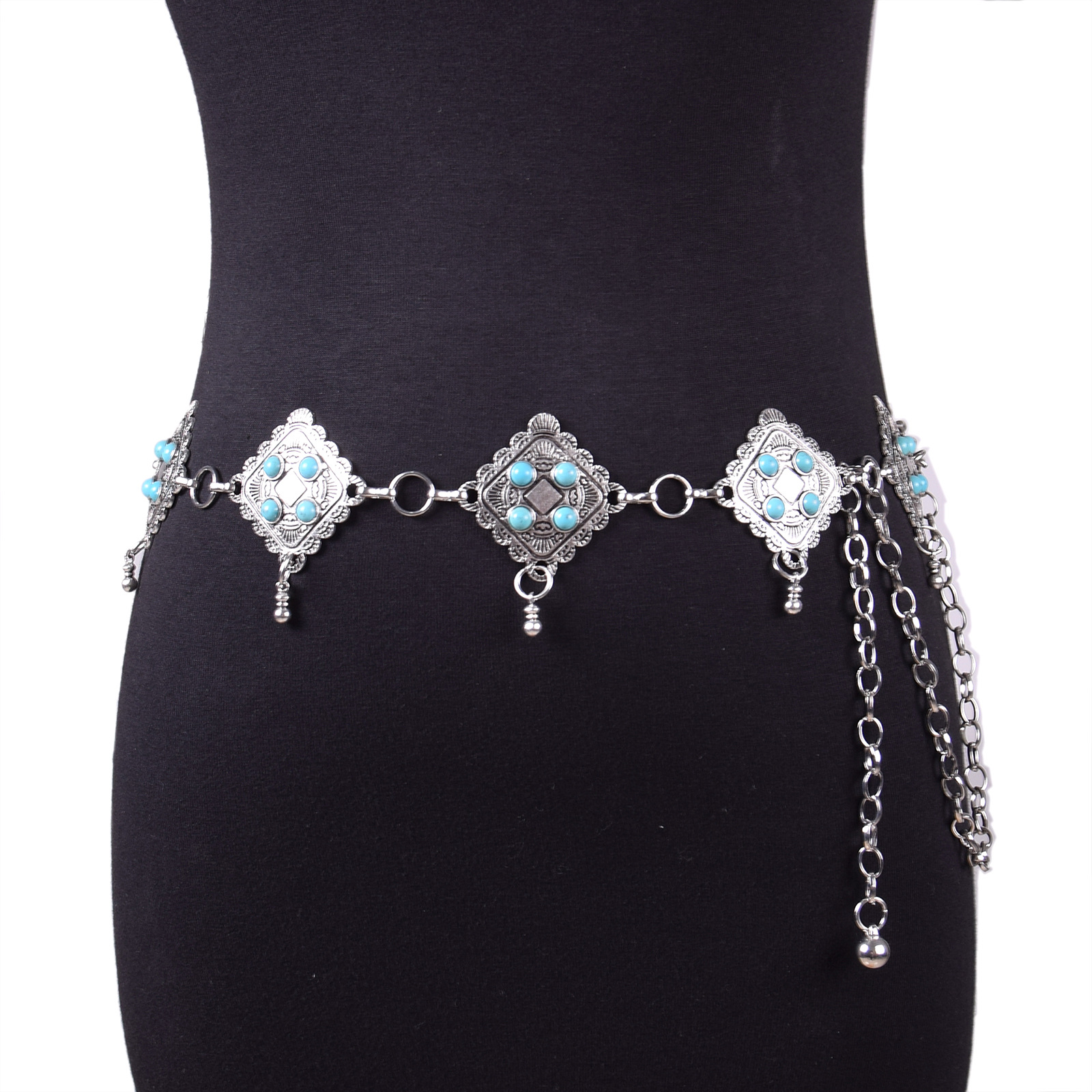 여름 새로운 여성 벨트 패션 레트로 스타일 마노 스톤 상감 금속 펜던트 장식 체인 허리 체인 액세서리