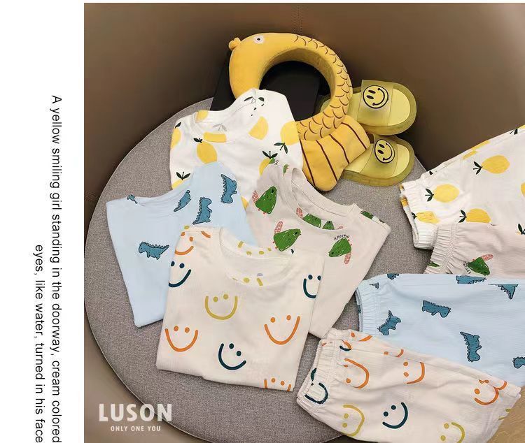 여름 새로운 도착 2024 소년과 소녀의 잠옷 세트 인쇄 된 귀여운 인쇄 된 홈 옷 2 피스 에어컨 의류 트렌디