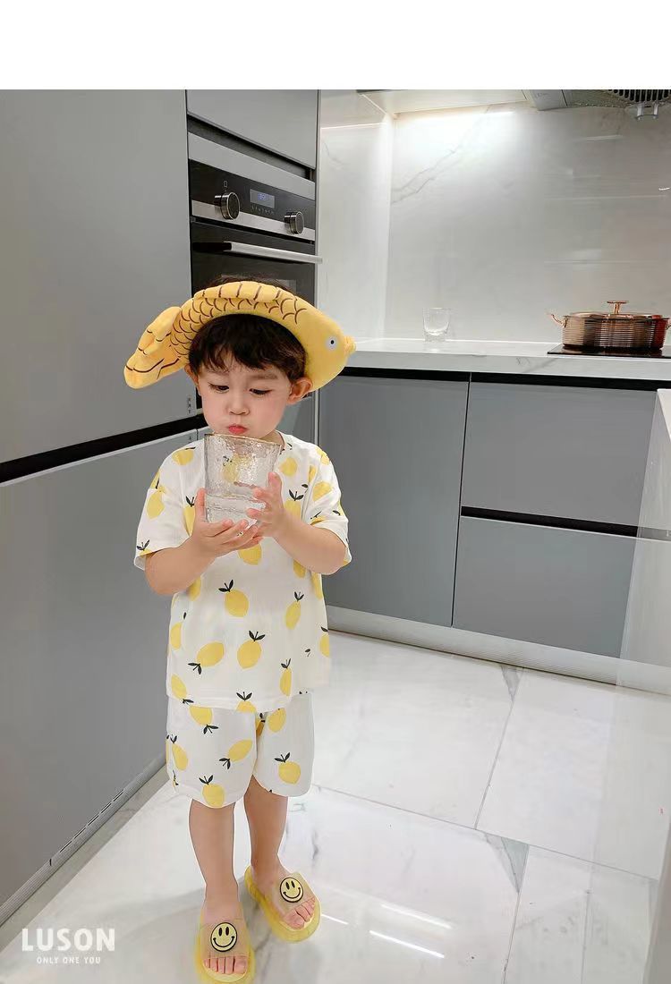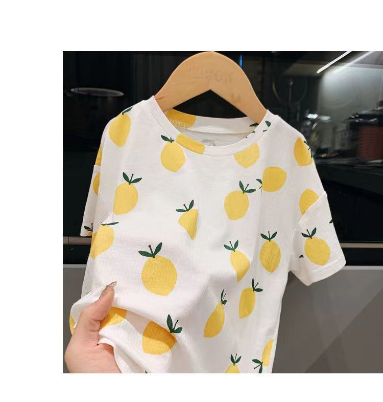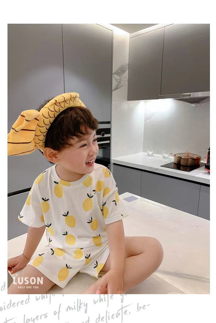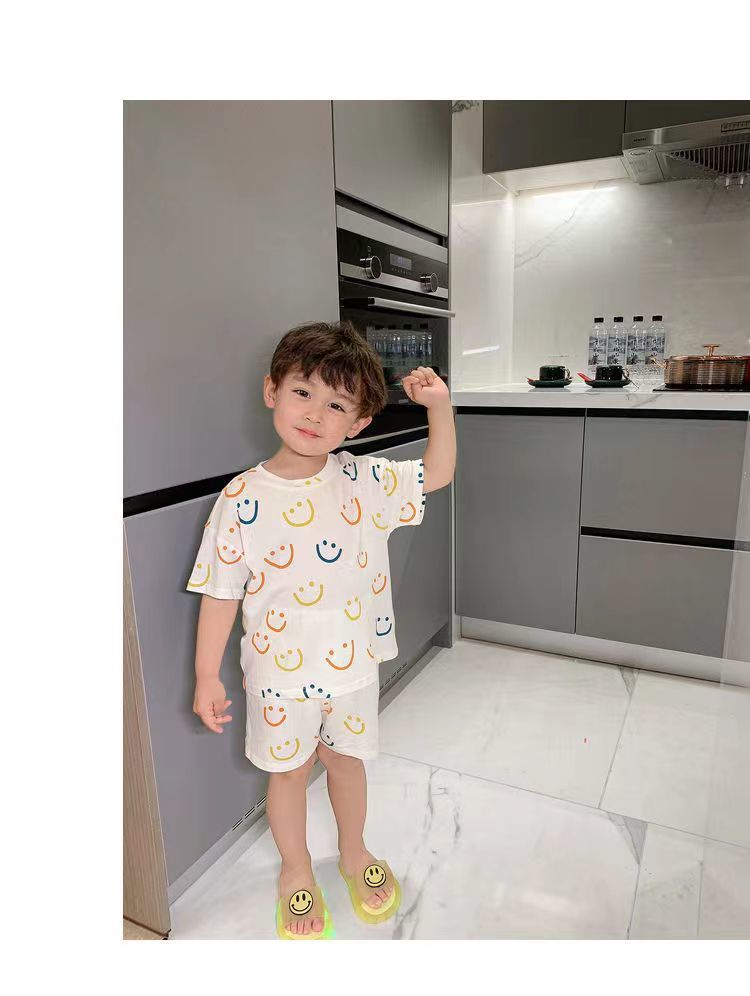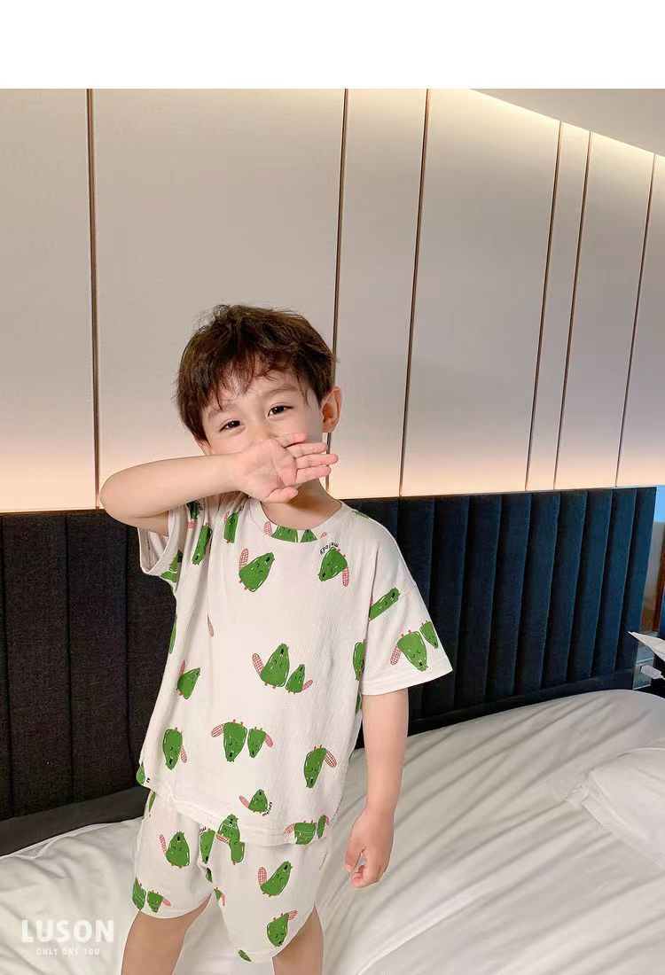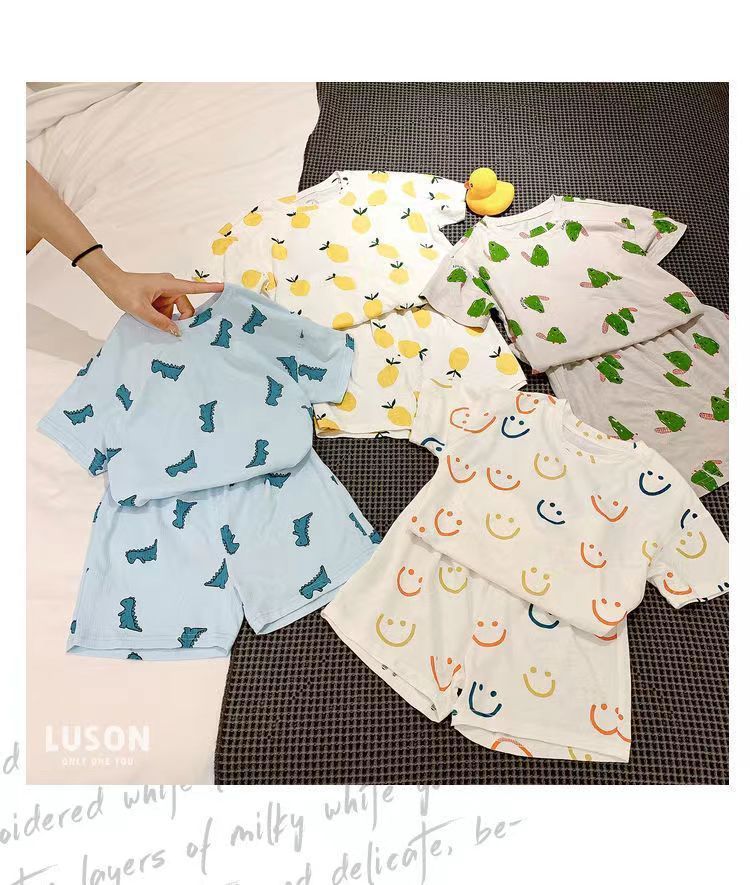 여름 새로운 도착 2024 소년과 소녀의 잠옷 세트 인쇄 된 귀여운 인쇄 된 홈 옷 2 피스 에어컨 의류 트렌디스토어 가기