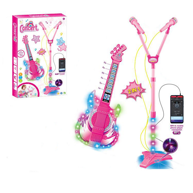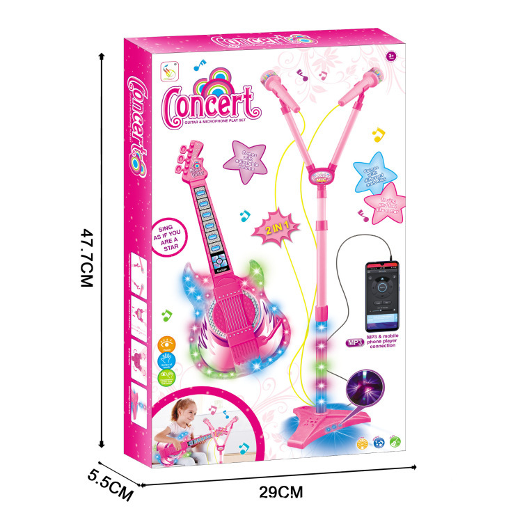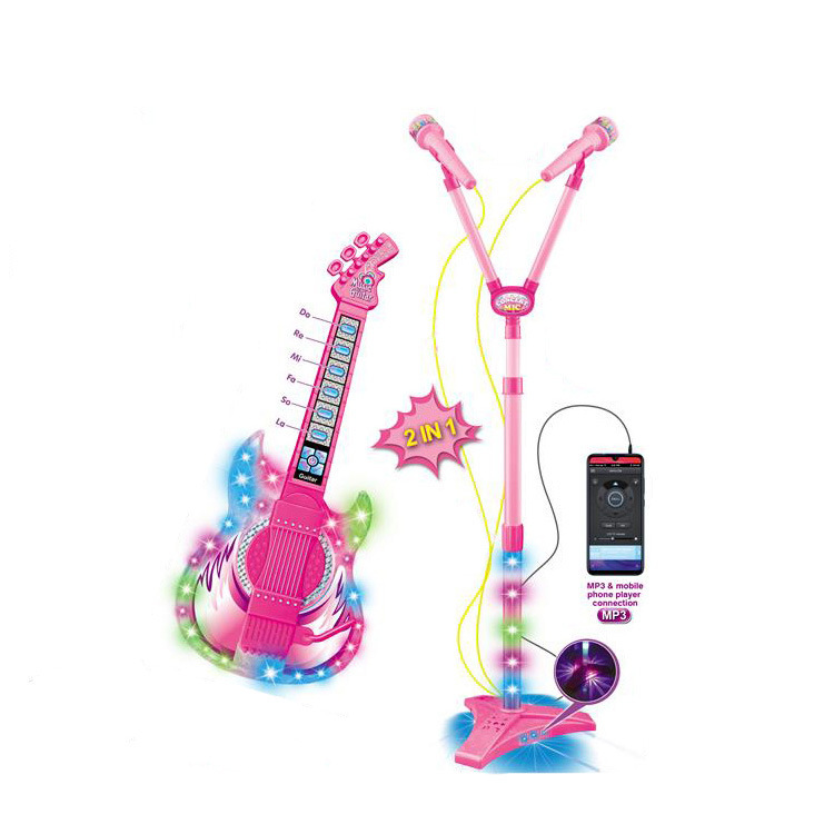 국경 간 핑크 기타 싱글 마이크 2 1 어린이 성능 인터랙티브 게임 다채로운 조명 악기 장난감 도매