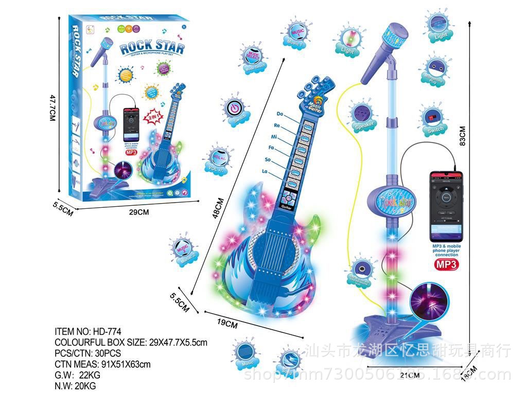 국경 간 핑크 기타 싱글 마이크 2 1 어린이 성능 인터랙티브 게임 다채로운 조명 악기 장난감 도매스토어 가기