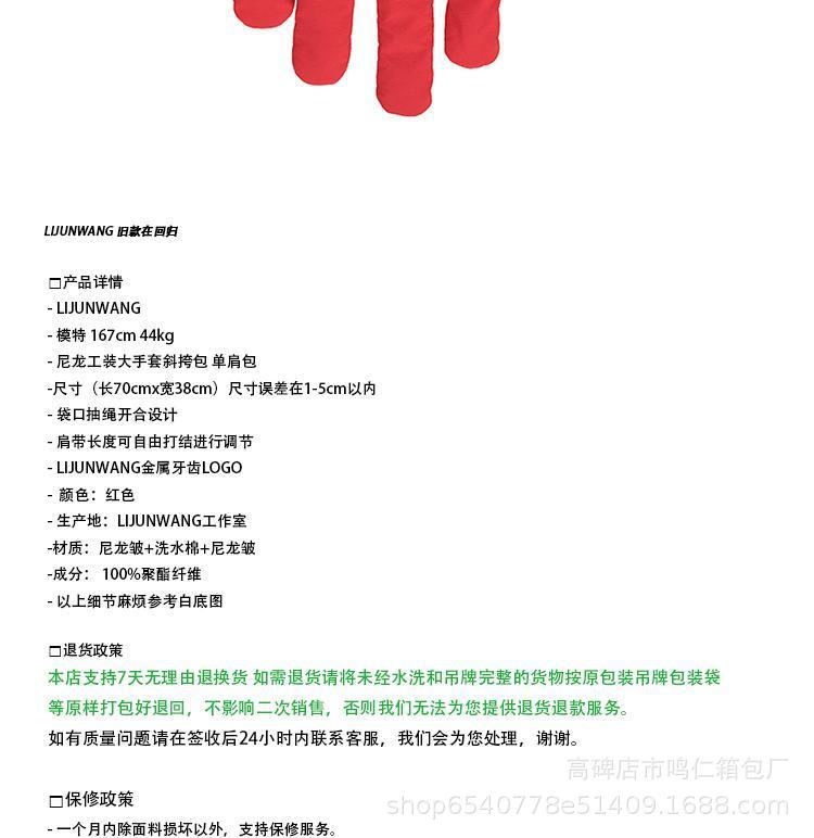 LIJUNWANG Old Reprint Red Nylon 툴링 대형 장갑 크로스 바디 백 숄더 백 토트 백