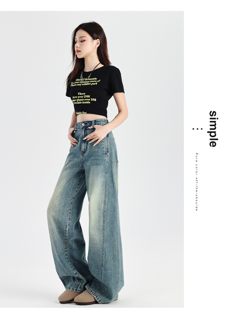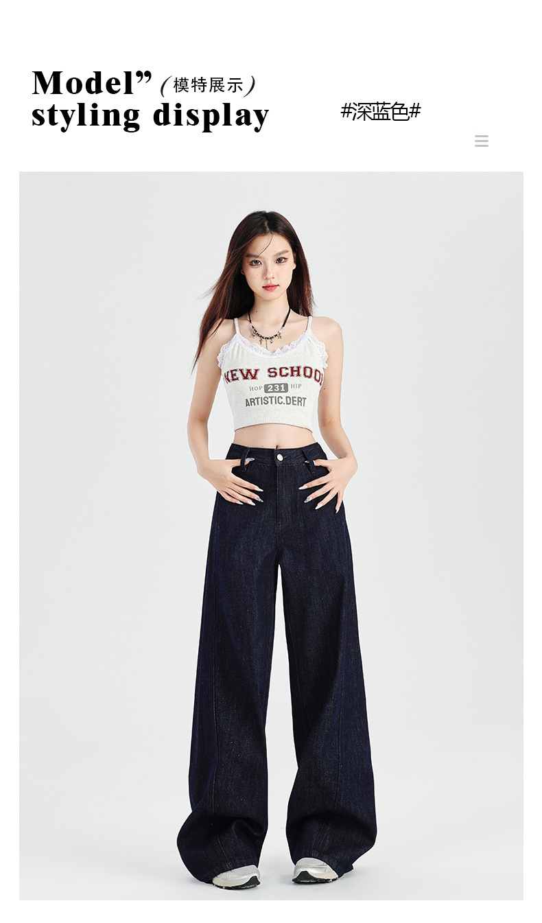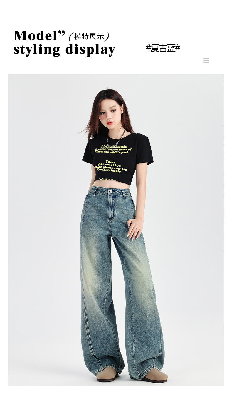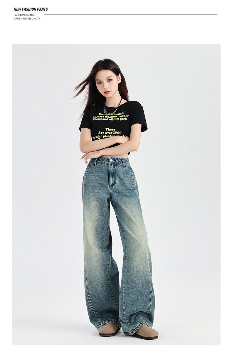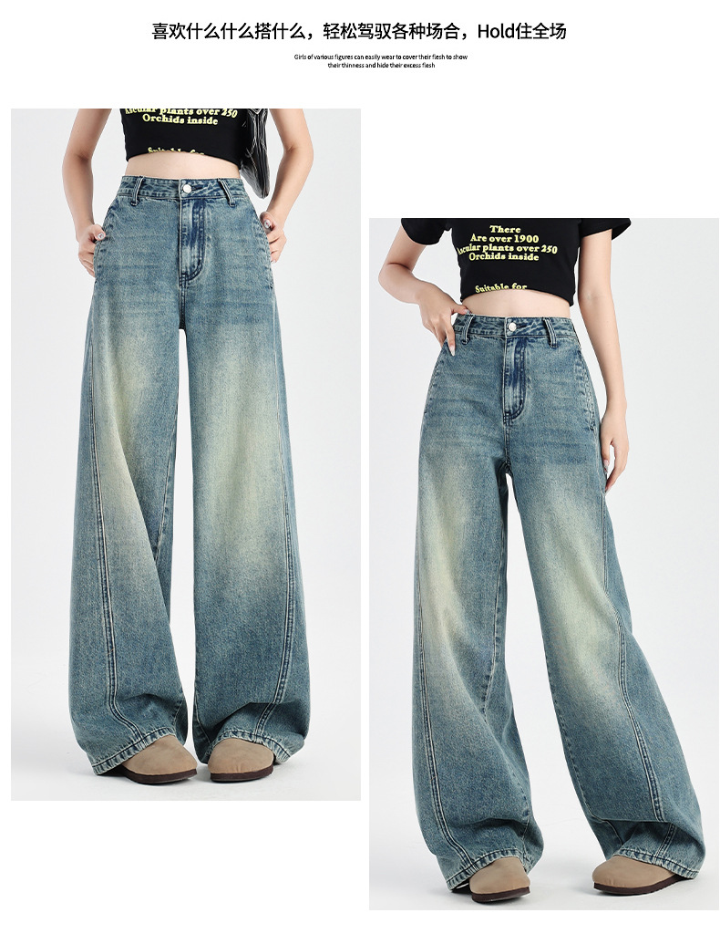 [안티 페이딩 데님 패브릭] 레트로 시미 터 스티칭 청바지 여성용 루즈 드 와이드 레그스토어 가기