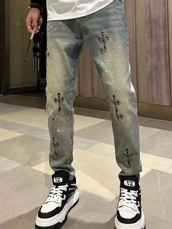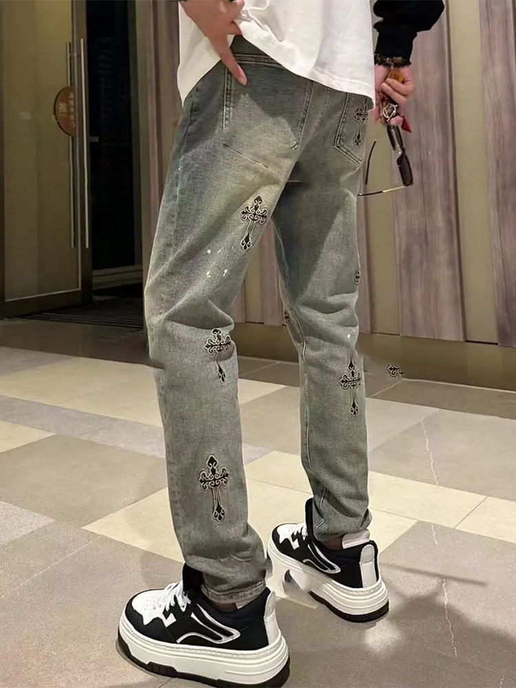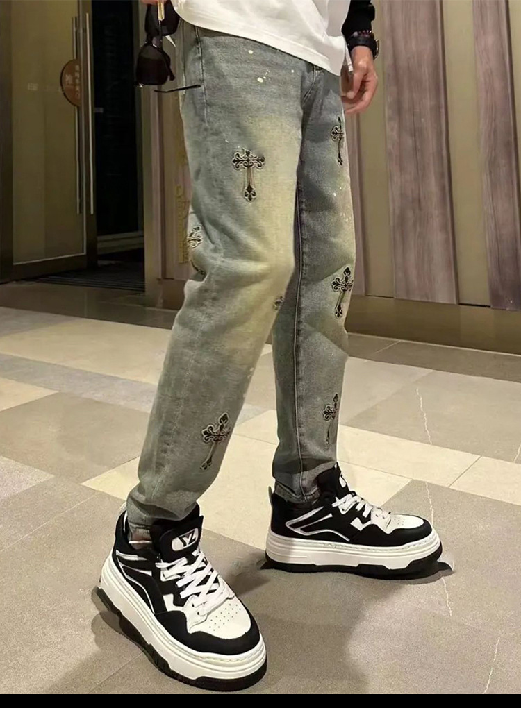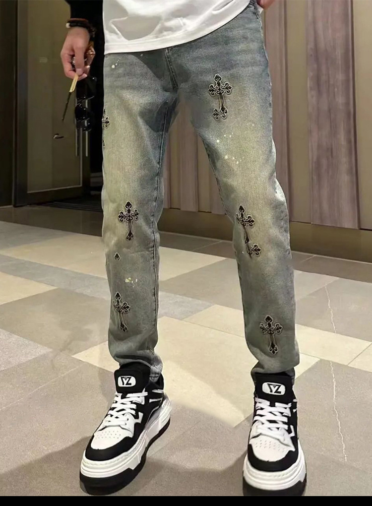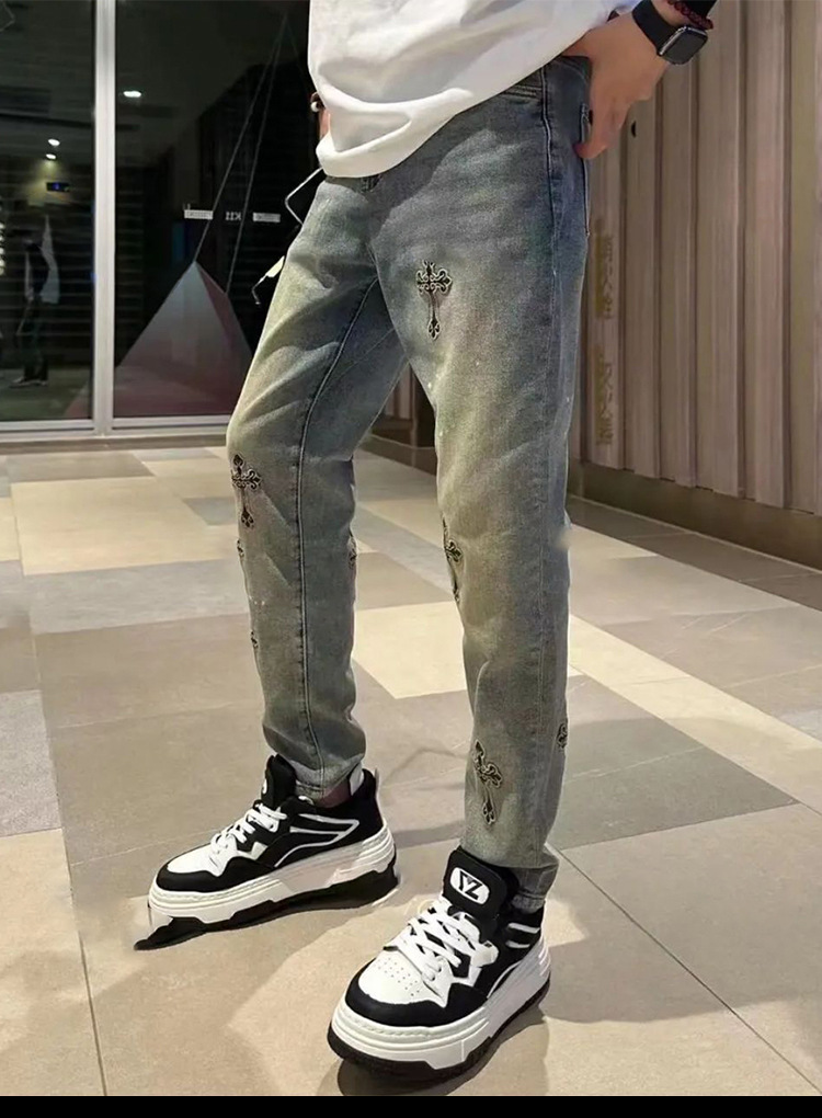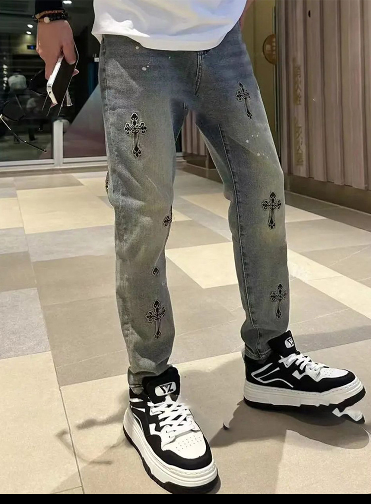 봄과 여름 새로운 작은 스트레이트 청바지 남성용 세련된 세련된 미국 스타일 독특한 크로스 자수 스트레치 자른 바지