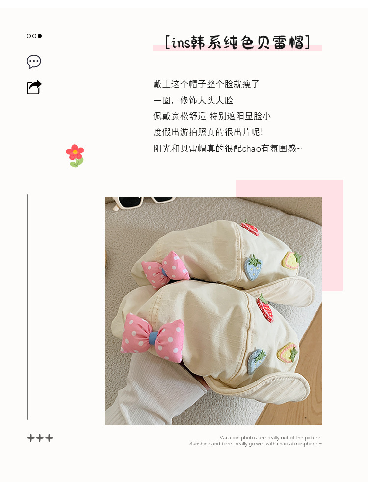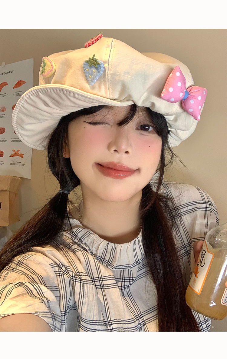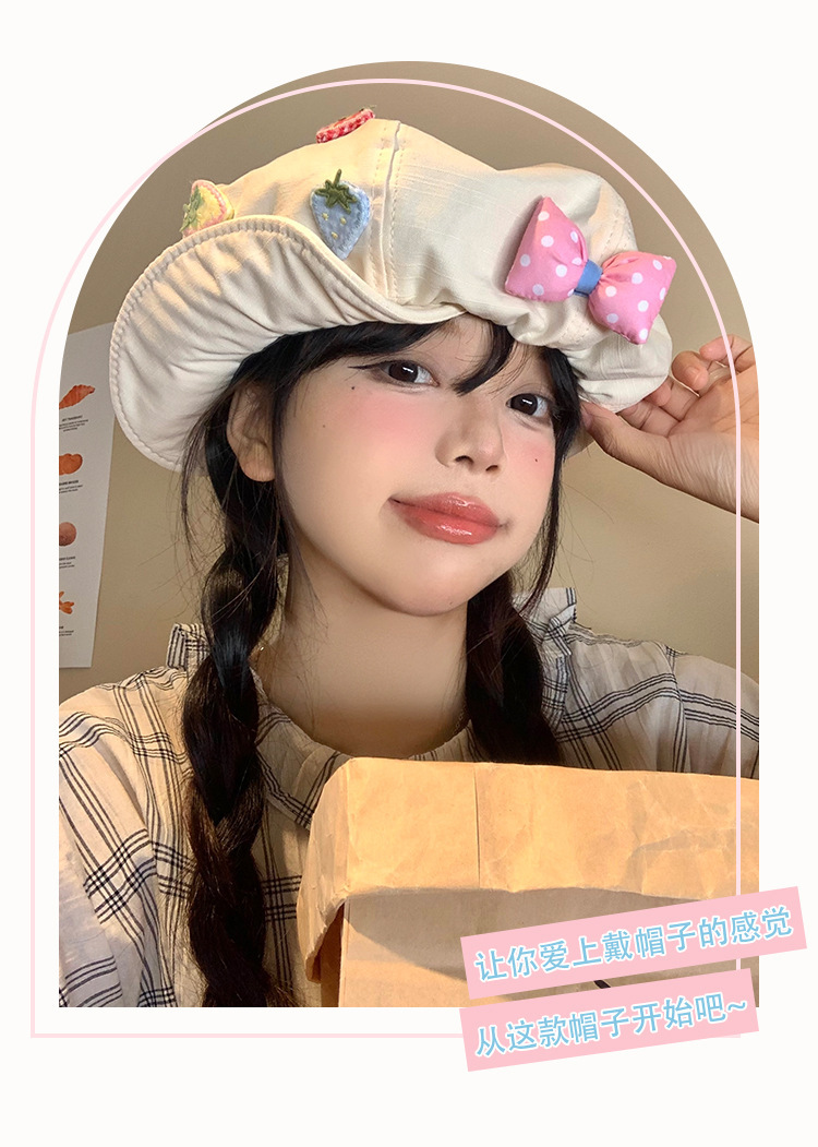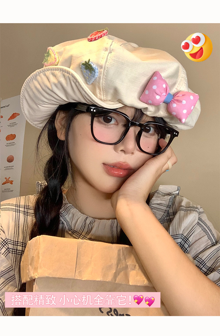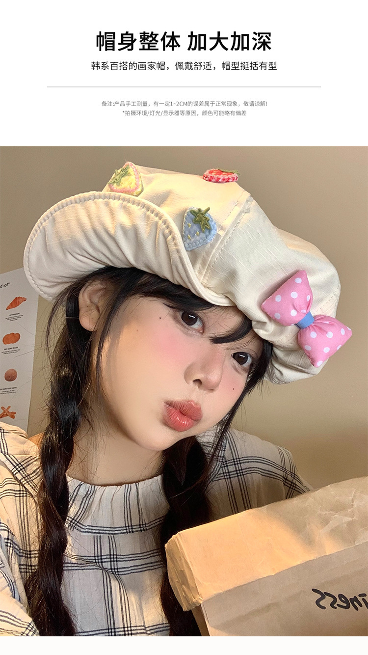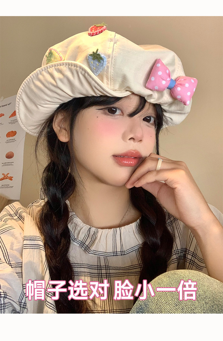 Summer Ins 한국식 딸기 보우 베레 여자 올 매치 빅 헤드 클라우드 캡은 얼굴 작은 화가 모자를 보여줍니다