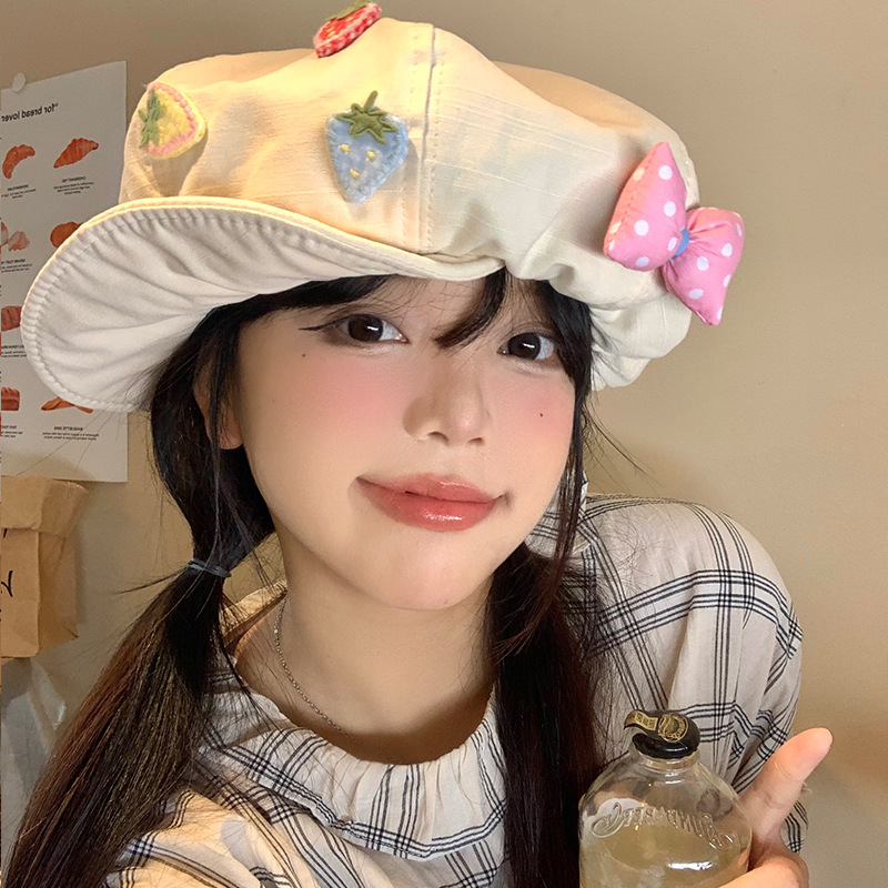 Summer Ins 한국식 딸기 보우 베레 여자 올 매치 빅 헤드 클라우드 캡은 얼굴 작은 화가 모자를 보여줍니다스토어 가기