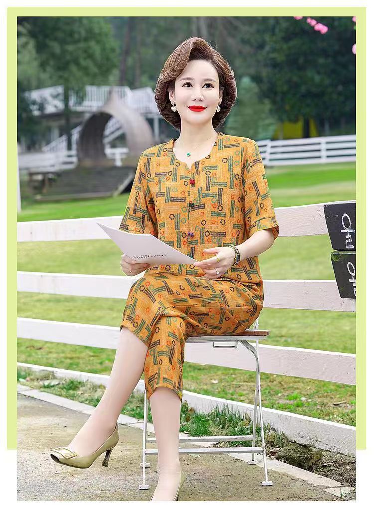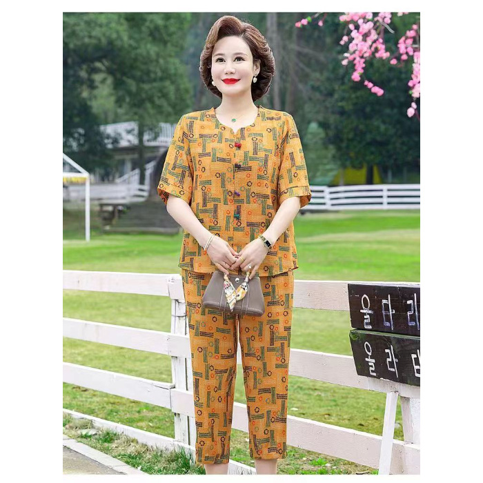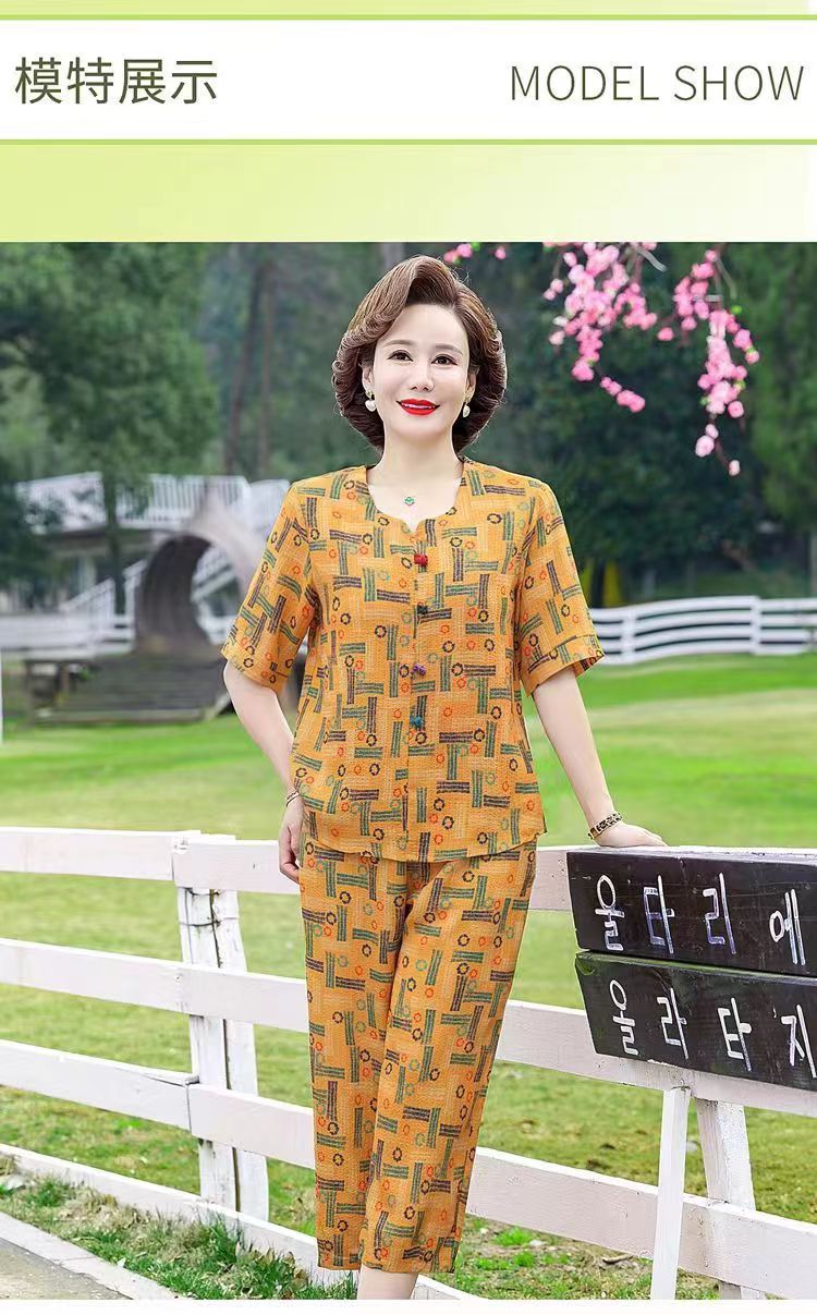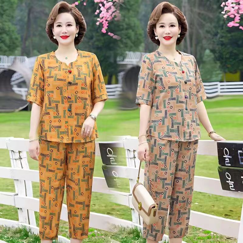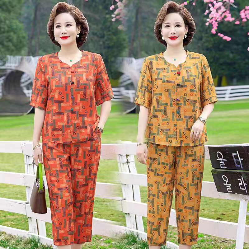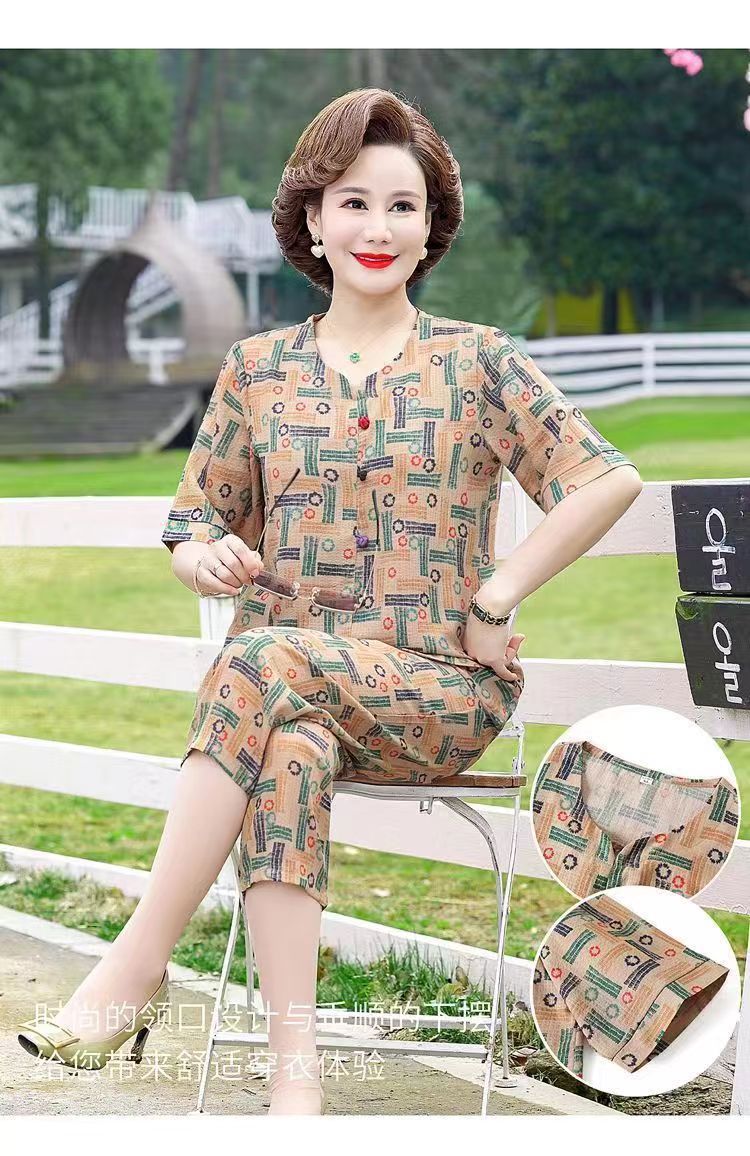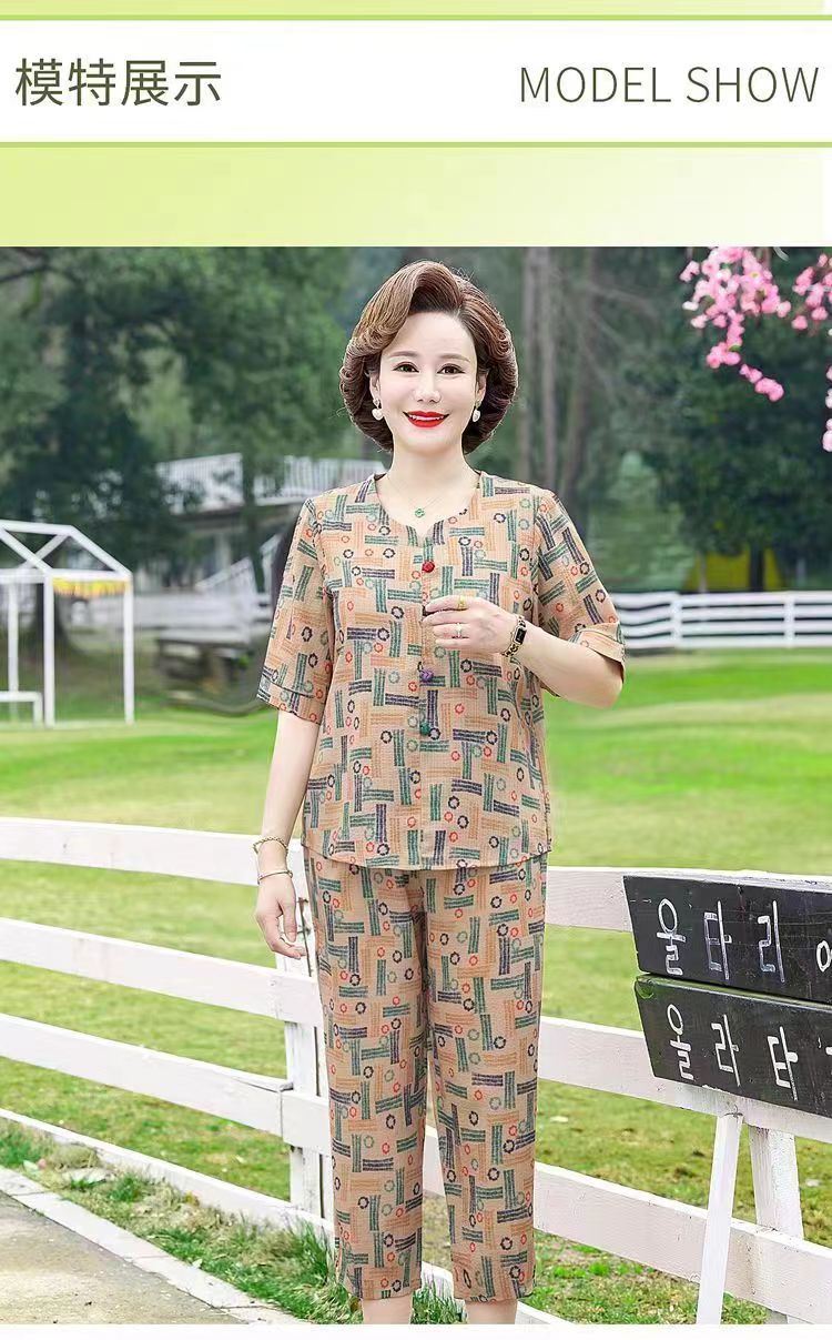 아마존 플러스 사이즈 여름 어머니 옷 중년 및 노인 반팔 세트 티셔츠 서양식 캐주얼 자른 바지 투피스 세트 트렌디스토어 가기