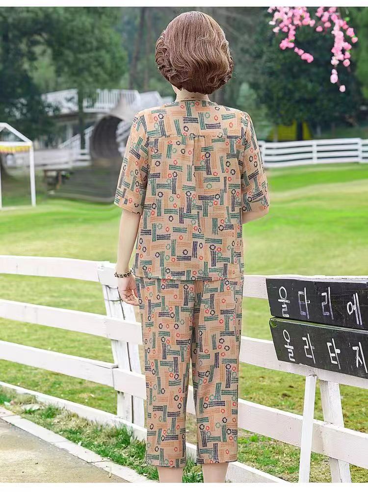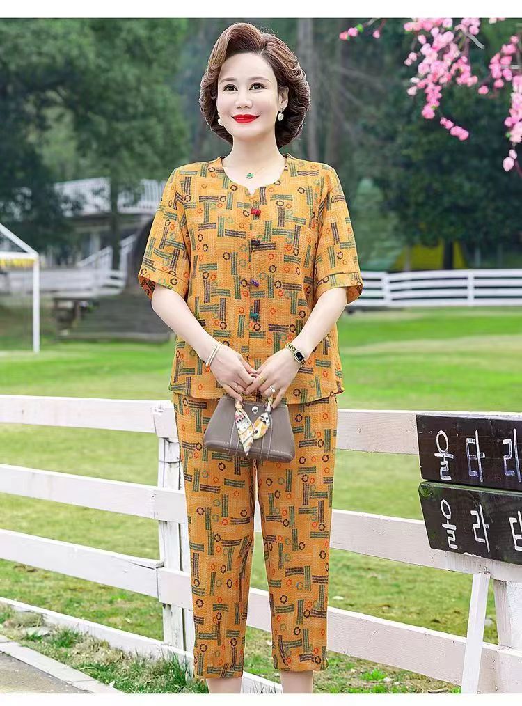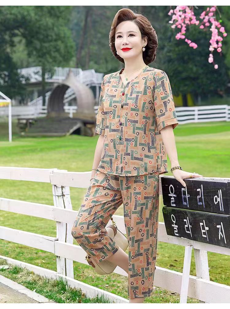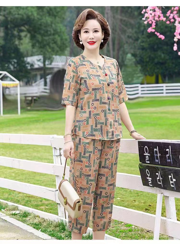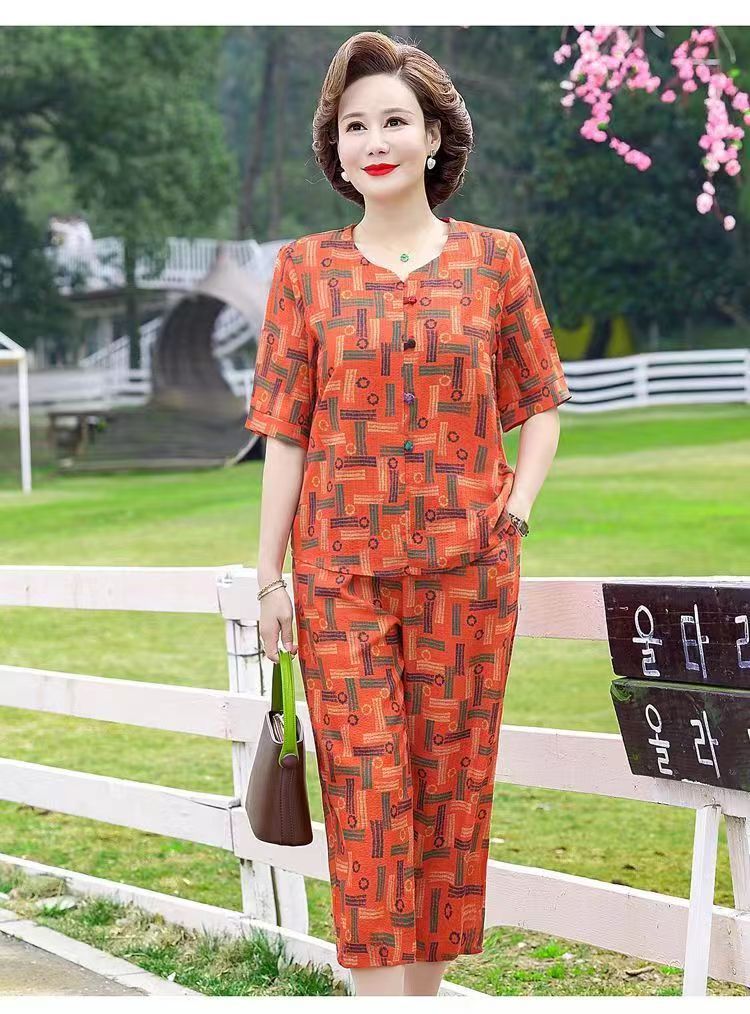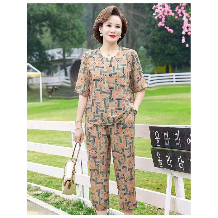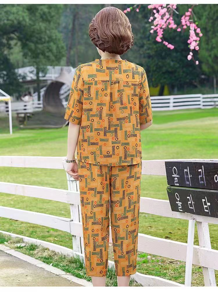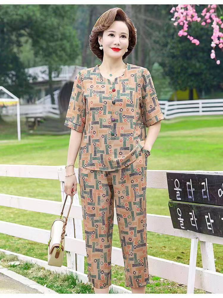 아마존 플러스 사이즈 여름 어머니 옷 중년 및 노인 반팔 세트 티셔츠 서양식 캐주얼 자른 바지 투피스 세트 트렌디스토어 가기