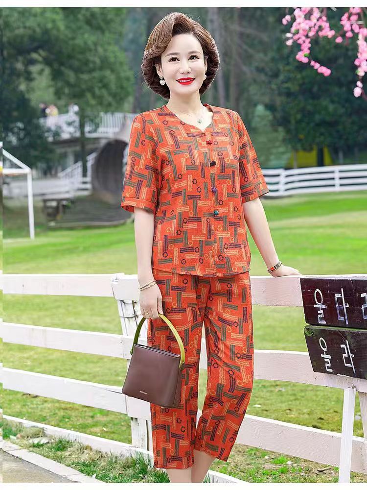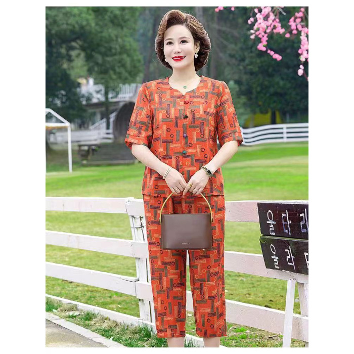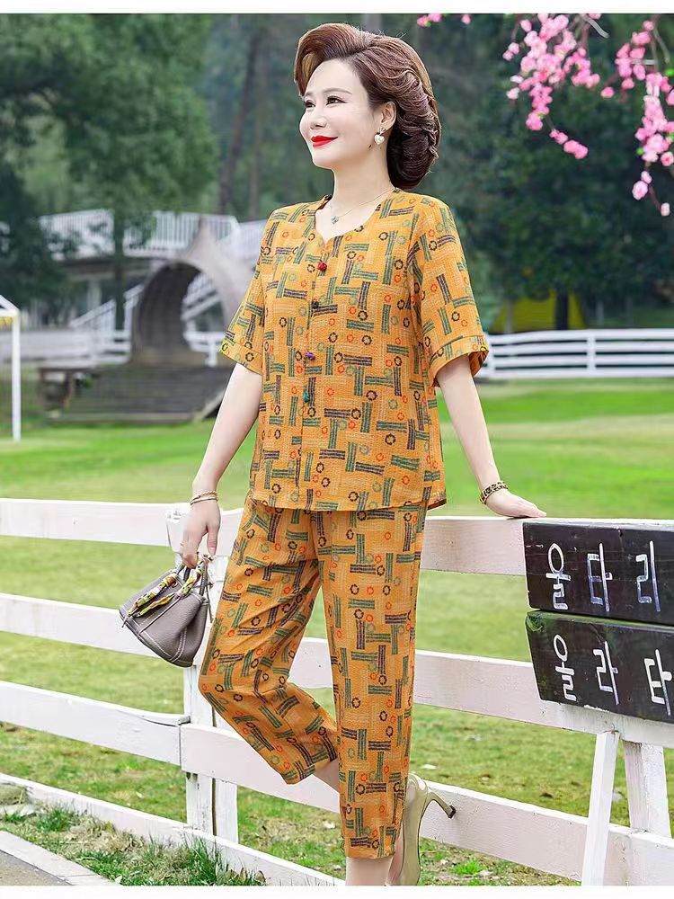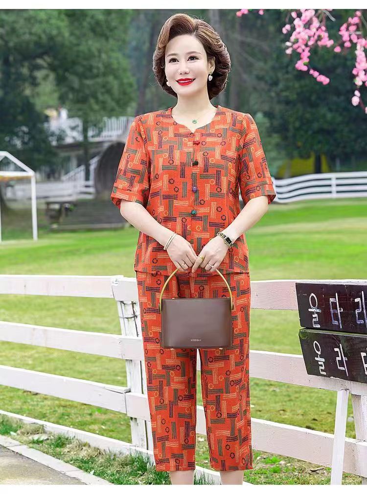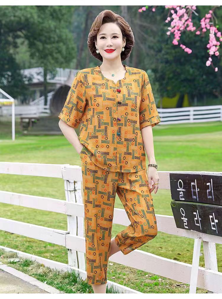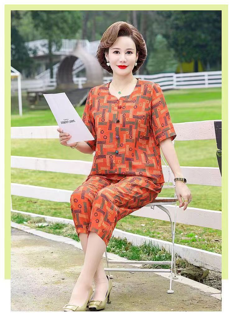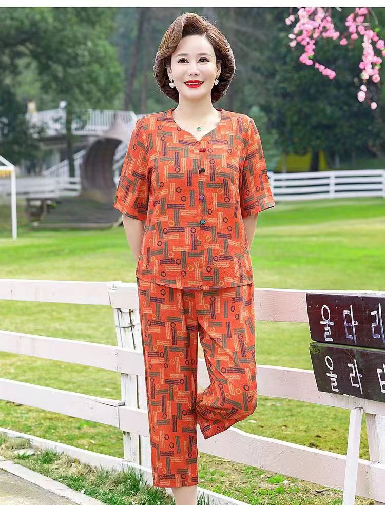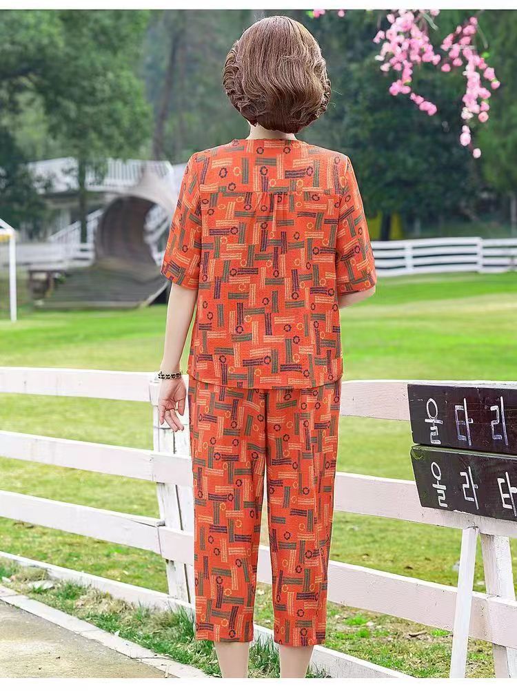 아마존 플러스 사이즈 여름 어머니 옷 중년 및 노인 반팔 세트 티셔츠 서양식 캐주얼 자른 바지 투피스 세트 트렌디스토어 가기