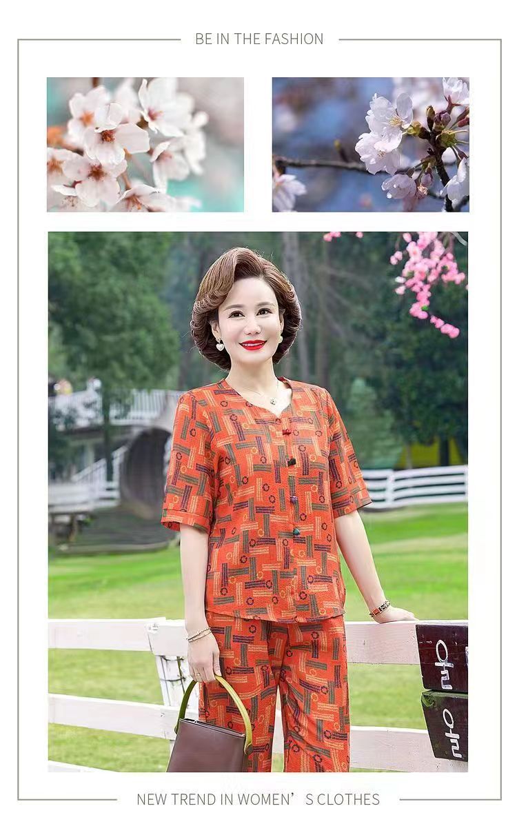 아마존 플러스 사이즈 여름 어머니 옷 중년 및 노인 반팔 세트 티셔츠 서양식 캐주얼 자른 바지 투피스 세트 트렌디