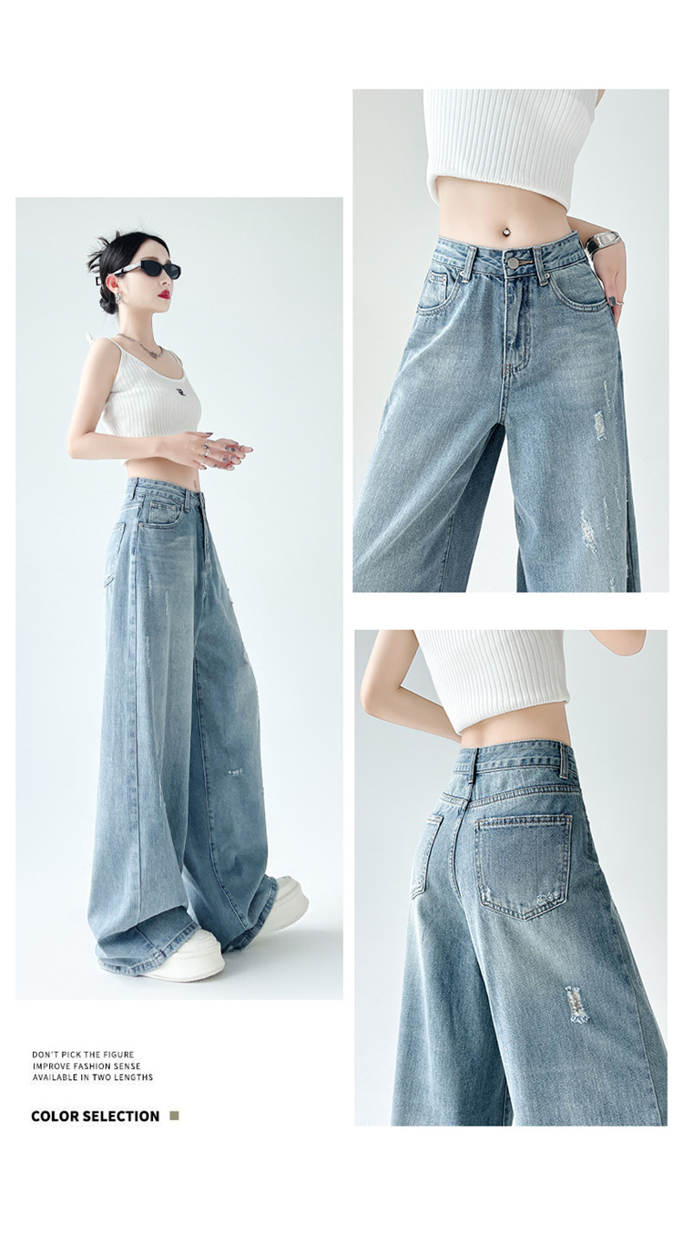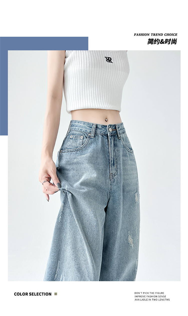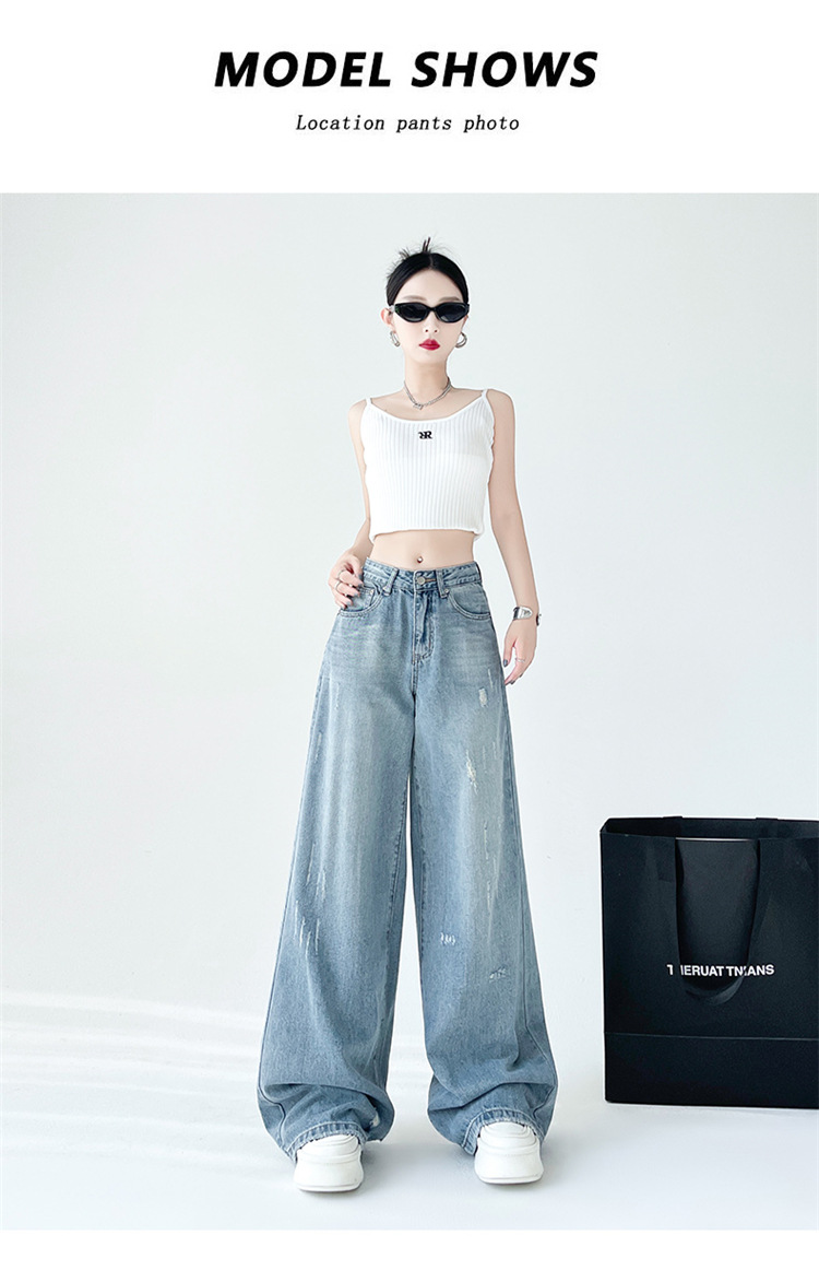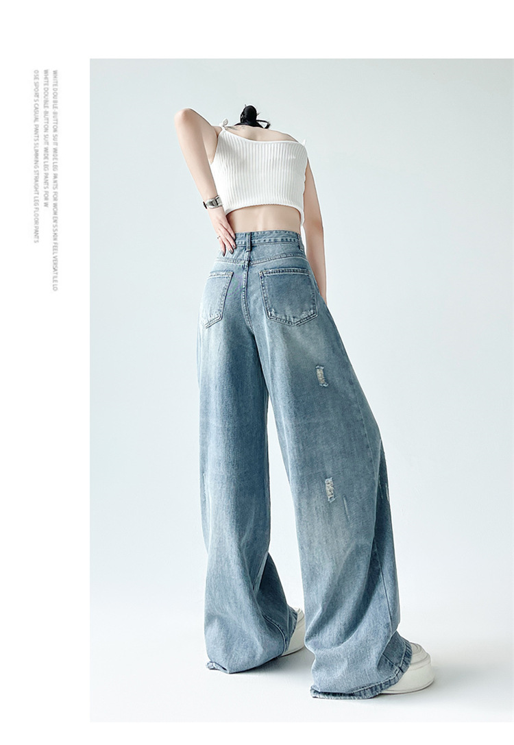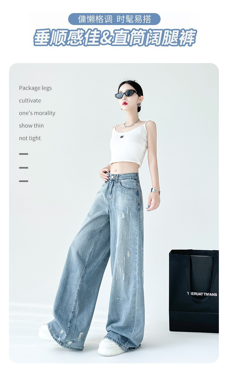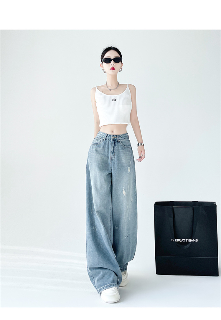[진음] 레트로 세척 스크래치 청바지 여성용 느슨한 높은 허리 슬리밍 스트레이트 레그 와이드 레그 팬츠스토어 가기